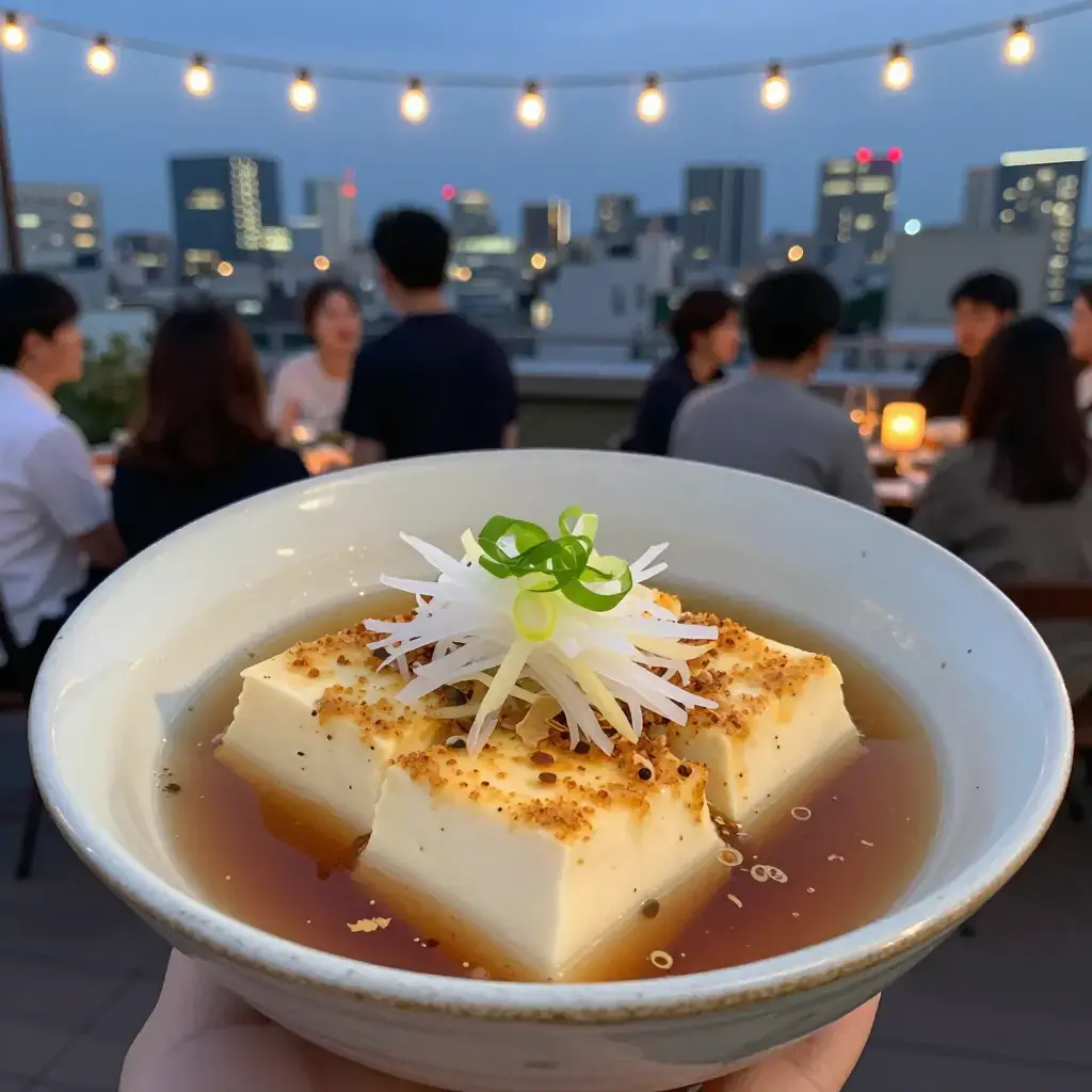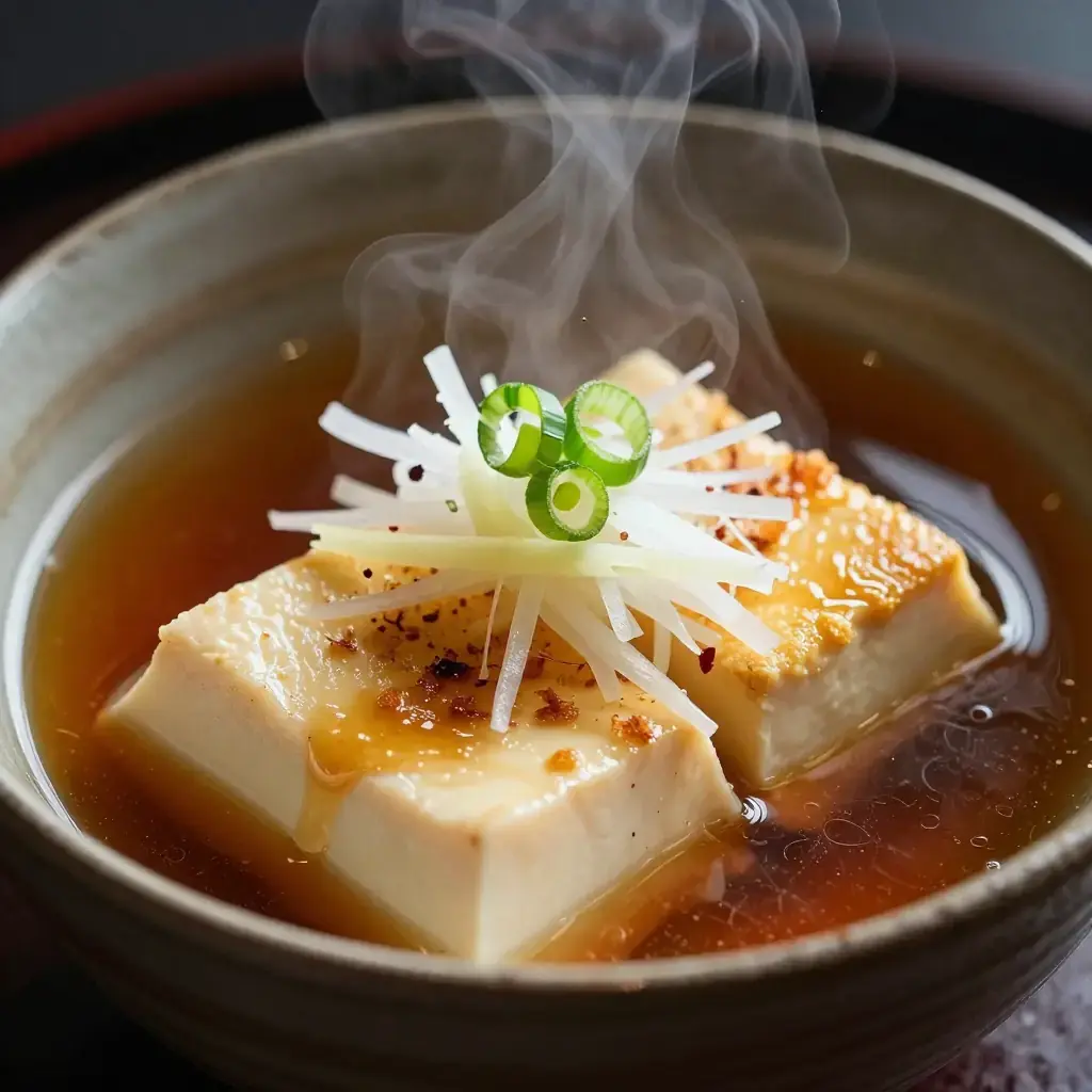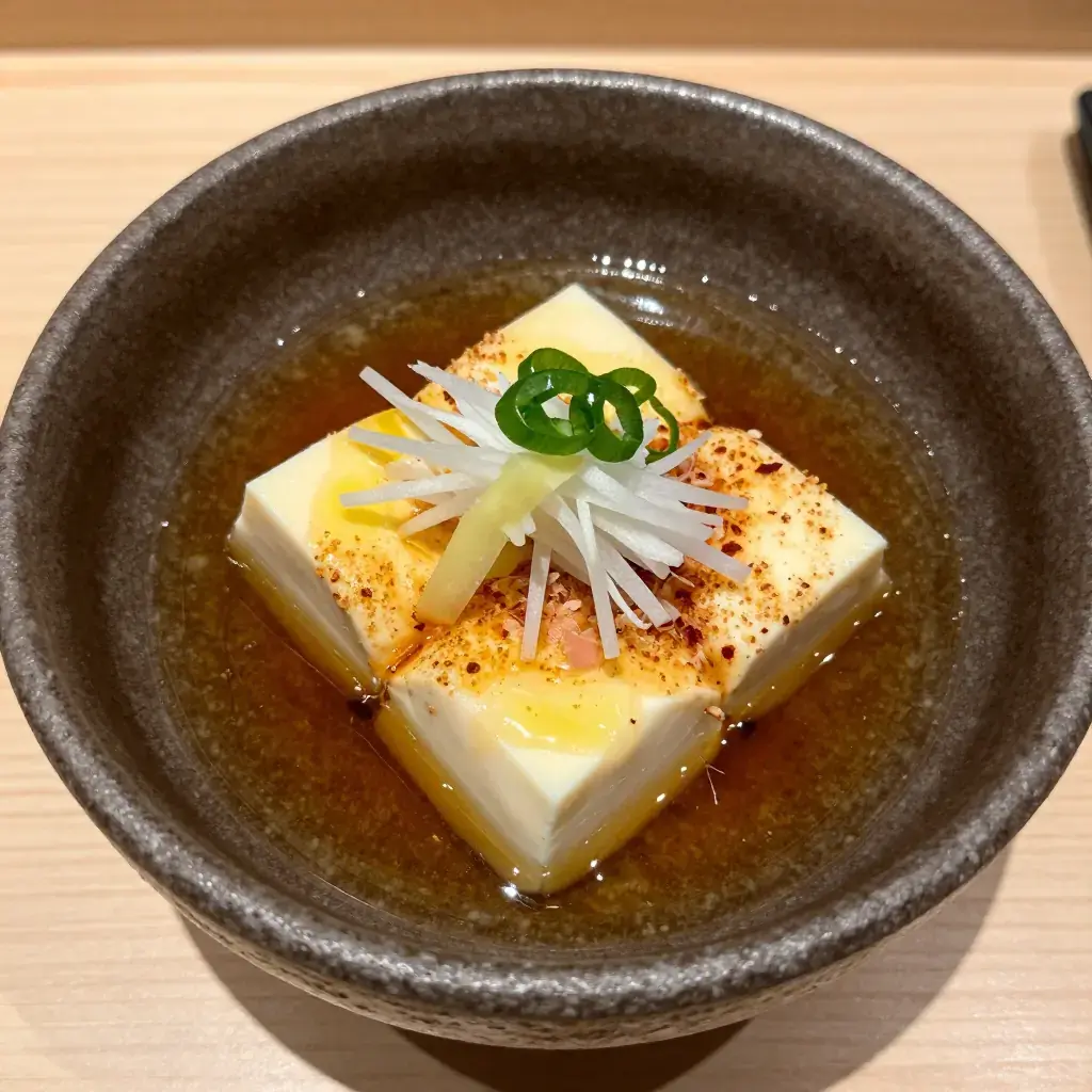 One of Japan's most beloved izakaya (gastropub) staples, agedashi tofu has roots in Edo-period cookbooks but found its truest form in the casual, convivial late-night drinking culture of the 20th century. Silken tofu is dusted in potato starch and flash-fried to a paper-thin, translucent crisp, then floated in a delicate hot dashi broth with grated daikon, ginger, and bonito.