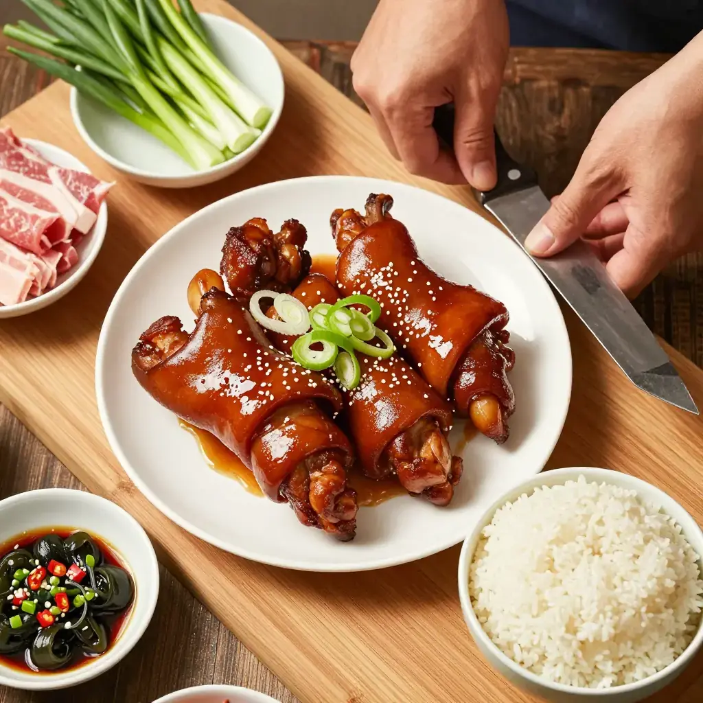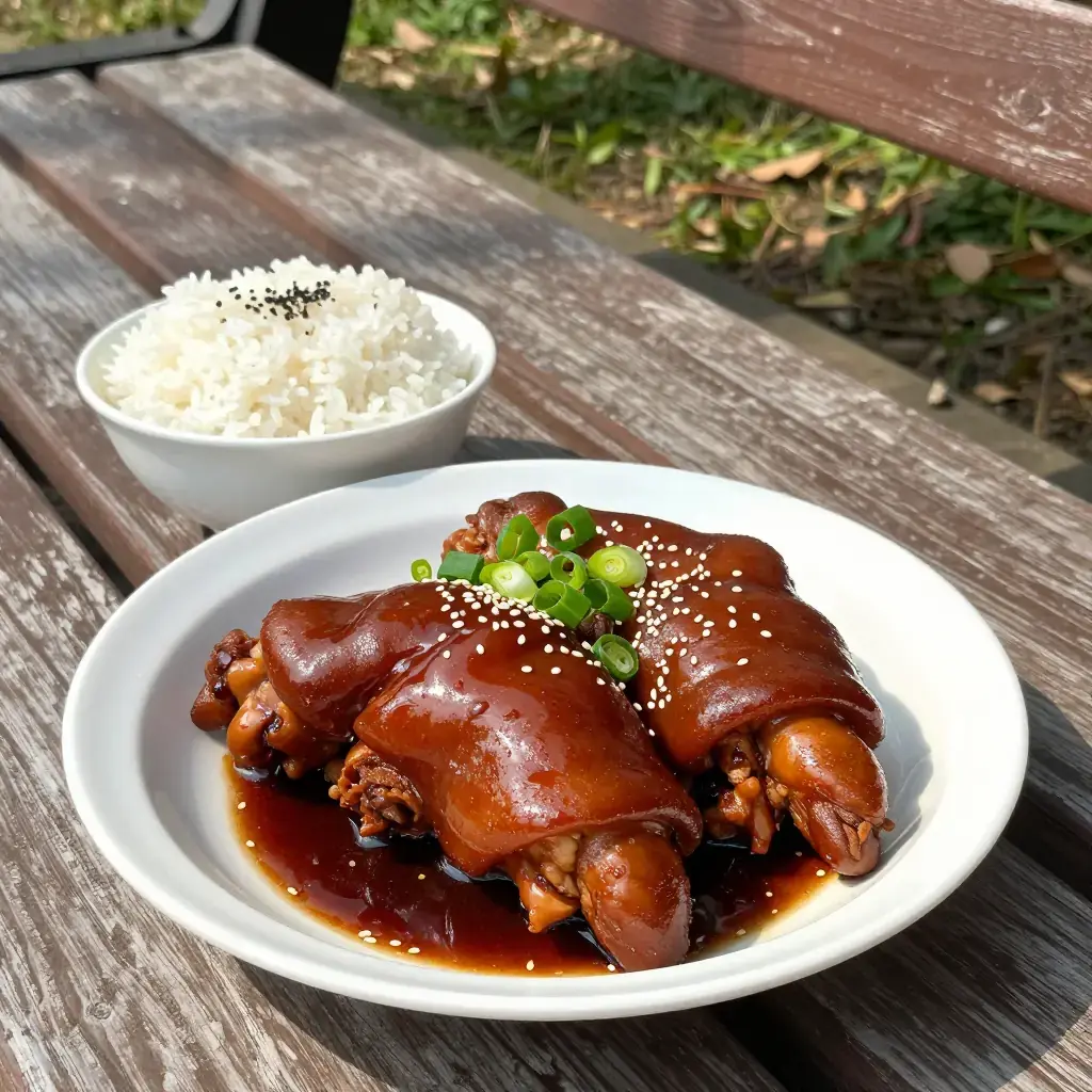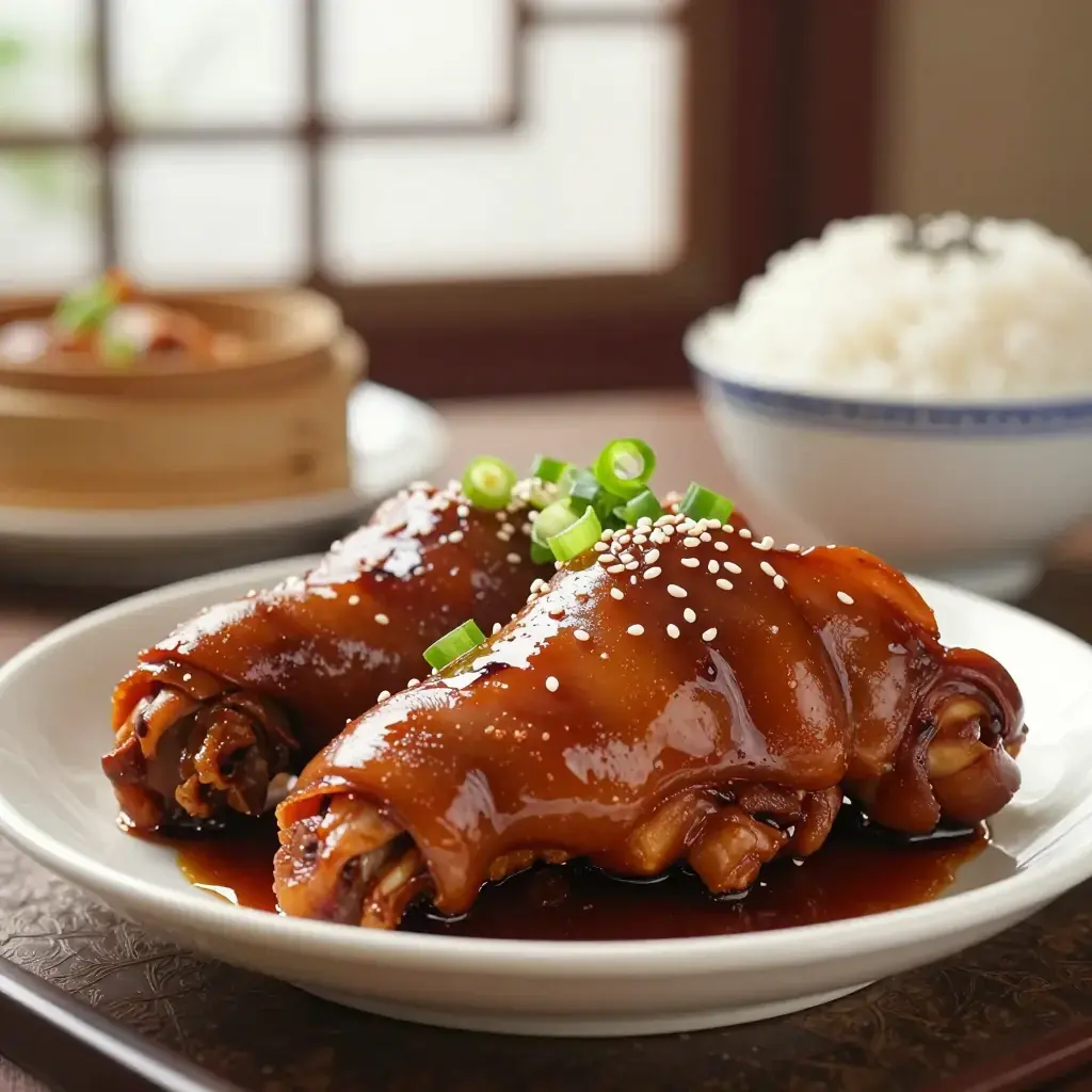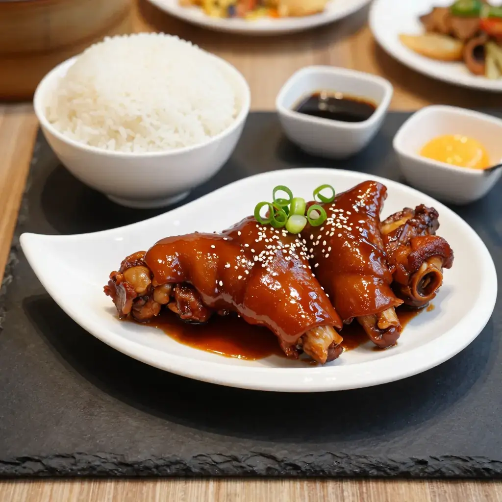 - Brush trotters with a little dark soy sauce for extra colour if desired. Arrange on a platter, spoon over the reduced stock glaze, drizzle with sesame oil, and scatter with spring onions. Serve with steamed jasmine rice.