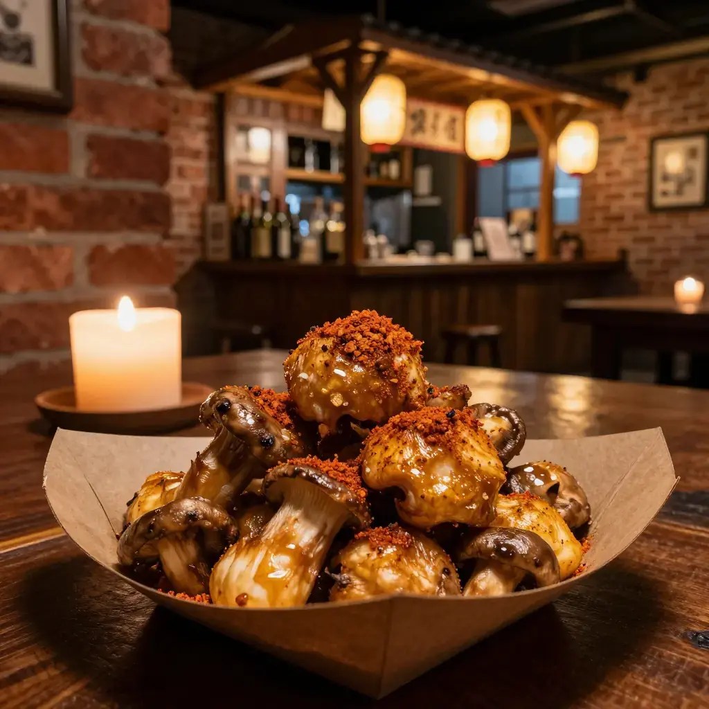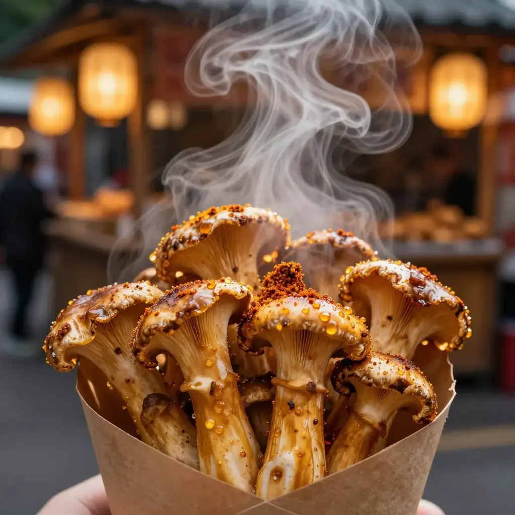 Northeastern China's vast forests yield an abundance of wild mushrooms each autumn, and frying them in a crisp seasoned coating is one of the oldest snack traditions in Heilongjiang and Jilin provinces. Vendors at night markets serve these in paper cones with a sprinkle of cumin and chilli powder — a combination that reveals the Central Asian influence on Dongbei's borderland cuisine.