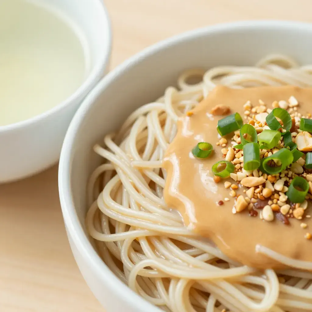 - While noodles cook, whisk peanut butter, light soy, sesame oil, dark soy, sugar, and warm water into a smooth sauce. Adjust with a splash of noodle cooking water if too thick — it should coat a spoon lightly.