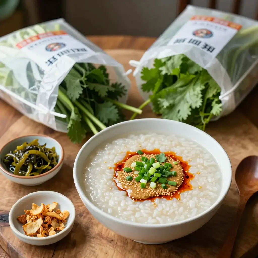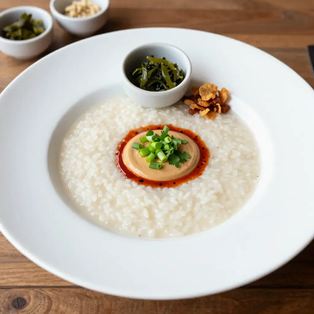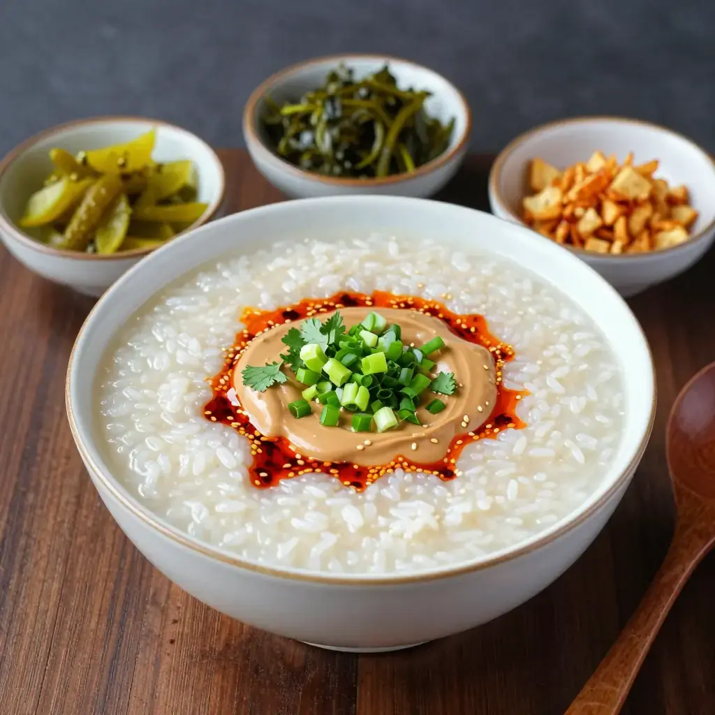 - While the congee cooks, prepare all condiments: arrange pickled greens, sesame paste, chilli oil, fried shallots, and dried shrimp (if using) in small bowls.