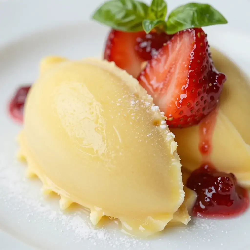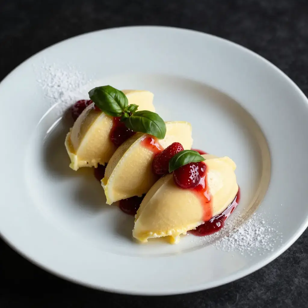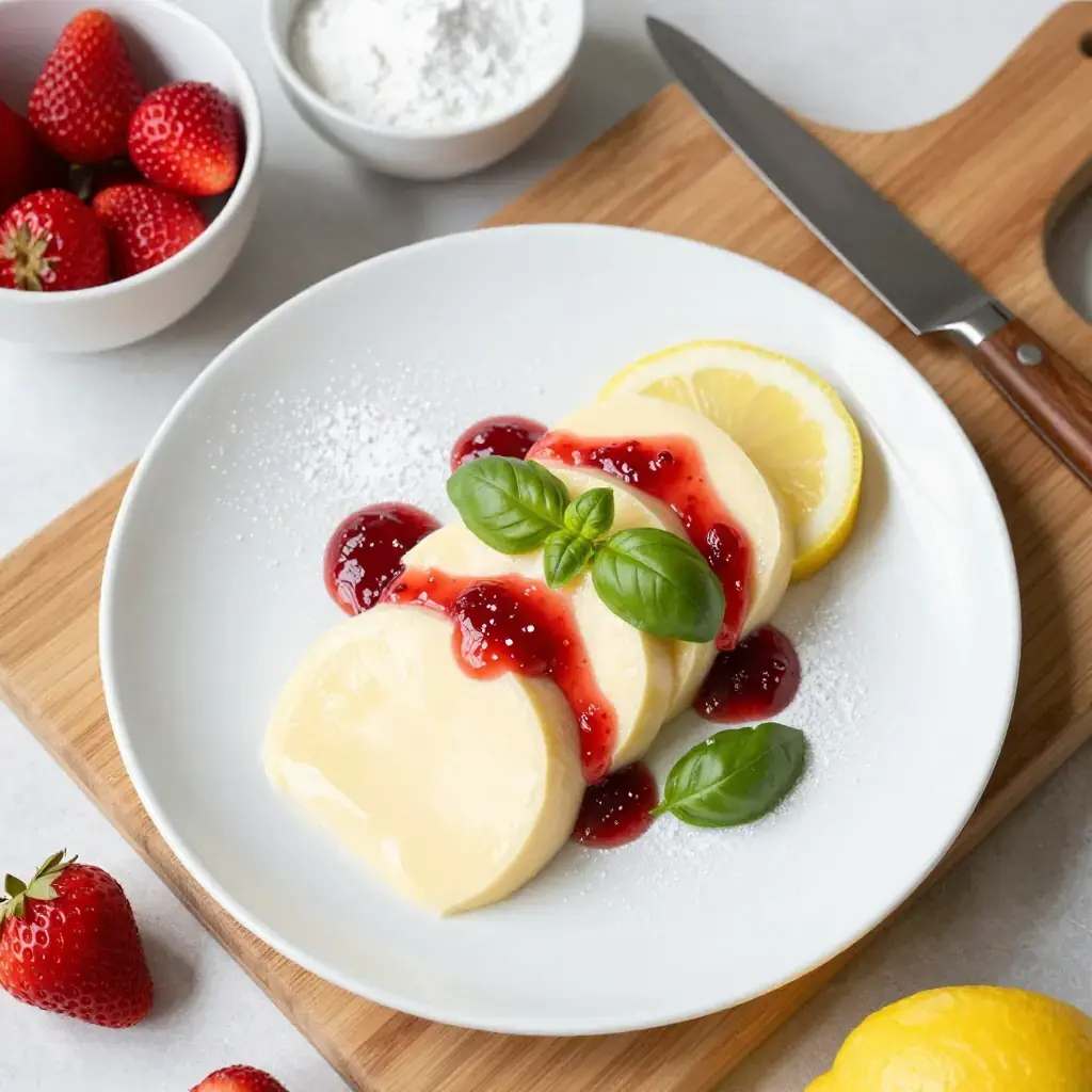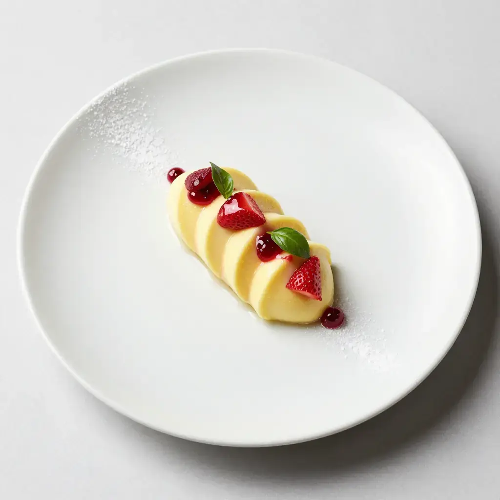 # Semifreddo al Limone con Fragole Semifreddo — literally "half-cold" in Italian — is a silky frozen mousse that sits between ice cream and mousse in texture, needing no ice cream machine. This modern Italian interpretation pairs a cloud-light lemon cream with macerated summer strawberries, a refreshing riff on the classic semifreddo technique that has become a fixture in contemporary trattorie across northern Italy. Serves: 8 ## Ingredients **For the semifreddo:** - 4 eggs, separated - 150g (¾ cup) caster sugar, divided - Zest and juice of 2 unwaxed lemons - 300ml (1¼ cups) heavy cream - Pinch of salt **For the macerated strawberries:** - 400g (14 oz) fresh strawberries, hulled and sliced - 2 tbsp caster sugar - 1 tbsp fresh lemon juice - 4 fresh basil leaves, torn ## Instructions 1. Line a 900g (2 lb) loaf tin with cling film, leaving overhang on all sides. 2. Whisk egg yolks with 100g sugar and the lemon zest in a bowl set over a saucepan of barely simmering water. Whisk vigorously 6–8 minutes until pale, thick, and tripled in volume. Remove from heat, whisk in lemon juice, and cool completely. 3. In a separate bowl, whip the heavy cream to soft peaks. Fold gently into the cooled lemon curd. 4. In a clean bowl, whisk egg whites with a pinch of salt until foamy. Add remaining 50g sugar gradually and whisk to stiff, glossy peaks. 5. Fold the meringue into the cream mixture in two additions, using a large spatula with light strokes to preserve the air. 6. Pour into the prepared tin, smooth the top, fold over the cling film, and freeze at least 6 hours or overnight. 7. Meanwhile, toss strawberries with sugar, lemon juice, and basil. Refrigerate 30 minutes to macerate. 8. Unmould the semifreddo by inverting onto a chilled plate. Slice with a hot knife and serve with macerated strawberries. **Cook's Notes:** The semifreddo will keep frozen up to 2 weeks wrapped tightly. For clean slices, dip your knife in hot water between cuts. Raspberries or peaches work equally well as the fruit accompaniment.Images