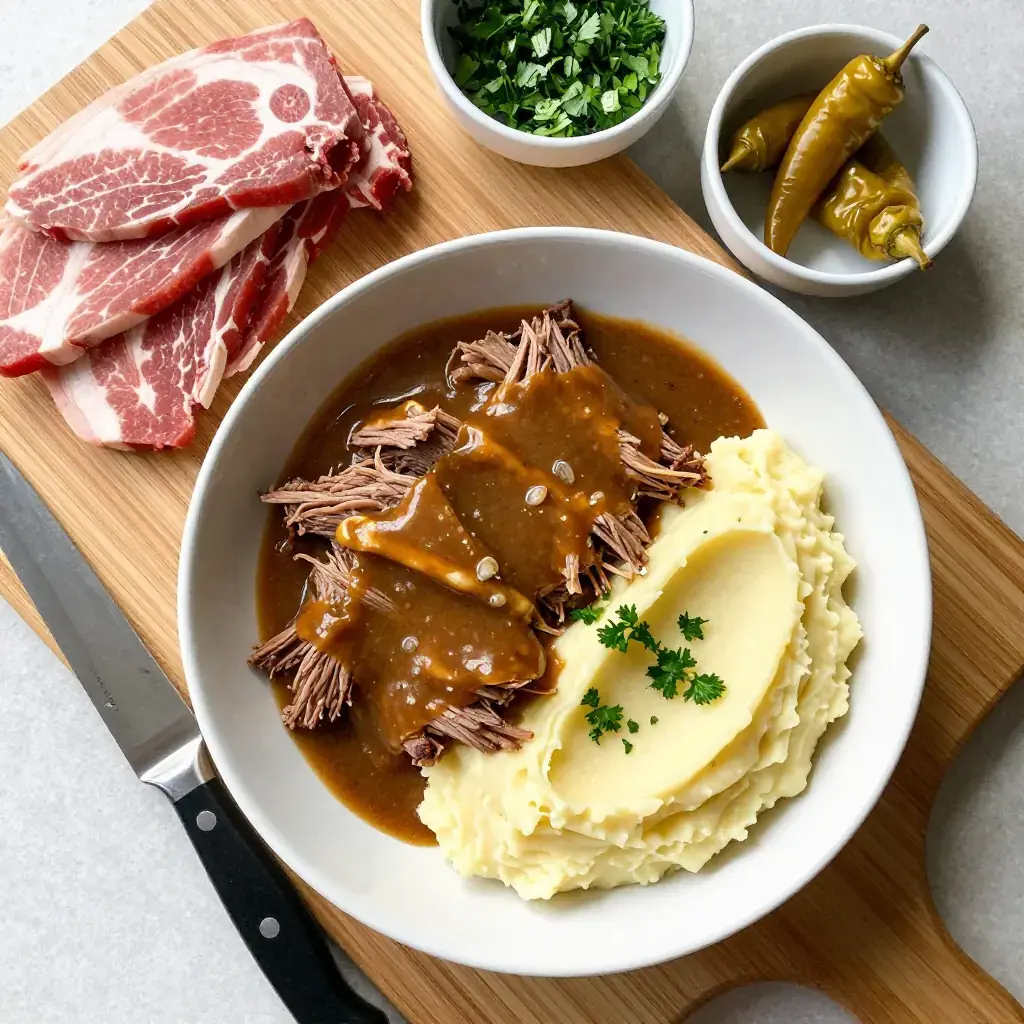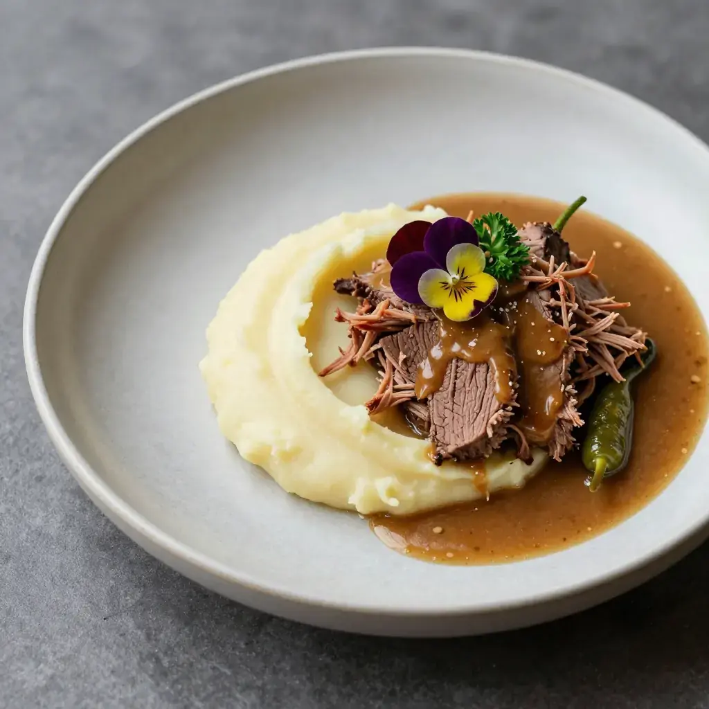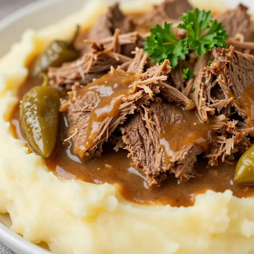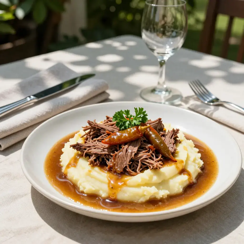 # Mississippi Pot Roast Mississippi Pot Roast began in the 1990s when a home cook in Ripley, Mississippi, improvised with what she had on hand: a chuck roast, ranch seasoning, au jus mix, butter, and pepperoncini peppers. The result — fork-tender, tangy, rich — spread through church potluck culture across the Deep South and became a slow-cooker legend. It is unabashedly simple and deeply satisfying. Serves: 6 ## Ingredients - 1.5kg (3 lb) beef chuck roast - 1 packet (28g / 1 oz) dry ranch dressing mix - 1 packet (28g / 1 oz) dry au jus gravy mix (or brown gravy mix) - 115g (½ cup / 1 stick) unsalted butter, cut into pats - 8–10 whole pepperoncini peppers (jarred), plus 60ml (¼ cup) pepperoncini brine - 1 medium onion, thickly sliced - 4 garlic cloves, smashed - Salt and black pepper **To serve:** - Creamy mashed potatoes or egg noodles - Fresh parsley, chopped ## Instructions 1. Season the chuck roast generously with salt and pepper on all sides. For best results, sear in a hot skillet with a little oil 3–4 minutes per side until well-browned, then transfer to the slow cooker. (Skipping this step still yields great results.) 2. Scatter onion slices and garlic around the roast in the slow cooker. Sprinkle the dry ranch and au jus mixes evenly over the top. 3. Arrange butter pats on top of the roast. Add the whole pepperoncini peppers around the sides and pour in the pepperoncini brine. 4. Cover and cook on LOW 8–10 hours (or HIGH 5–6 hours) until the meat is fall-apart tender and shreds easily with a fork. 5. Remove the roast and shred into large chunks. Whisk the cooking liquid to emulsify the butter and juices into a natural gravy. 6. Return shredded meat to the gravy. Serve over mashed potatoes or egg noodles, garnished with parsley. **Cook's Notes:** The pepperoncini provide a mild, tangy heat — not fiery. Do not omit the brine; it is the secret to the sauce's depth. This dish actually improves overnight, making it ideal for entertaining the next day.Images