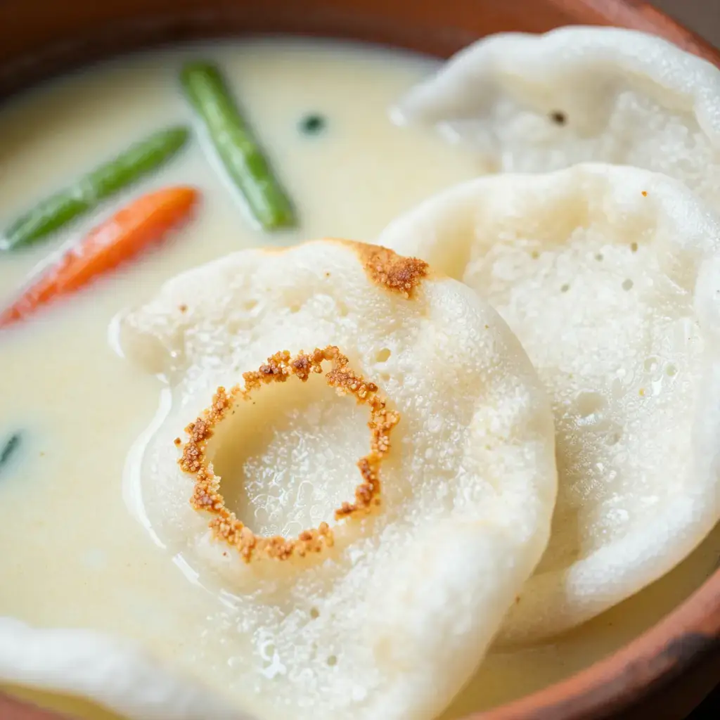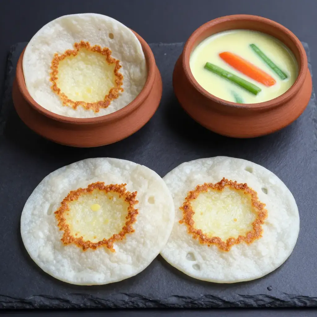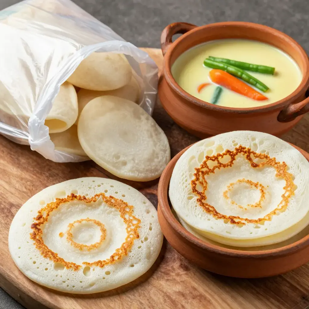 - Appam: Heat a small non-stick wok or appam pan over medium-high. Add a ladleful of batter, quickly swirl the pan so the batter coats the sides thinly and pools in the centre. Cover with a lid and steam 2–3 minutes until the edges are golden and crispy and the centre is set and spongy. Serve immediately.