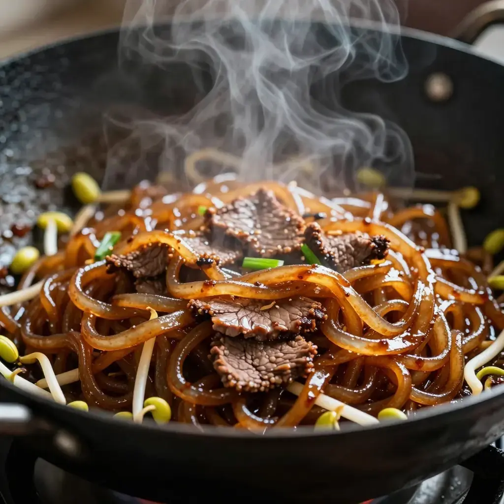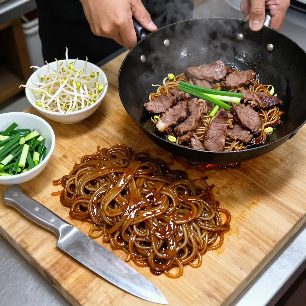 - Drizzle the sauce over the noodles and toss everything together with large, confident scooping motions for 1–2 minutes. Add the beef back in.