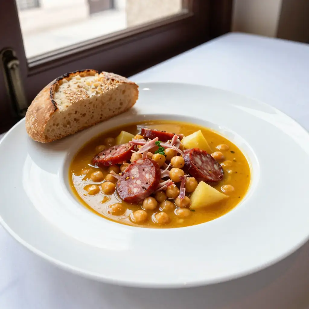 # Potaje de Garbanzos Cubano Potaje — a hearty bean stew — forms the backbone of Cuban home cooking, and the garbanzo (chickpea) version ranks among the most satisfying. Brought to Cuba by Spanish settlers, it evolved through the addition of African cooking techniques and tropical ingredients until it became distinctly Cuban: a thick, deeply flavoured pot of chickpeas braised with Spanish chorizo, smoked ham hock, and a classic sofrito that perfumes the whole kitchen. It is a meal in itself, eaten over rice or with crusty Cuban bread. Serves: 4 ## Ingredients - 400g (2 cups) dried chickpeas (garbanzos), soaked overnight and drained - 1 smoked ham hock (about 500g / 1 lb) - 150g (5 oz) Spanish dry-cured chorizo, sliced into rounds - 60ml (¼ cup) olive oil - 1 large onion, finely diced - 1 green bell pepper, finely diced - 4 cloves garlic, minced - 1 tsp ground cumin - 1 tsp sweet smoked paprika - 400g (14 oz) canned crushed tomatoes - 1.5 litres (6 cups) water or chicken stock - 2 medium waxy potatoes, cut into 2.5cm (1-inch) cubes - 1 bay leaf - Salt and black pepper to taste - White rice or Cuban bread, for serving ## Instructions 1. Place the soaked chickpeas and ham hock in a large pot. Cover with the water or stock, add the bay leaf, and bring to a boil. Skim off any foam. Reduce heat, cover, and simmer for 1 hour until the chickpeas are nearly tender. 2. Meanwhile, heat the olive oil in a skillet over medium heat. Add the chorizo and fry for 3–4 minutes until lightly crisped and the oil is orange-red. Remove chorizo and set aside, leaving the flavoured oil in the pan. 3. Add the onion and green pepper to the same skillet. Cook, stirring, for 6–7 minutes until softened and golden. 4. Add the garlic, cumin, and paprika. Cook for 1 minute until fragrant. 5. Stir in the crushed tomatoes and cook for 5 minutes until the sofrito deepens in colour and the oil separates slightly. 6. Add the sofrito to the chickpea pot along with the crisped chorizo and potato cubes. Stir well. 7. Remove the ham hock. When cool enough to handle, shred the meat from the bone and return the meat to the pot, discarding the bone and skin. 8. Continue to simmer the stew, uncovered, for 20–25 minutes until the potatoes are tender and the broth has thickened to a rich consistency. Taste and adjust salt and pepper. 9. Serve in deep bowls over white rice or with Cuban bread for dipping. **Cook's Notes:** Crushing some of the chickpeas against the side of the pot thickens the stew naturally. A pressure cooker reduces the initial chickpea cooking to 25 minutes. The stew freezes beautifully.Images