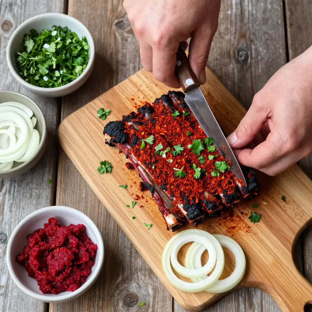 Grilled lamb ribs are the centrepiece of the Serbian roštilj tradition, where families gather around open charcoal fires for long, sociable weekend meals. The marinade of garlic, rosemary, and ajvar-style paprika paste gives the ribs a deeply aromatic crust while the fat bastes the meat naturally over the coals.