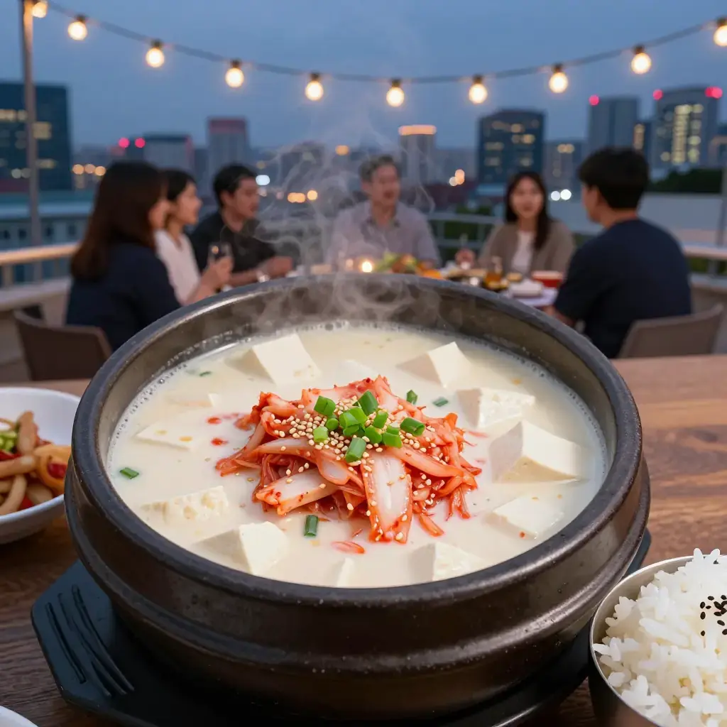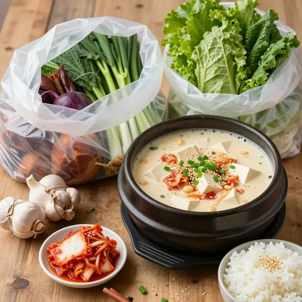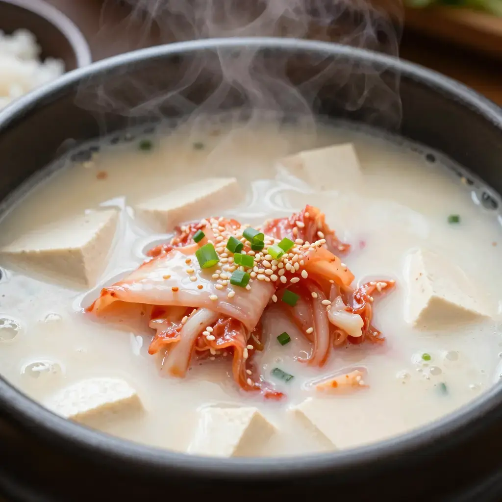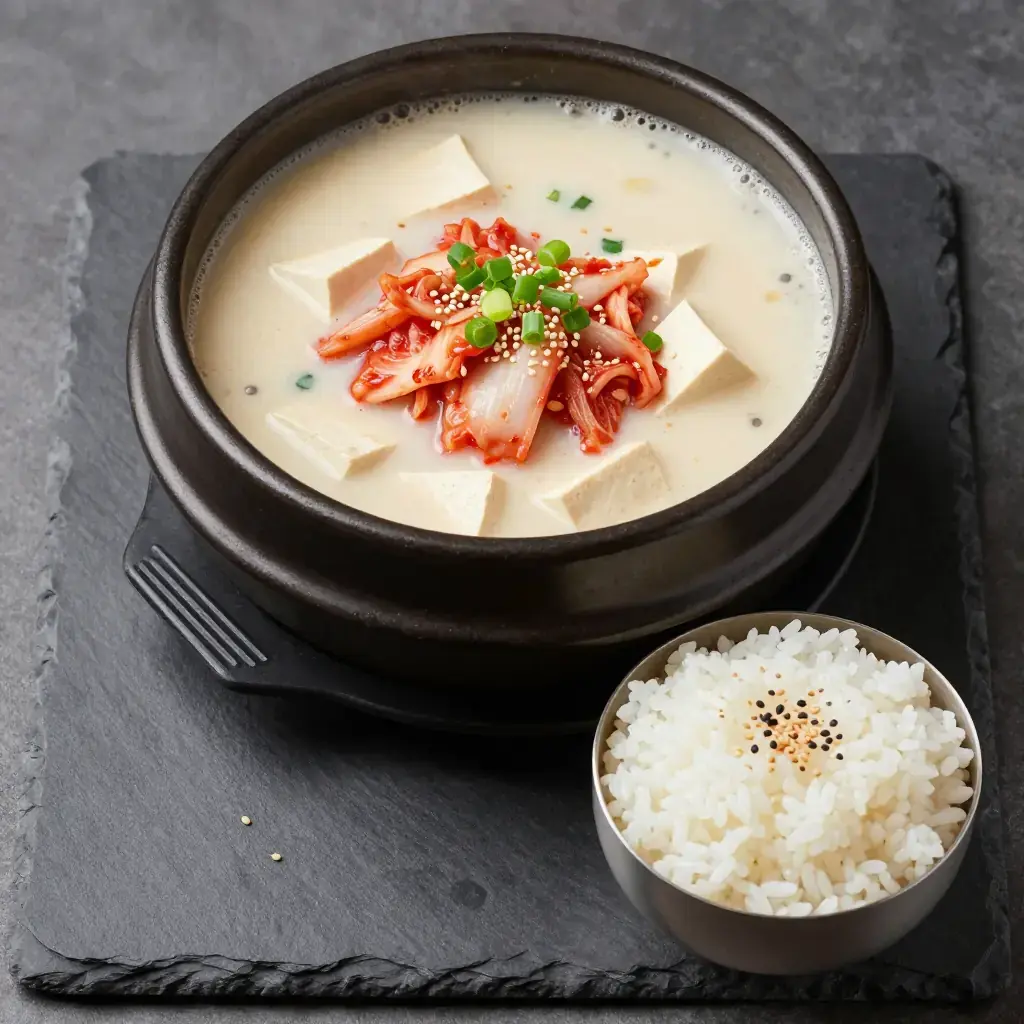 Kongbiji Jjigae is a deeply nourishing Korean stew made from the ground soybean pulp left over after making tofu — a frugal, heirloom dish that transforms a by-product into something extraordinarily comforting. The thick, milky stew is enriched with kimchi and pork, simmered in an earthenware pot until the soybean base thickens to a porridge-like consistency. It is a cold-weather staple across Korea.