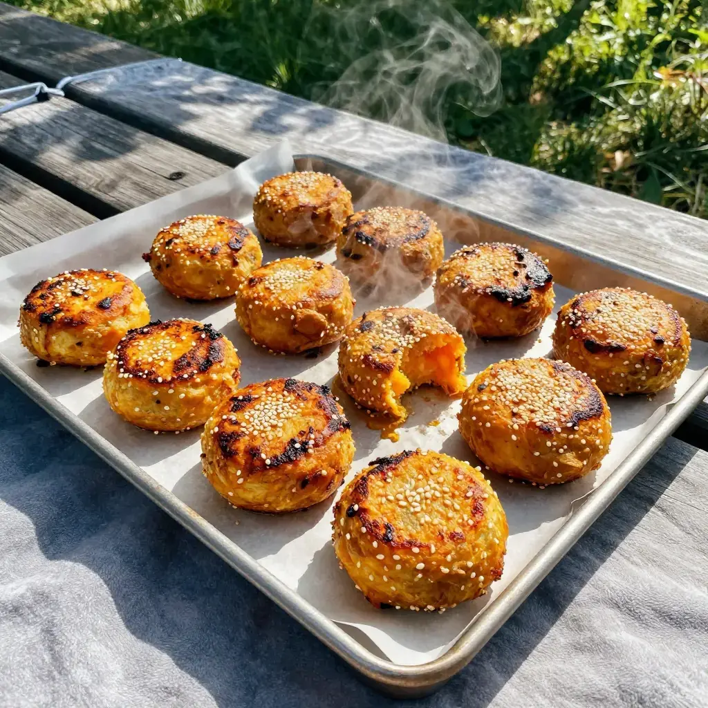 - Preheat oven to 200°C (400°F) and line a baking sheet with parchment. Brush both sides of each patty with oil. Sprinkle sesame seeds on top.