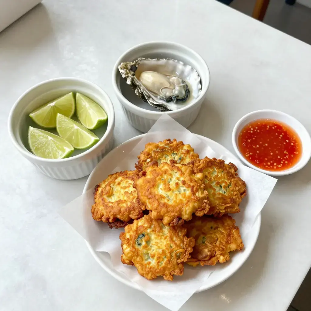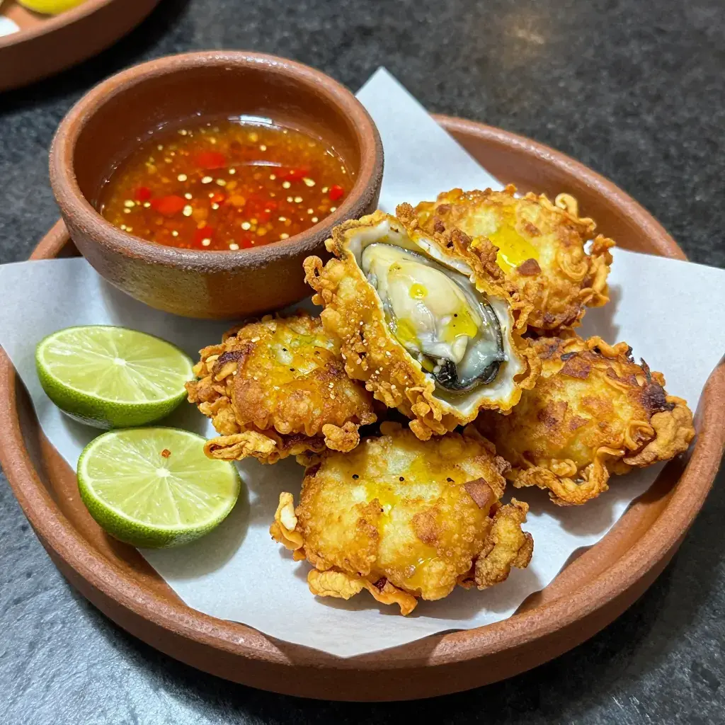# Fujian Zha Caoli Fujian's coastline has made oysters a daily staple since the Song dynasty. These crisp, battered fritters — sold from woks set up at Xiamen night markets — are the quick-and-easy street version of the grander oyster omelette, offering the same briny sweetness in a shattering golden shell. Serves: 4 ## Ingredients - 300g (10.5 oz) fresh shucked oysters, drained - 80g (3 oz / 2/3 cup) plain (all-purpose) flour - 40g (1.5 oz / 1/3 cup) tapioca starch (or cornstarch) - 1 tsp (5g) salt - 1/2 tsp (2g) white pepper - 1/2 tsp (2g) five-spice powder - 120ml (4 fl oz) cold sparkling water - Neutral oil for deep-frying (about 800ml / 3.5 cups) - 2 tbsp (30ml) sweet chilli sauce, to serve - 1 lime, cut into wedges - Fresh coriander (cilantro) leaves, to garnish ## Instructions 1. Rinse the oysters gently in cold water. Pat completely dry with paper towel — any moisture will cause splattering. 2. Whisk flour, tapioca starch, salt, white pepper, and five-spice together in a bowl. Pour in the cold sparkling water and stir lightly to a lumpy batter — do not over-mix. Some dry streaks are fine. 3. Heat oil in a deep wok or saucepan to 180°C (355°F). 4. Working in batches of 4–5, dip each oyster in the batter, letting excess drip off, then lower gently into the oil. Fry for 2–3 minutes, turning once, until deep golden and crisp. 5. Drain on a wire rack (not paper towel, to keep crispness). 6. Serve immediately with sweet chilli sauce and lime wedges, garnished with coriander. **Cook's Notes:** Sparkling water aerates the batter for a lighter crust. Do not crowd the wok — oil temperature drops and fritters turn soggy. Serve within 5 minutes; they lose crispness quickly.Images