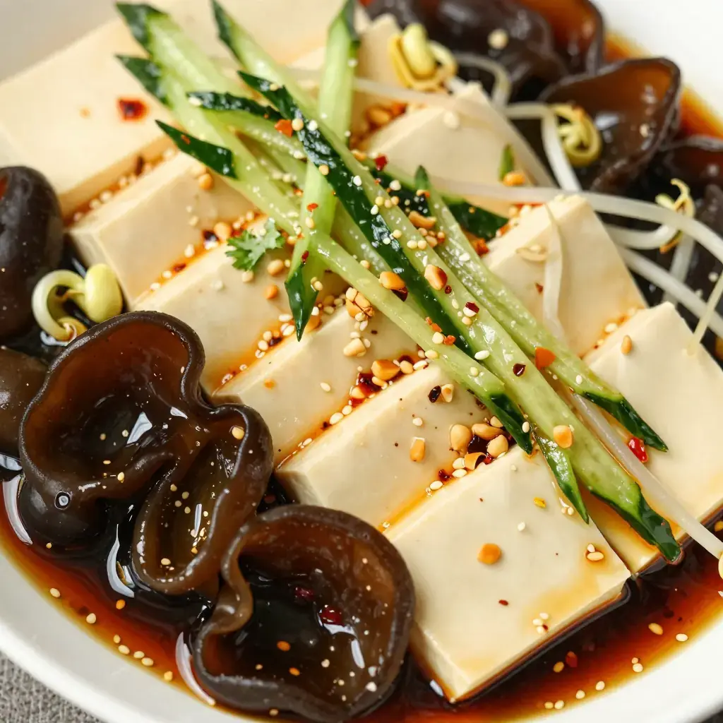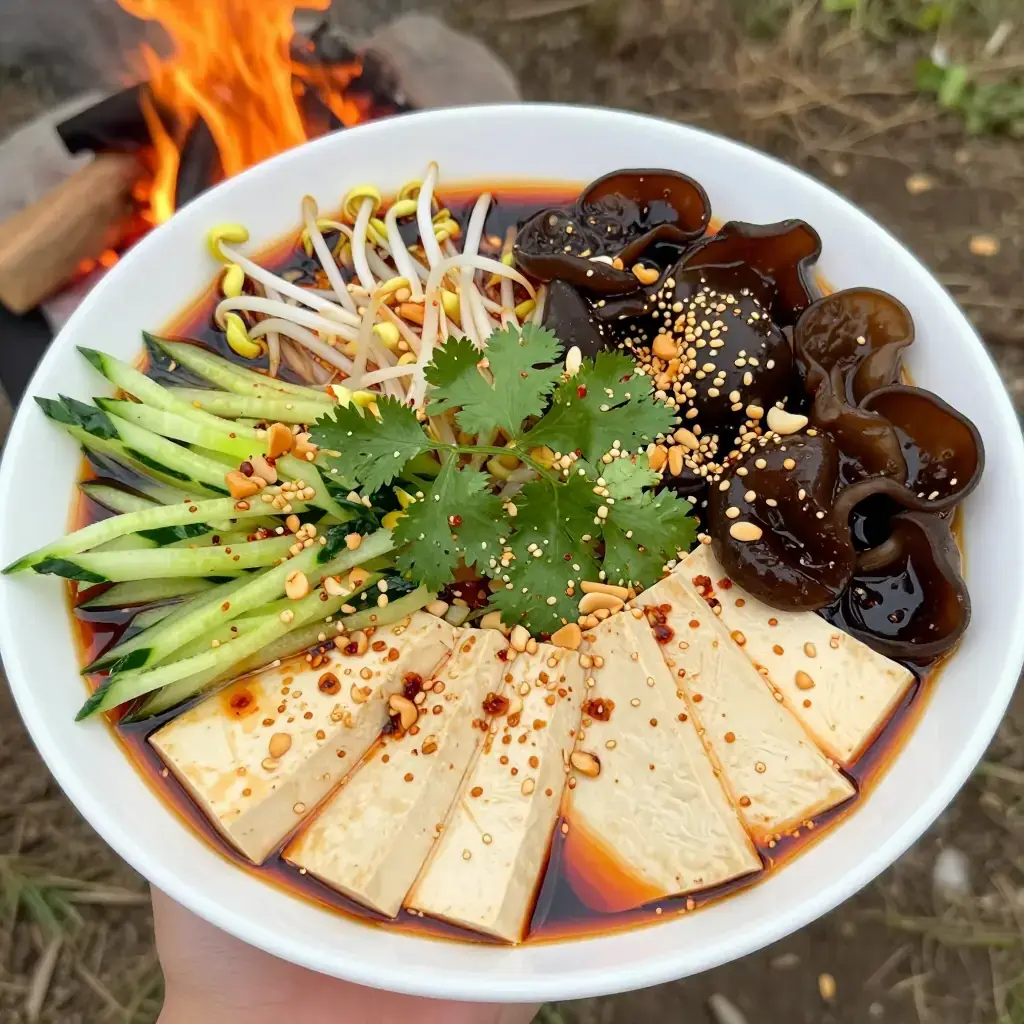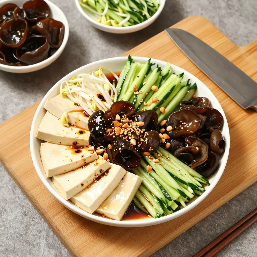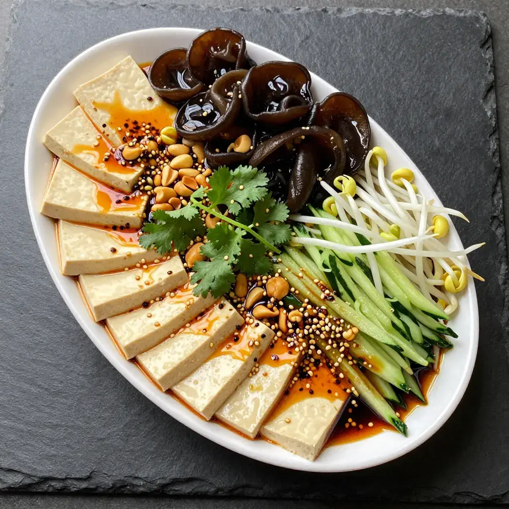 # Sichuan Liang Ban Su Cai He Liang Ban — cold-dressed salads doused in a tingling ma la (numbing-spicy) dressing — are Sichuan's most versatile culinary tradition. This vegetarian platter combines blanched seasonal vegetables with silken tofu, dressed in a complex sesame-chilli sauce that is simultaneously spicy, numbing, sour, sweet, and savoury — a textbook demonstration of Sichuan's famed 'hundred flavours' philosophy. Serves: 4 ## Ingredients ### Vegetables - 300g (10 oz) silken or medium-firm tofu, sliced into rectangles - 200g (7 oz) mung bean sprouts - 150g (5 oz) cucumber, julienned - 100g (3.5 oz) blanched spinach or morning glory, squeezed dry - 100g (3.5 oz) wood ear mushrooms (dried, rehydrated), sliced ### Dressing - 3 tbsp (45ml) Chinese sesame paste or tahini - 2 tbsp (30ml) Sichuan chilli oil (with sediment) - 2 tbsp (30ml) light soy sauce - 1 tbsp (15ml) black vinegar (Chinkiang) - 1 tbsp (15ml) sesame oil - 1 tsp (5ml) Sichuan peppercorn oil - 1 tsp sugar - 3 garlic cloves, minced - 1 tbsp (15ml) warm water (to thin dressing) - 3 spring onions, sliced - 2 tbsp toasted peanuts, crushed - Fresh coriander, to garnish ## Instructions 1. Blanch bean sprouts in boiling water for 30 seconds, drain immediately into ice water. Blanch wood ear mushrooms 2 minutes, drain and cool. 2. Drain tofu on kitchen paper for 10 minutes. Arrange tofu slices on a serving platter, fan the cucumber, bean sprouts, spinach, and mushrooms around and over the tofu. 3. Whisk sesame paste with warm water until smooth. Add soy sauce, black vinegar, sesame oil, peppercorn oil, and sugar — whisk to a pourable dressing consistency. Stir in minced garlic and chilli oil. 4. Pour dressing evenly over the platter. Scatter with spring onions, crushed peanuts, and fresh coriander. 5. Serve at room temperature or lightly chilled. Toss at the table just before eating. **Cook's Notes:** The dressing can be made 2 days ahead and kept refrigerated. Sichuan peppercorn oil is key — its mouth-numbing (ma) quality is what distinguishes this from a generic sesame salad. For a more substantial dish, add glass noodles blanched and cooled. This platter is an ideal dinner-party starter.Images