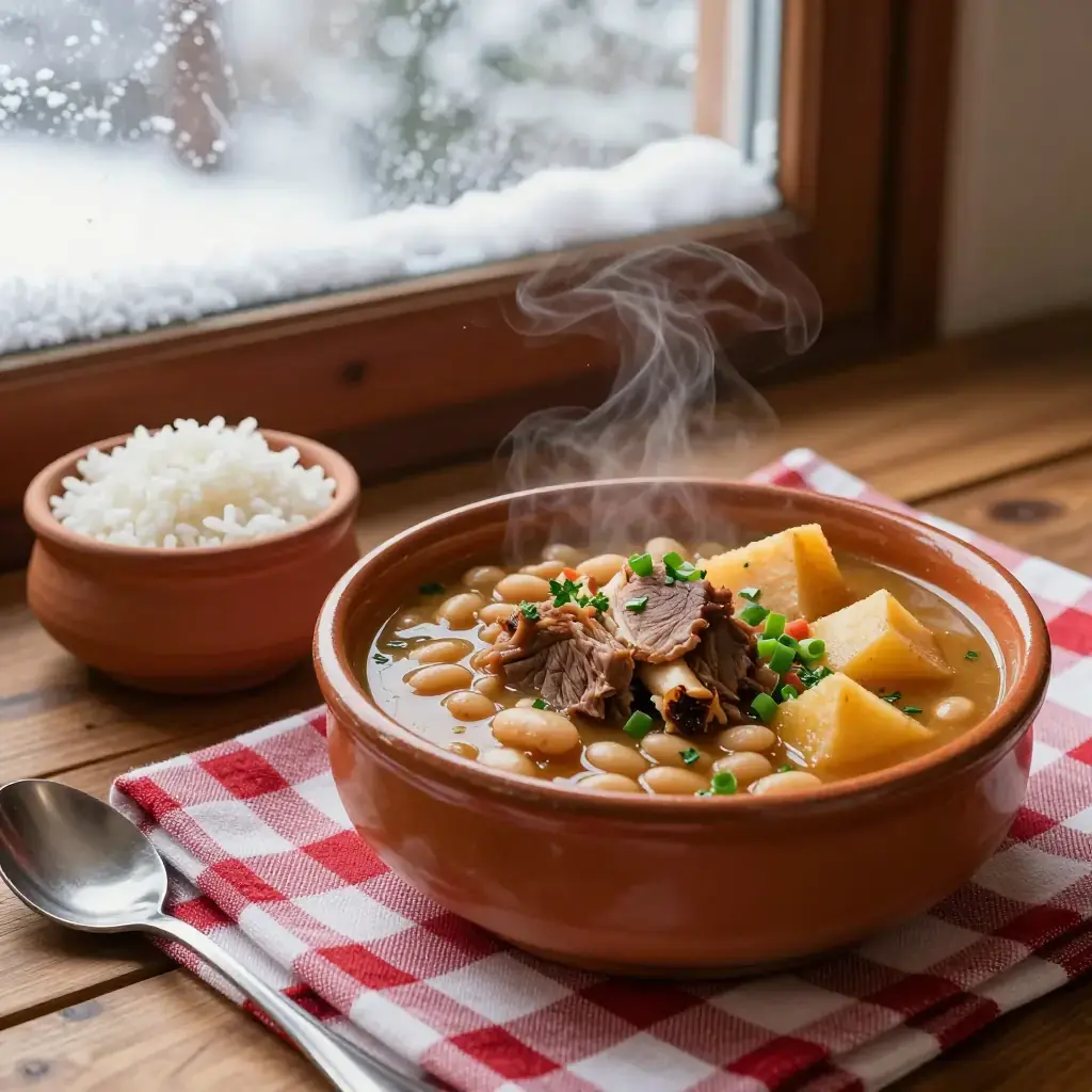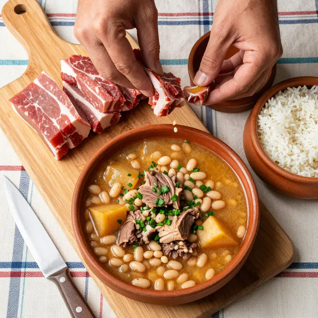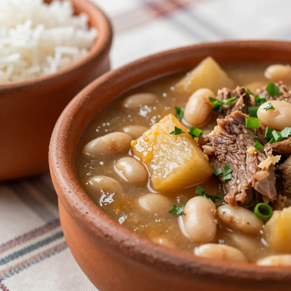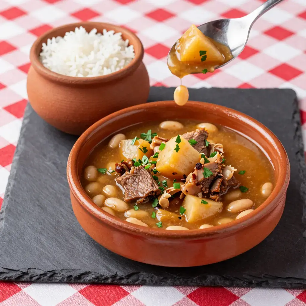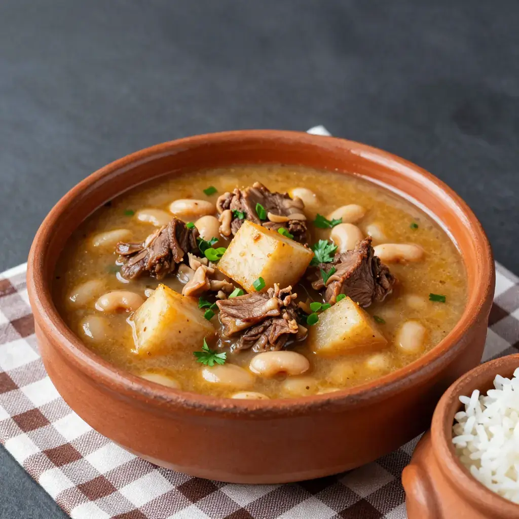 # Mocotó Mocotó is a deeply comforting peasant stew from Brazil's impoverished Northeast (Nordeste), built on the collagen-rich trotters of cattle. Slow-cooked until the gelatinous trotter meat falls from the bone and the broth turns to an unctuous, lip-coating liquid, mocotó is served with white beans, cassava, and a vinegar hot sauce. It is now celebrated in São Paulo's vibrant working-class bar culture. Serves: 6 ## Ingredients - 1.2 kg (2.7 lb) cow's trotters (mocotó), cut into sections - 400g (14 oz) dried white beans (feijão branco), soaked overnight - 1 large onion, finely diced - 8 garlic cloves, minced - 2 bay leaves - 1 tsp ground cumin - 1 tsp sweet paprika - 1 dried chilli or 0.5 tsp chilli flakes - 2 tbsp (30ml) neutral oil - 300g (10 oz) cassava (mandioca), peeled and cut into chunks (optional) - Salt and black pepper - Fresh parsley and spring onions, to finish - White rice and hot sauce, to serve ## Instructions 1. Blanch trotters: place in a large pot, cover with cold water, bring to a boil, and simmer 10 minutes. Drain and rinse well to remove impurities. 2. In a large heavy pot or slow cooker, fry onion in oil over medium heat until golden, 8 minutes. Add garlic, cumin, paprika, and chilli — cook 2 minutes. 3. Add trotters, drained soaked beans, bay leaves, and enough water to cover by 5cm (2 inches). Bring to a simmer. 4. Slow cooker: cook on low 8-10 hours. Stovetop: simmer gently, covered, for 3-4 hours, checking water levels. 5. After 2 hours (stovetop) or 6 hours (slow cooker), add cassava chunks if using. Continue cooking until cassava is tender and trotters are falling off the bone. 6. Remove trotters, pull any meat from the bones, and discard bones. Return meat to the pot. 7. Season with salt and pepper. Stir in parsley and spring onions. Serve over white rice with hot sauce. **Cook's Notes:** Ask the butcher to cut the trotters into 5cm sections — this exposes the marrow and helps the broth thicken. The gelatine from the trotters will make the broth set to a jelly when cold — this is the mark of a proper mocotó. Leftover stew reheats beautifully and improves on day two.Images