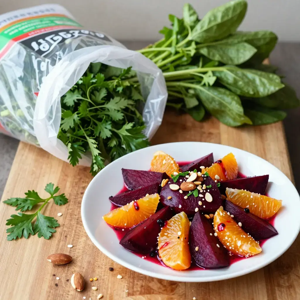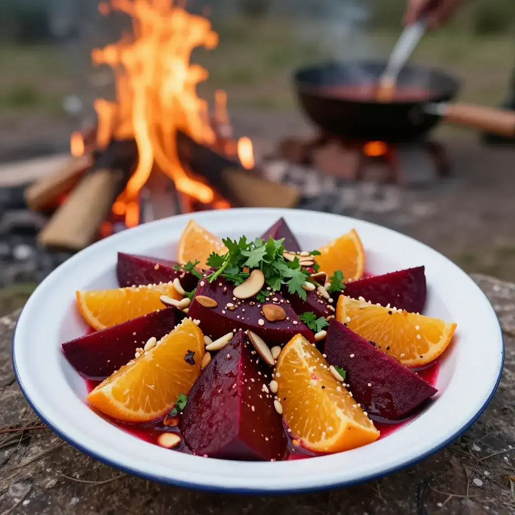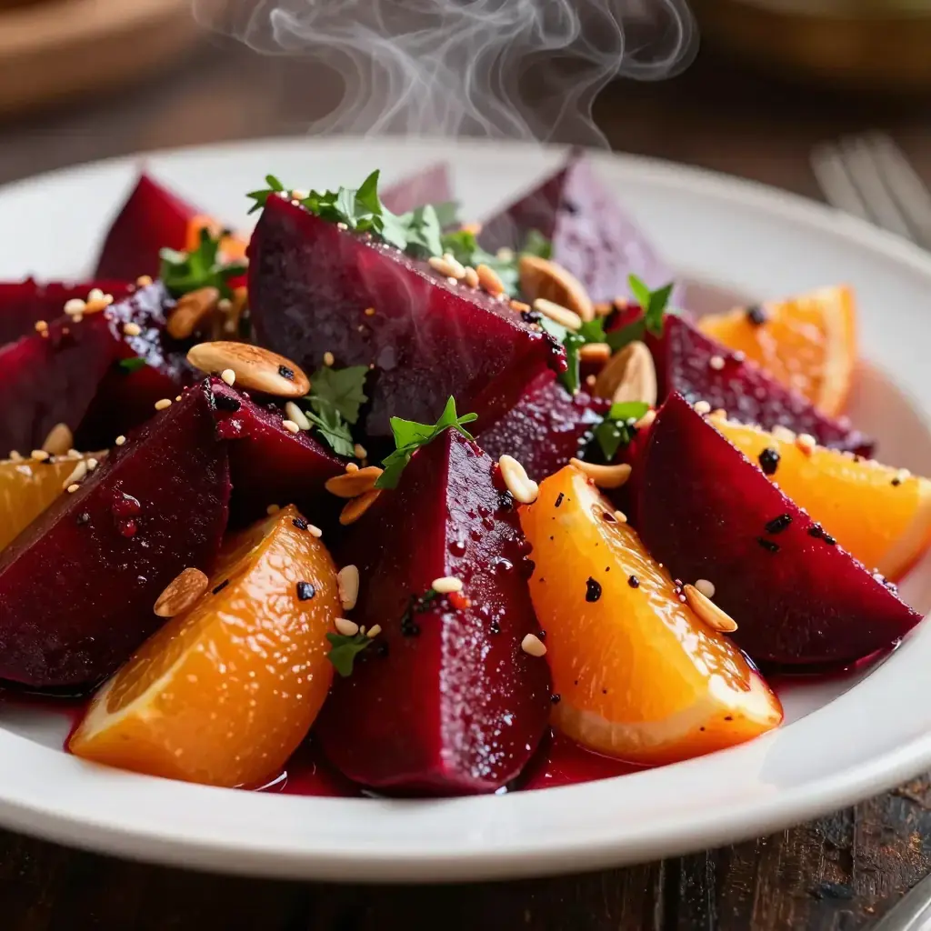 # Salade de Betterave à l'Orange et Cumin This jewel-coloured salad is a mainstay of modern Moroccan restaurant mezze, pairing the earthy sweetness of roasted beetroot with the brightness of fresh orange, warmed with toasted cumin and finished with a touch of harissa. It bridges traditional kemia culture with the contemporary Moroccan kitchen's embrace of bold flavour contrasts. Serves: 4 ## Ingredients - 700g (1½ lb) raw beetroot (about 4 medium), scrubbed - 2 large navel oranges - 1 tsp whole cumin seeds - 3 tbsp (45ml) extra-virgin olive oil - 2 tbsp (30ml) red wine vinegar - 1 tsp harissa paste - 1 tsp runny honey - ½ tsp fine salt - Black pepper to taste - 30g (¼ cup) toasted flaked almonds - 2 tbsp chopped fresh mint - 2 tbsp chopped fresh coriander ## Instructions 1. Preheat the oven to 200°C (400°F). Wrap the beetroot individually in foil. Roast for 55–65 minutes until completely tender when pierced with a skewer. Allow to cool, then rub off the skins (wear gloves). Cut into 2cm wedges. 2. Toast the cumin seeds in a dry frying pan over medium heat for 60–90 seconds until fragrant and beginning to pop. Crush lightly in a pestle and mortar. 3. Cut the top and bottom from each orange and slice off the skin and white pith following the curve of the fruit. Segment the oranges over a bowl to catch the juice, cutting between the membranes. Squeeze the membranes to extract maximum juice — reserve 2 tablespoons of juice for the dressing. 4. Whisk together the olive oil, red wine vinegar, harissa, honey, cumin and reserved orange juice. Season with salt and pepper. 5. Arrange the beetroot wedges and orange segments on a serving plate. Drizzle the dressing over. Scatter with toasted almonds, mint and coriander. Serve chilled or at room temperature. **Cook's Notes:** Roasting beetroot whole in foil concentrates their sweetness far better than boiling. Pre-cooked vacuum-packed beetroot can be substituted — skip step 1 but pat dry thoroughly. The salad holds well refrigerated for up to 2 days; add the almonds just before serving to keep them crunchy.Images
