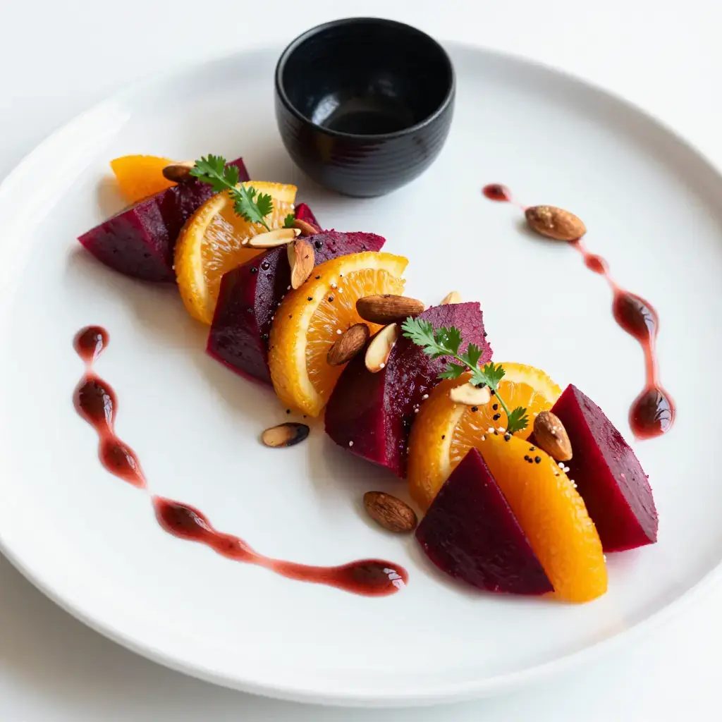 This jewel-coloured salad is a mainstay of modern Moroccan restaurant mezze, pairing the earthy sweetness of roasted beetroot with the brightness of fresh orange, warmed with toasted cumin and finished with a touch of harissa. It bridges traditional kemia culture with the contemporary Moroccan kitchen's embrace of bold flavour contrasts.
