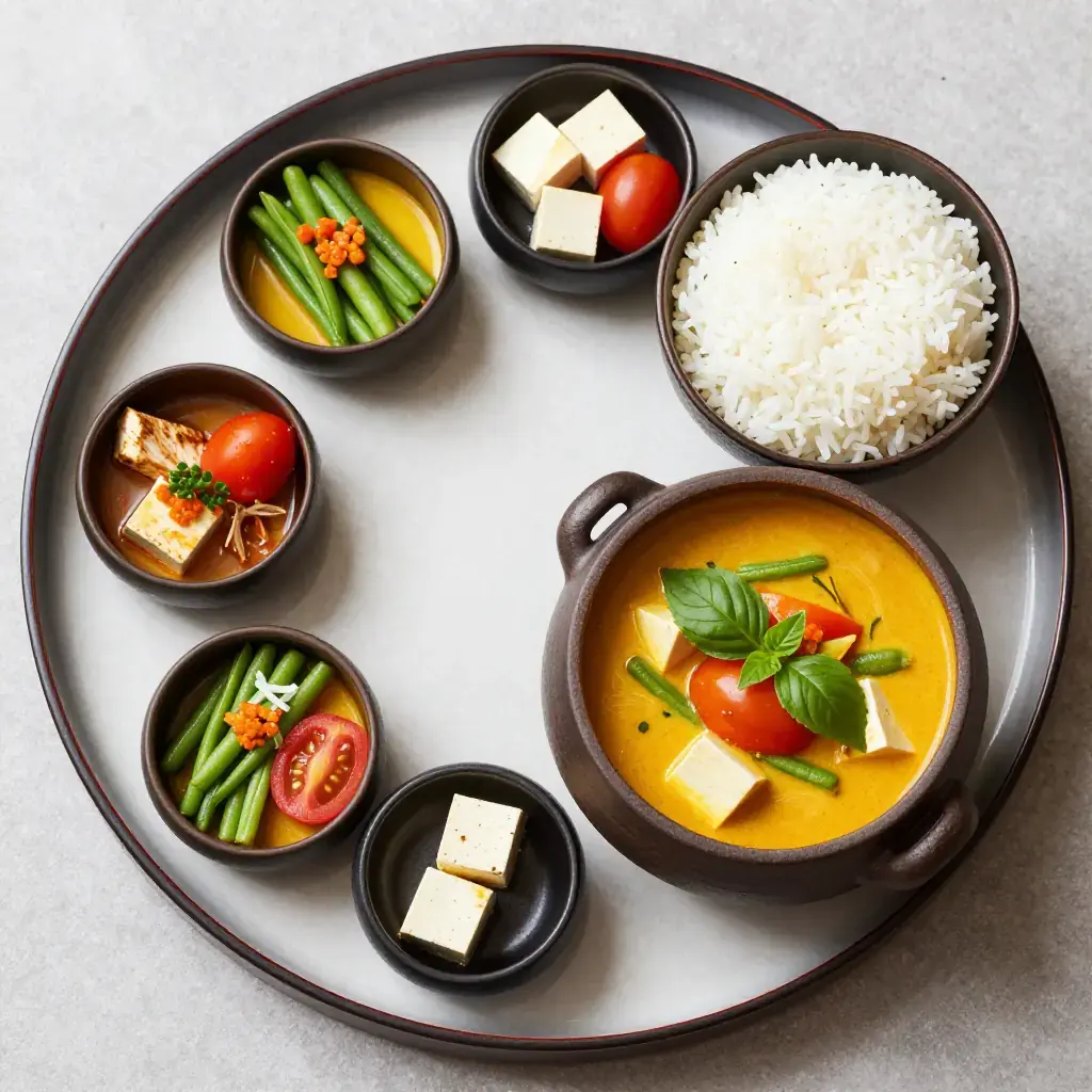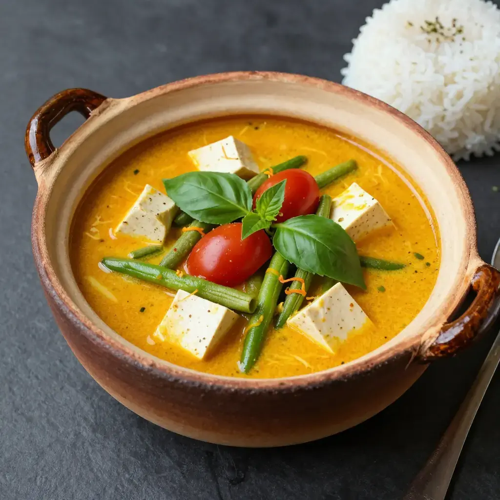 # Gaeng Thua Fak Yao Jay (แกงถั่วฝักยาวเจ) This fragrant one-pot vegetarian curry from central Thailand showcases long beans (thua fak yao) braised in a light coconut milk broth with fresh red curry paste. It is a staple of Thai Buddhist festival cooking — simple, satisfying, and ready in under 30 minutes. Serves: 4 ## Ingredients - 300g (10.5 oz) long beans (snake beans), cut into 5cm (2 inch) lengths - 400ml (14 fl oz) can full-fat coconut milk - 200ml (7 fl oz) water or vegetable stock - 3 tbsp (45g) Thai red curry paste (look for a vegan brand, or homemade without shrimp paste) - 200g (7 oz) firm tofu, cut into 2cm cubes - 2 tbsp (30ml) soy sauce (or tamari) - 1 tbsp (15g) palm sugar (or brown sugar) - 4 kaffir lime leaves, torn - 2 stalks lemongrass, bruised and tied in a knot - 1 thumb fresh galangal (20g/0.7 oz), sliced - 100g (3.5 oz) cherry tomatoes, halved - Large handful fresh Thai basil - 1 long red chilli, sliced, to garnish - Steamed jasmine rice, to serve ## Instructions 1. Open the coconut milk and scoop the thick cream from the top into a wok or medium saucepan. Heat over medium-high until the cream begins to bubble and separate (3–4 minutes). 2. Add the red curry paste and fry in the coconut cream for 2–3 minutes, stirring constantly, until fragrant and the oil separates visibly. 3. Pour in remaining coconut milk and water/stock. Add lemongrass, galangal, and kaffir lime leaves. Bring to a gentle simmer. 4. Add long beans and tofu. Simmer uncovered for 8–10 minutes, until the beans are just tender but still have bite. 5. Season with soy sauce and palm sugar. Add cherry tomatoes and cook 2 minutes more. 6. Remove from heat, fold in Thai basil. Discard lemongrass stalks. Garnish with sliced chilli and serve over jasmine rice. **Cook's Notes:** Long beans hold up far better than green beans in curry — they absorb the coconut broth beautifully without going mushy. Verify your curry paste is truly vegan (many contain shrimp paste). Gaeng Jay means the dish meets Thai Buddhist vegan requirements.Images