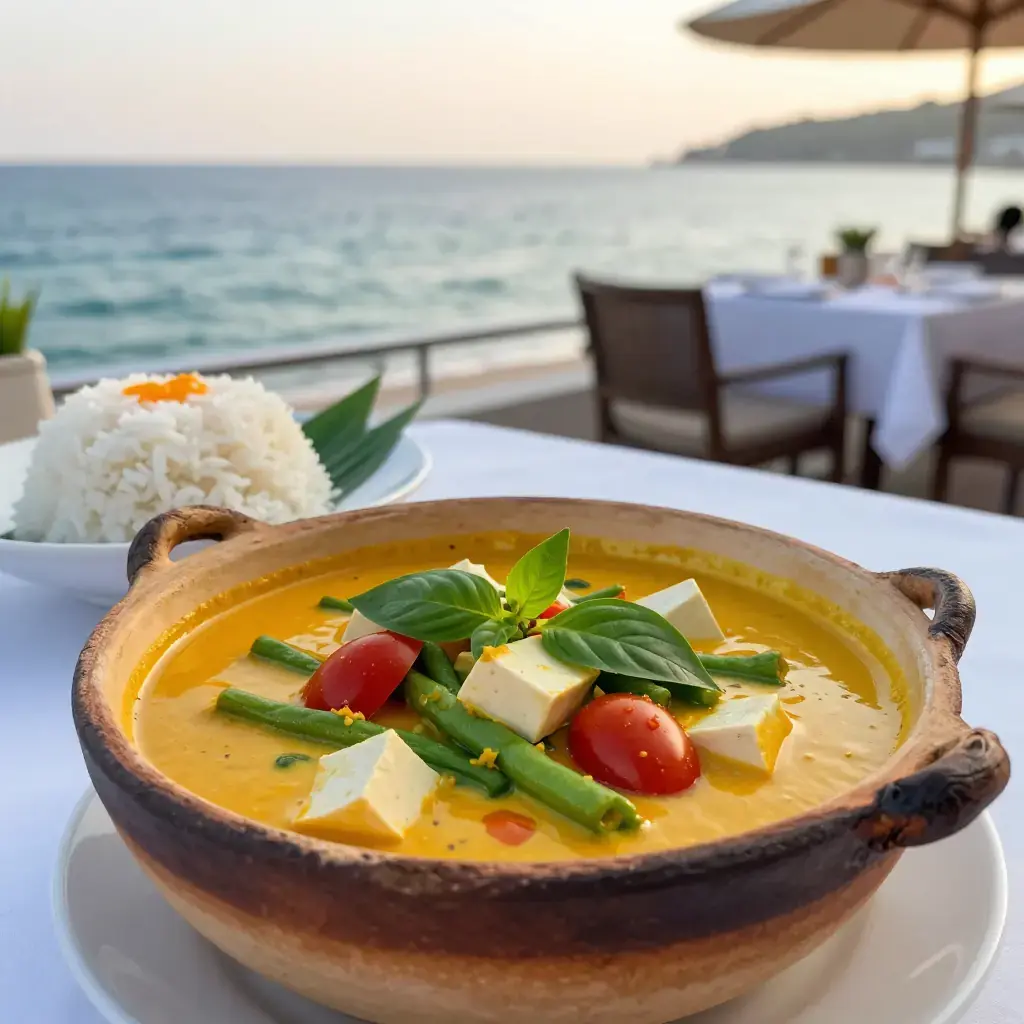 This fragrant one-pot vegetarian curry from central Thailand showcases long beans (thua fak yao) braised in a light coconut milk broth with fresh red curry paste. It is a staple of Thai Buddhist festival cooking — simple, satisfying, and ready in under 30 minutes.