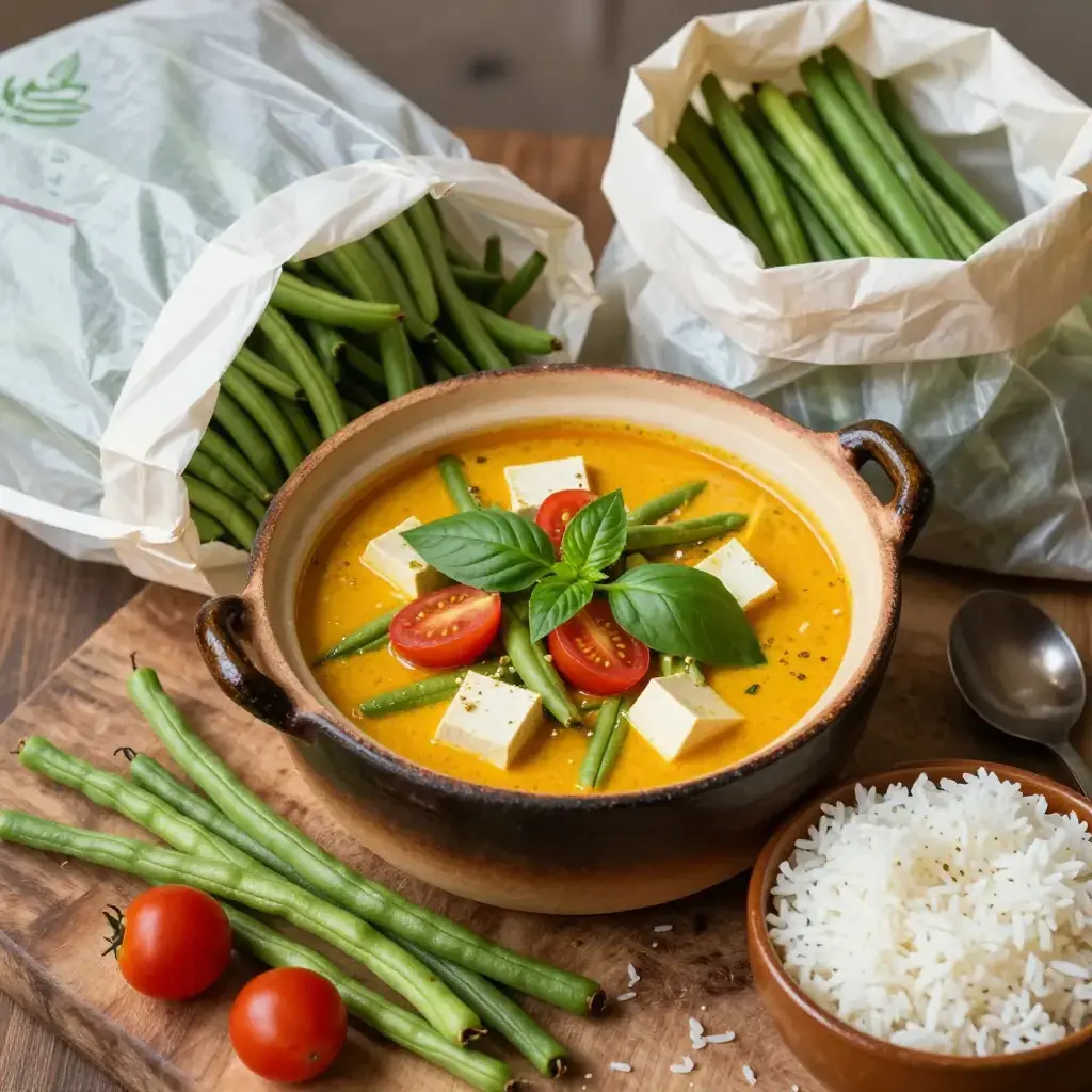 Cook's Notes: Long beans hold up far better than green beans in curry — they absorb the coconut broth beautifully without going mushy. Verify your curry paste is truly vegan (many contain shrimp paste). Gaeng Jay means the dish meets Thai Buddhist vegan requirements.