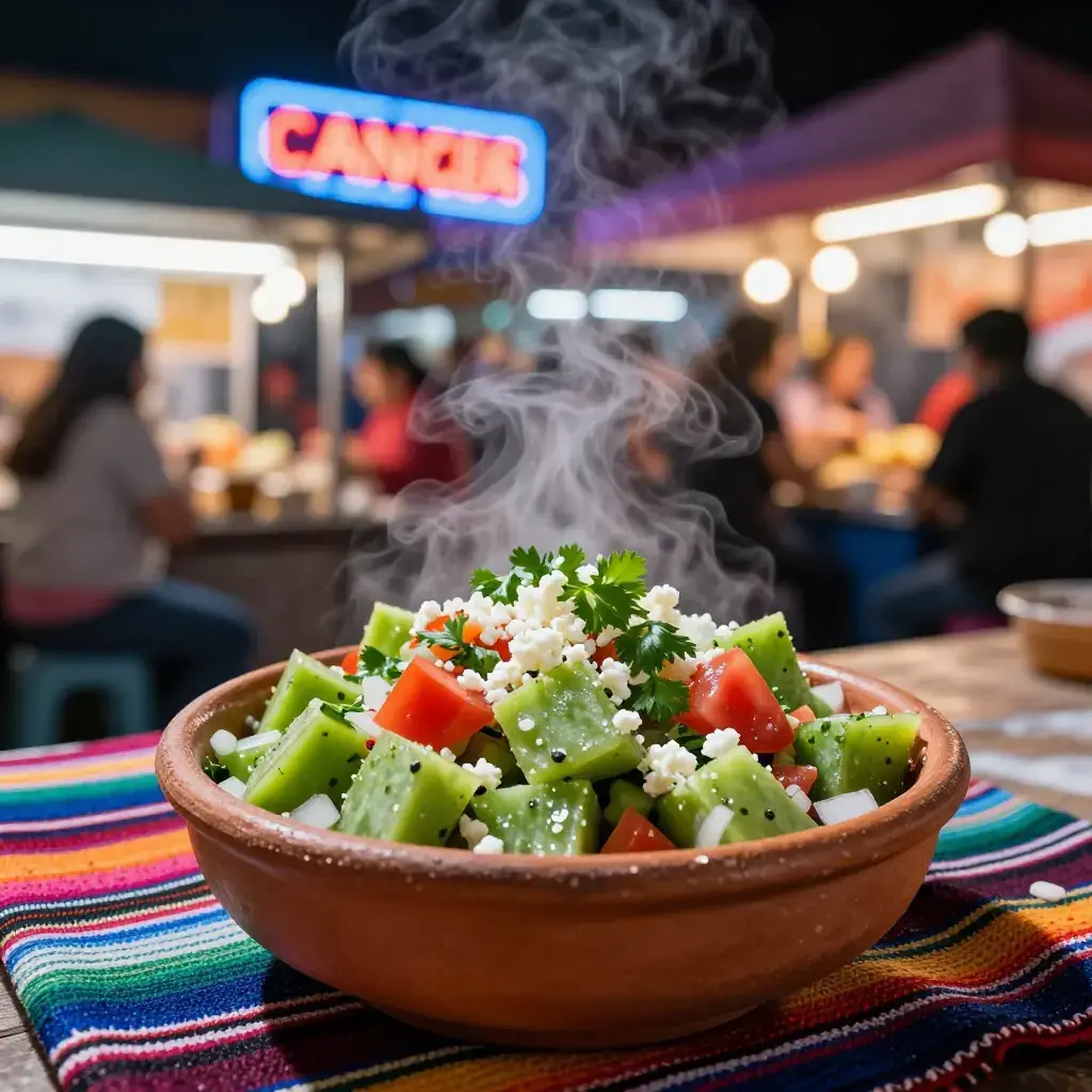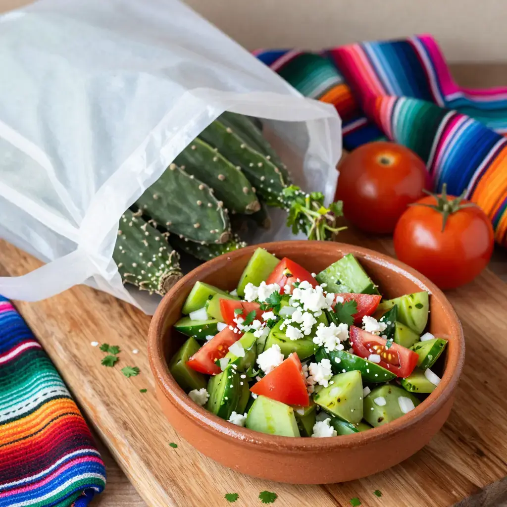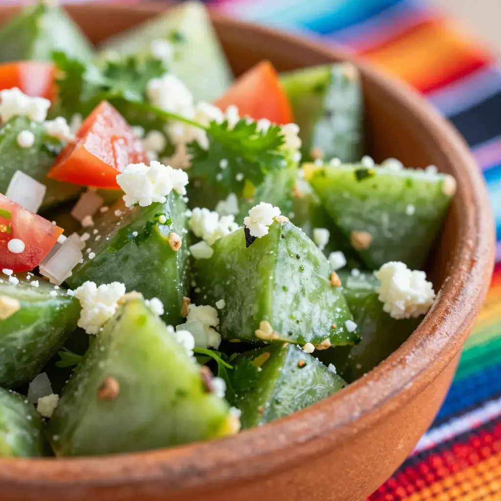 Ensalada de Nopales is a staple of everyday Mexican cooking, particularly in central Mexico, where cactus paddles are boiled, cooled, and tossed with tomatoes, onion, and coriander. It is nutritious, hydrating, and served at room temperature as a side or light lunch.