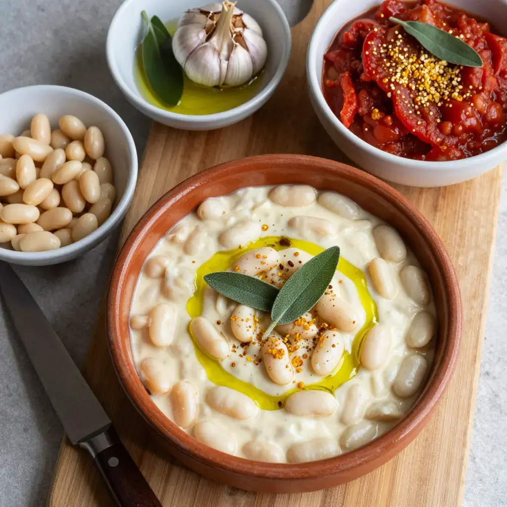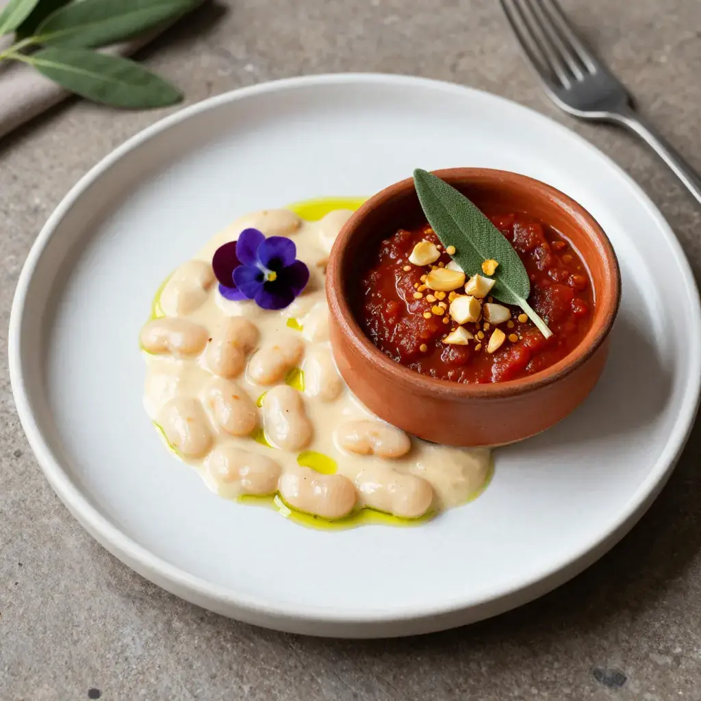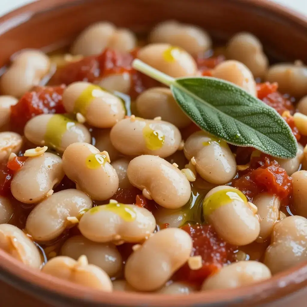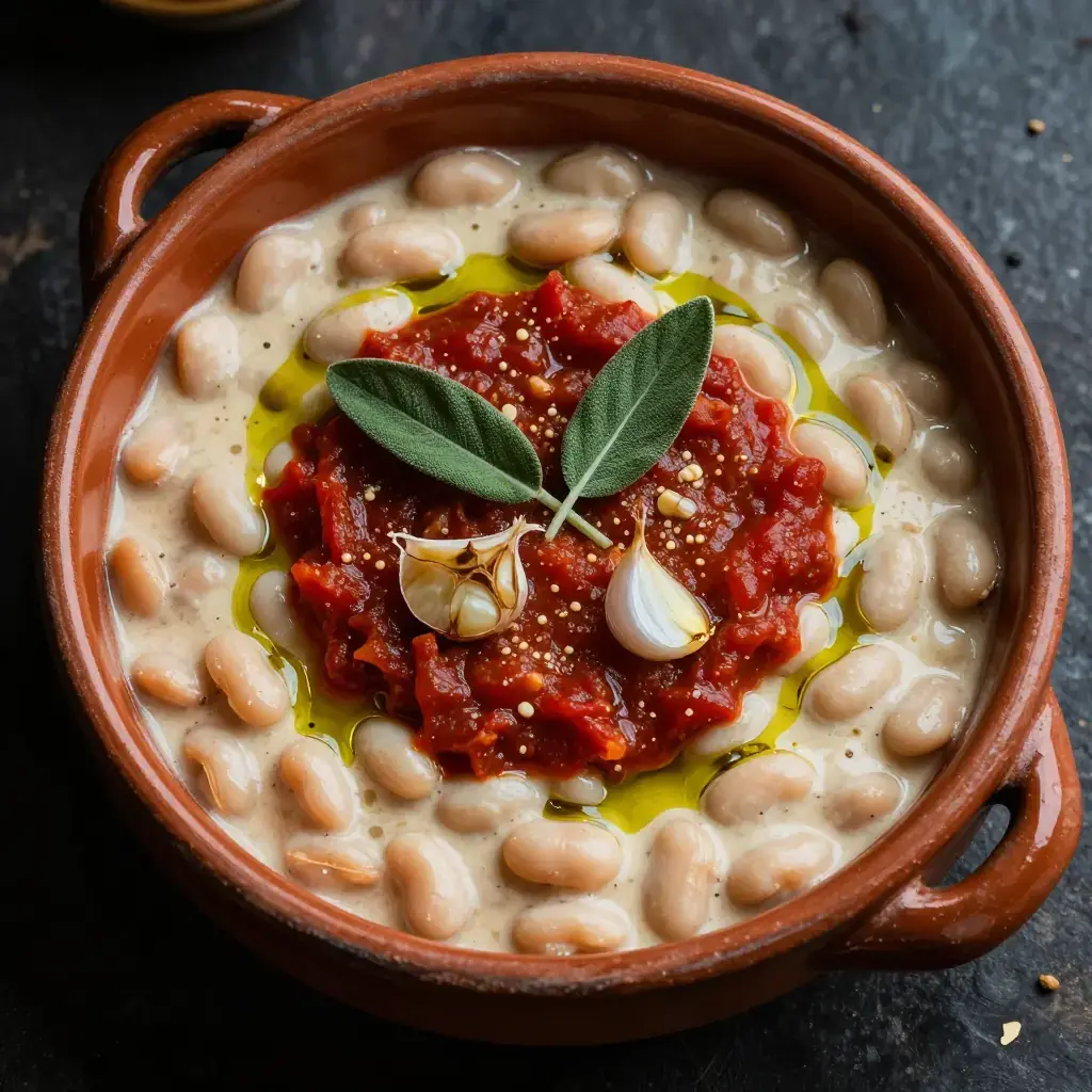 # Fagioli all'Uccelletto Fagioli all'Uccelletto — "beans cooked like small birds" — is a quintessential Florentine preparation in which cannellini beans are braised with sage, garlic, and tomato until silky and flavourful. Despite its poetic name, this is pure peasant food, deeply embedded in Tuscan identity. Serves: 4 ## Ingredients - 400g (14 oz) dried cannellini beans, soaked overnight, or 2 x 400g cans, drained - 60ml (¼ cup) extra virgin olive oil, plus more to finish - 4 cloves garlic, lightly crushed - 8 fresh sage leaves - 300g (10.5 oz) canned San Marzano tomatoes, crushed by hand - ½ tsp chilli flakes (optional) - Salt and black pepper - Water or vegetable stock, as needed ## Instructions 1. If using dried beans: boil soaked beans in unsalted water for 50-70 minutes until just tender. Drain, reserving cooking liquid. 2. In a wide, heavy casserole or sauté pan, warm olive oil over medium-low heat. Add garlic and sage. Cook gently until garlic turns pale gold, 3-4 minutes. 3. Add crushed tomatoes and chilli flakes if using. Cook 10 minutes, stirring occasionally, until the sauce darkens slightly. 4. Add drained beans. Stir well to coat. Add 120ml (½ cup) of bean cooking liquid or stock. Simmer uncovered on low heat for 20-25 minutes until the beans absorb the sauce and are very creamy. 5. Season well. Finish with a generous pour of raw olive oil and several grinds of black pepper. **Cook's Notes:** The sage is essential and not optional. Use fresh sage — dried does not give the same result. These beans are equally good at room temperature, served alongside grilled sausages or pork ribs.Images