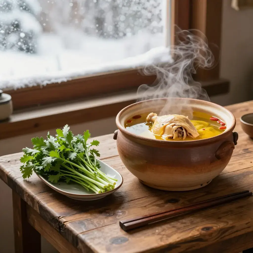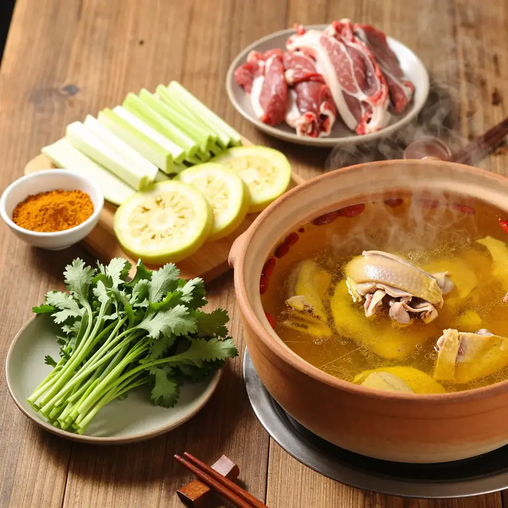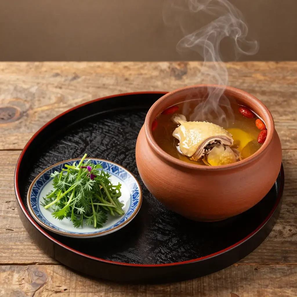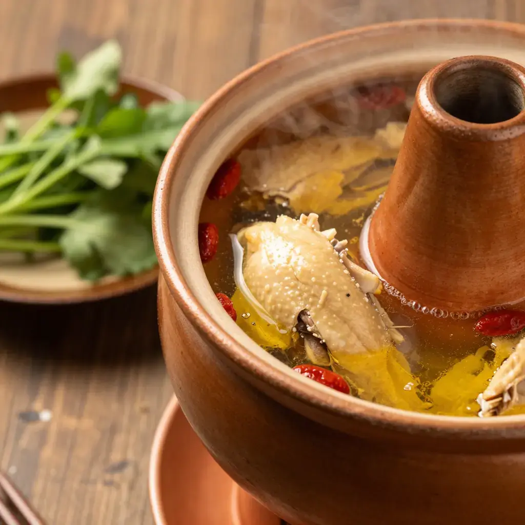 Qi guo ji — steam-pot chicken — is Yunnan's most celebrated dish, cooked in a unique clay pot with a central chimney that allows steam to rise through the chicken and condense into a supremely pure, herbal broth. The dish has been prepared in Kunming for over 200 years and epitomises Yunnan's emphasis on clean, herb-forward flavours.