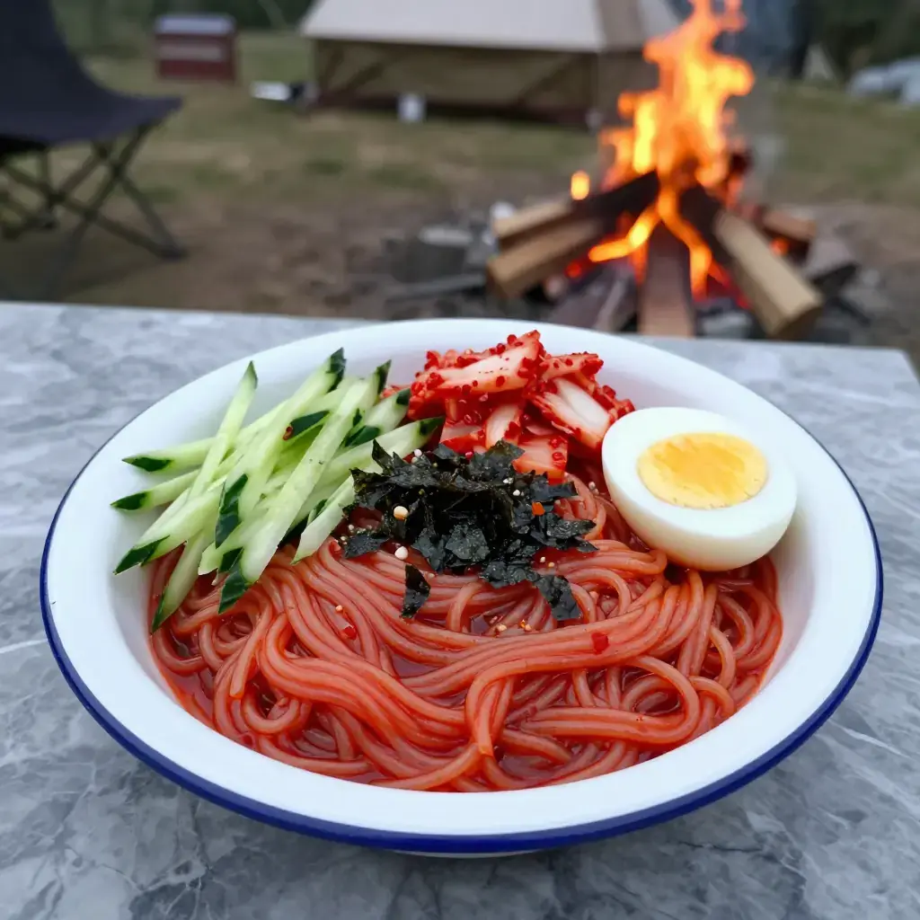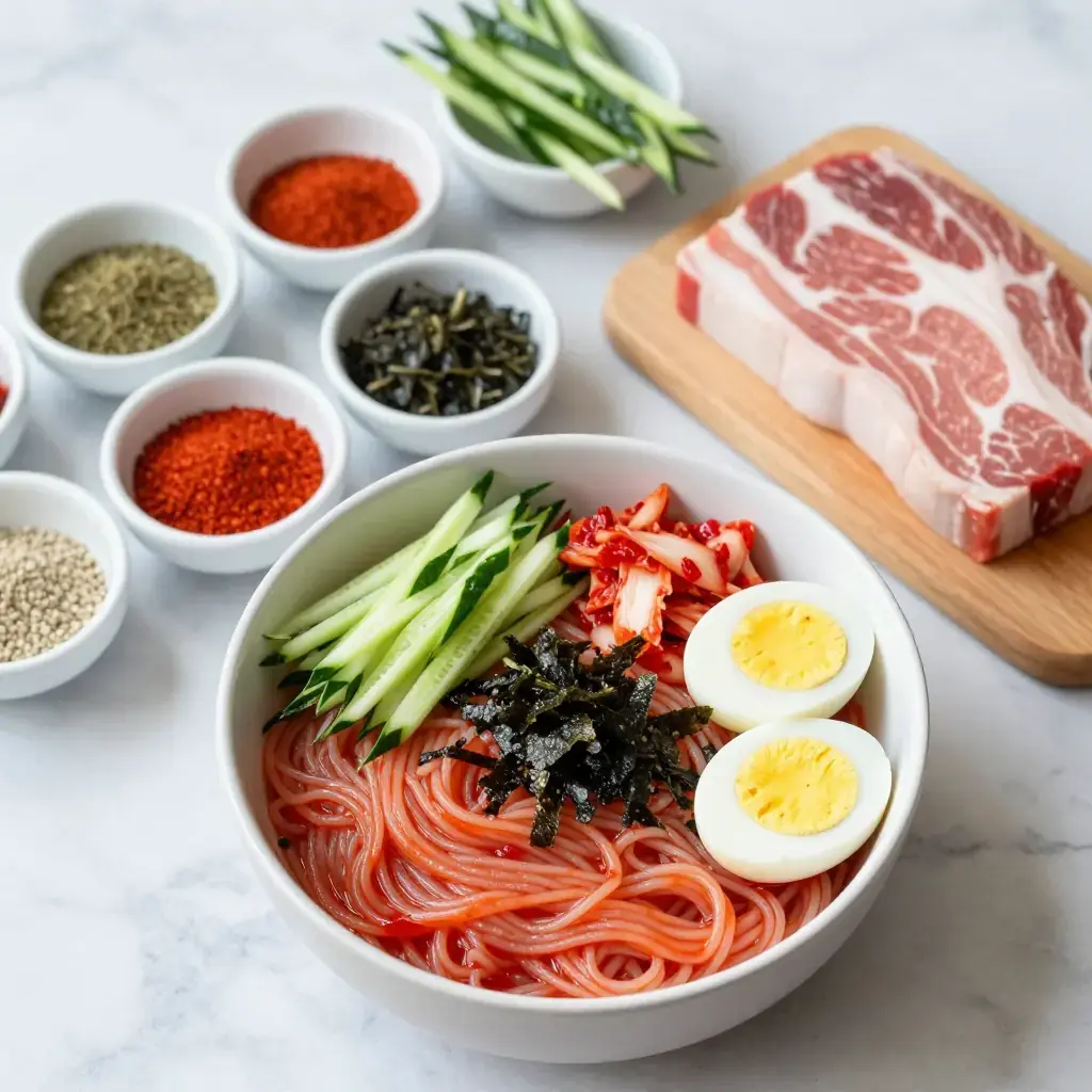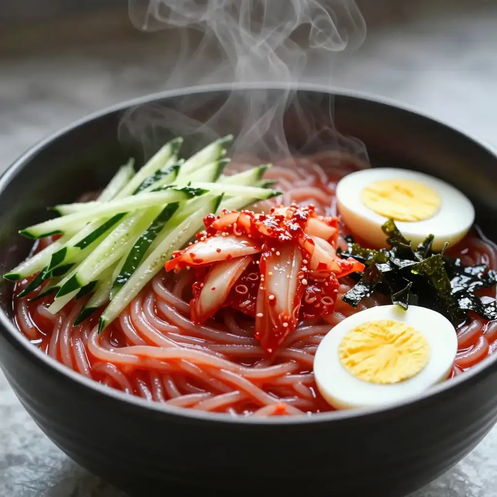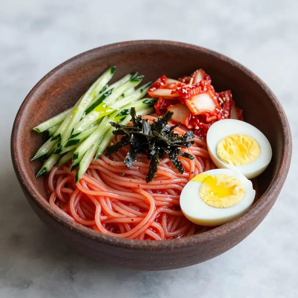 # Bibim Guksu (비빔국수) Bibim guksu is Korea's quintessential summer noodle dish — thin somyeon wheat noodles chilled under cold running water, then tossed in a fiery, tangy gochujang dressing with crisp vegetables. Quick to assemble, it is the dish Korean home cooks reach for on sweltering days when they want maximum flavour with minimal heat near the stove. Serves: 4 ## Ingredients - 400g (14 oz) somyeon (thin wheat noodles) or vermicelli - 3 tbsp (45ml) gochujang - 2 tbsp (30ml) rice vinegar - 1 tbsp (15ml) soy sauce - 1 tbsp (15ml) sesame oil - 1 tbsp (15g) sugar - 2 tsp (10ml) sesame seeds, toasted - 1 tsp minced garlic - 100g (3.5 oz) cucumber, julienned - 100g (3.5 oz) kimchi, roughly chopped - 2 hard-boiled eggs, halved - 4 sheets gim (dried seaweed), crumbled - Ice cubes for chilling ## Instructions 1. Whisk together gochujang, rice vinegar, soy sauce, sesame oil, sugar, garlic, and 1 tsp sesame seeds to make the dressing. Taste and adjust — it should be spicy, sour, and slightly sweet. 2. Cook noodles according to package directions (typically 2–3 minutes). Drain and rinse immediately under cold running water, rubbing noodles between your palms to remove starch. Drain well. 3. Toss cold noodles with the dressing until evenly coated. 4. Divide noodles into four bowls. Top each with cucumber, kimchi, a halved egg, crumbled gim, and remaining sesame seeds. 5. Serve immediately with a few ice cubes in the bowl if the weather is very hot. **Cook's Notes:** The dressing keeps refrigerated for up to a week — make extra. For a milder version, reduce gochujang by half and add 1 tbsp of honey. Adding sliced chilled watermelon alongside is a beloved Korean summer pairing.Images