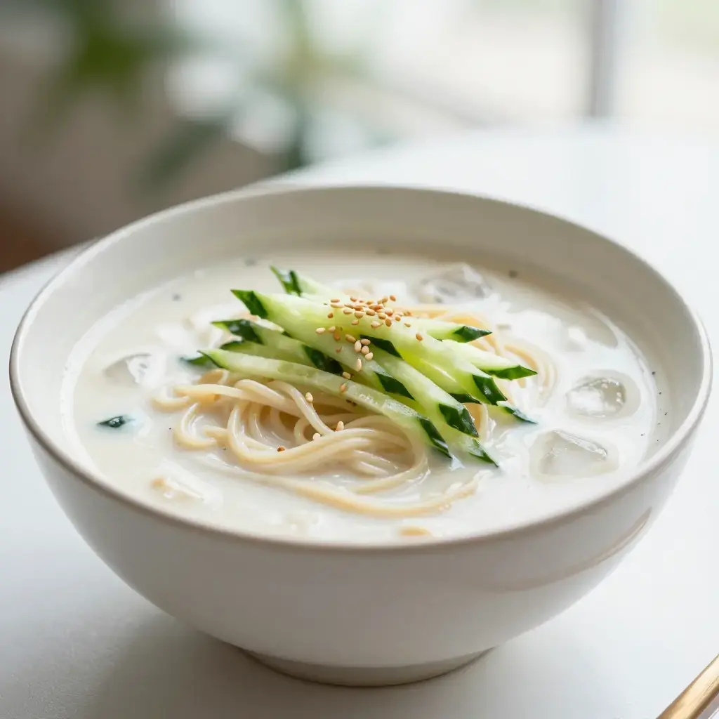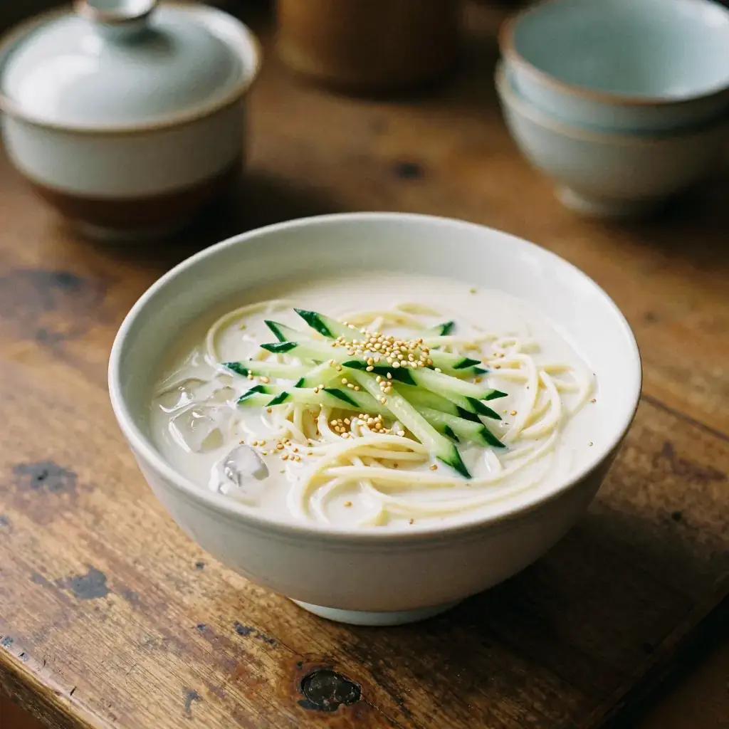 Kongguksu is the cooling antidote to the Korean summer — silky wheat noodles submerged in a creamy, nutty cold soybean broth that requires no cooking beyond soaking and blending. It is a dish of extraordinary simplicity beloved in Seoul and the Korean countryside alike, served from late June through August when soybeans are at their peak.
