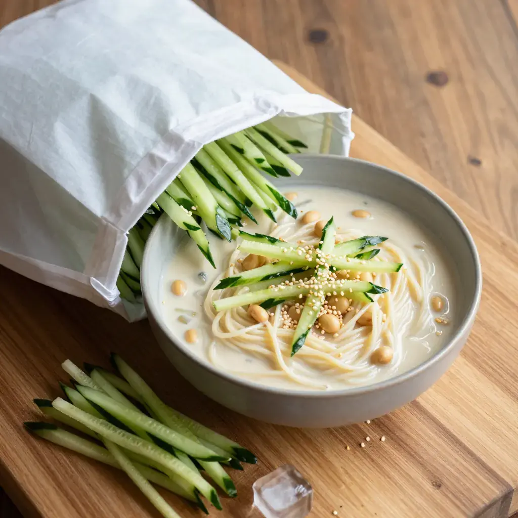 - Divide noodles into four deep bowls. Pour the cold soybean broth generously over the noodles. Top with cucumber, a pinch of sesame seeds, and a few pine nuts. Add ice cubes if desired and serve immediately.