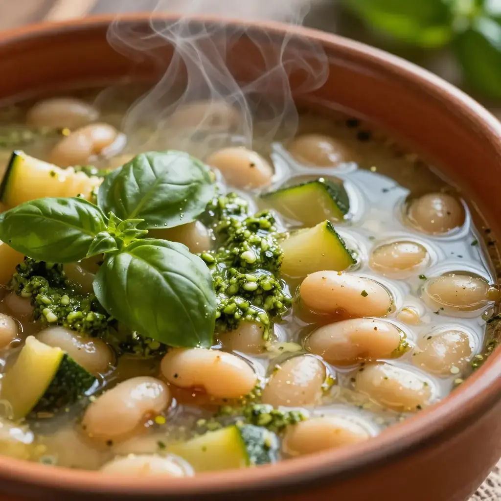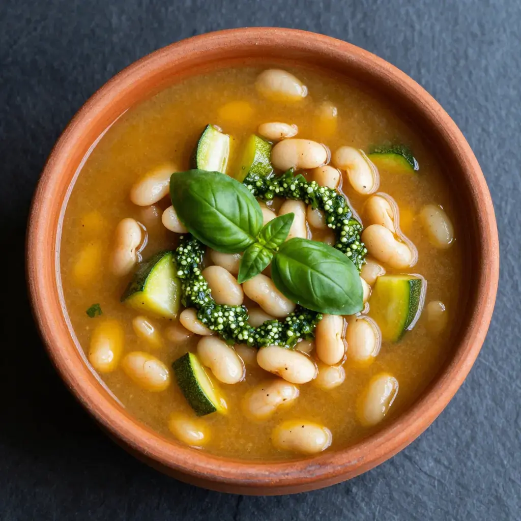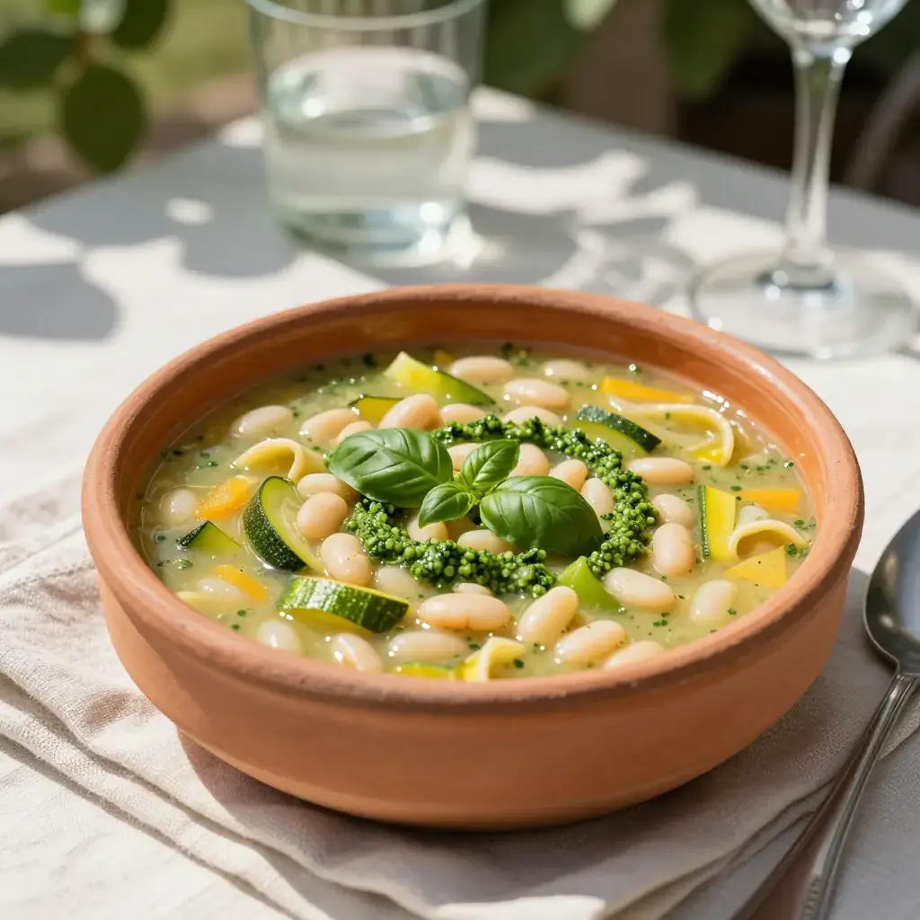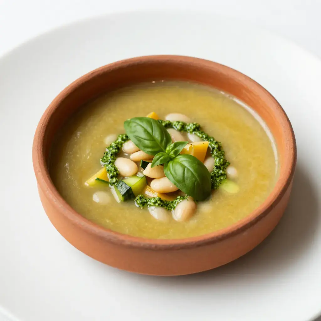 Soupe au pistou is the great summer soup of Provence, a celebration of the garden at its peak. Unlike its Italian cousin minestrone, it is defined by the pistou — the Provençal version of pesto, made without pine nuts — stirred in at the last moment, transforming a humble bean and vegetable broth into something extraordinary. Every family has their version; this is the classic.