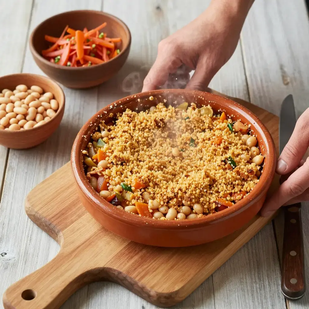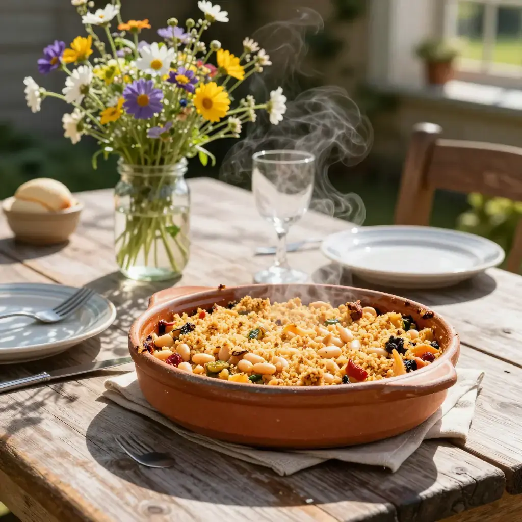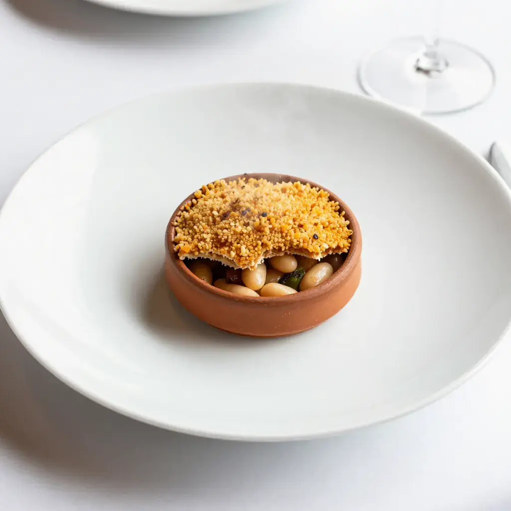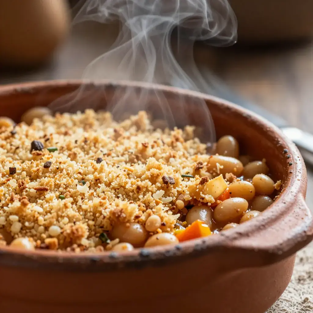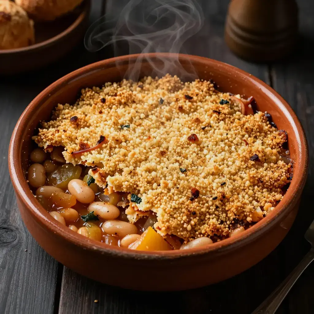 Cassoulet is the grand slow-cooked casserole of Languedoc — normally a fortress of confit duck, pork, and sausage. This vegetarian version, using the prized haricots tarbais (large flat white beans from the Bigorre region) as its centrepiece, keeps the soul of the dish: the deep, caramelized crust formed by repeated breaking and reforming of the breadcrumb gratin over hours of oven-cooking.