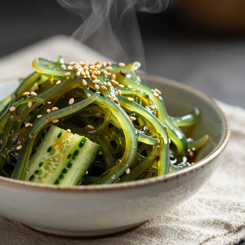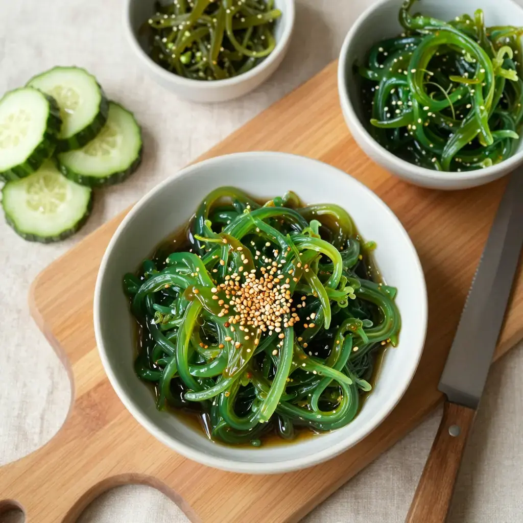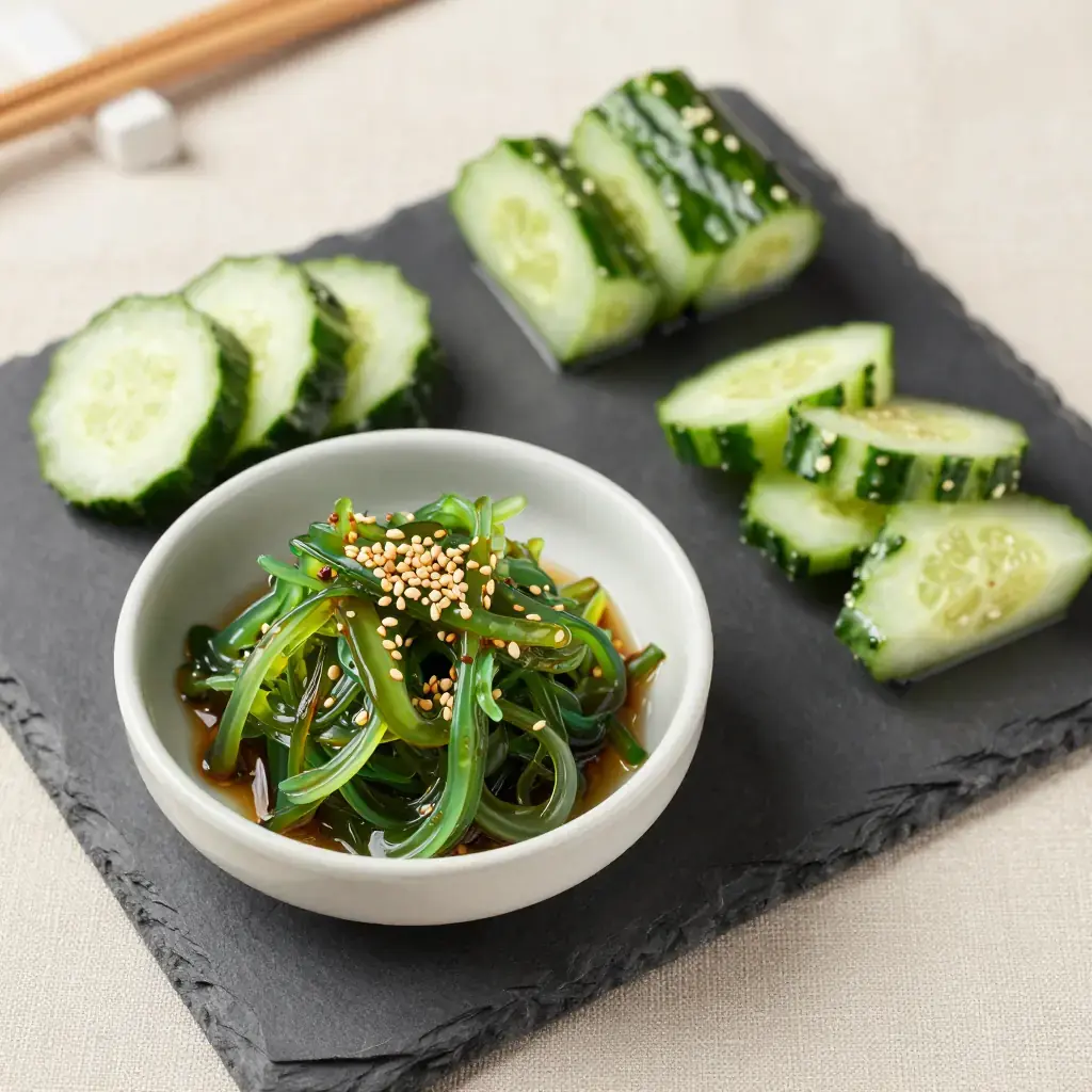 Sunomono — literally "vinegared things" — are the crisp, refreshing small salads that appear at nearly every Japanese meal as a palate cleanser. This version combines smashed cucumbers, which absorb the dressing more deeply than sliced ones, with silky rehydrated wakame seaweed in a classic sanbaizu (three-flavour vinegar) dressing.