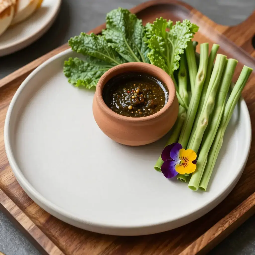 - Arrange the dip in a small bowl surrounded by the raw and blanched vegetables on a large plate. Serve with rice.