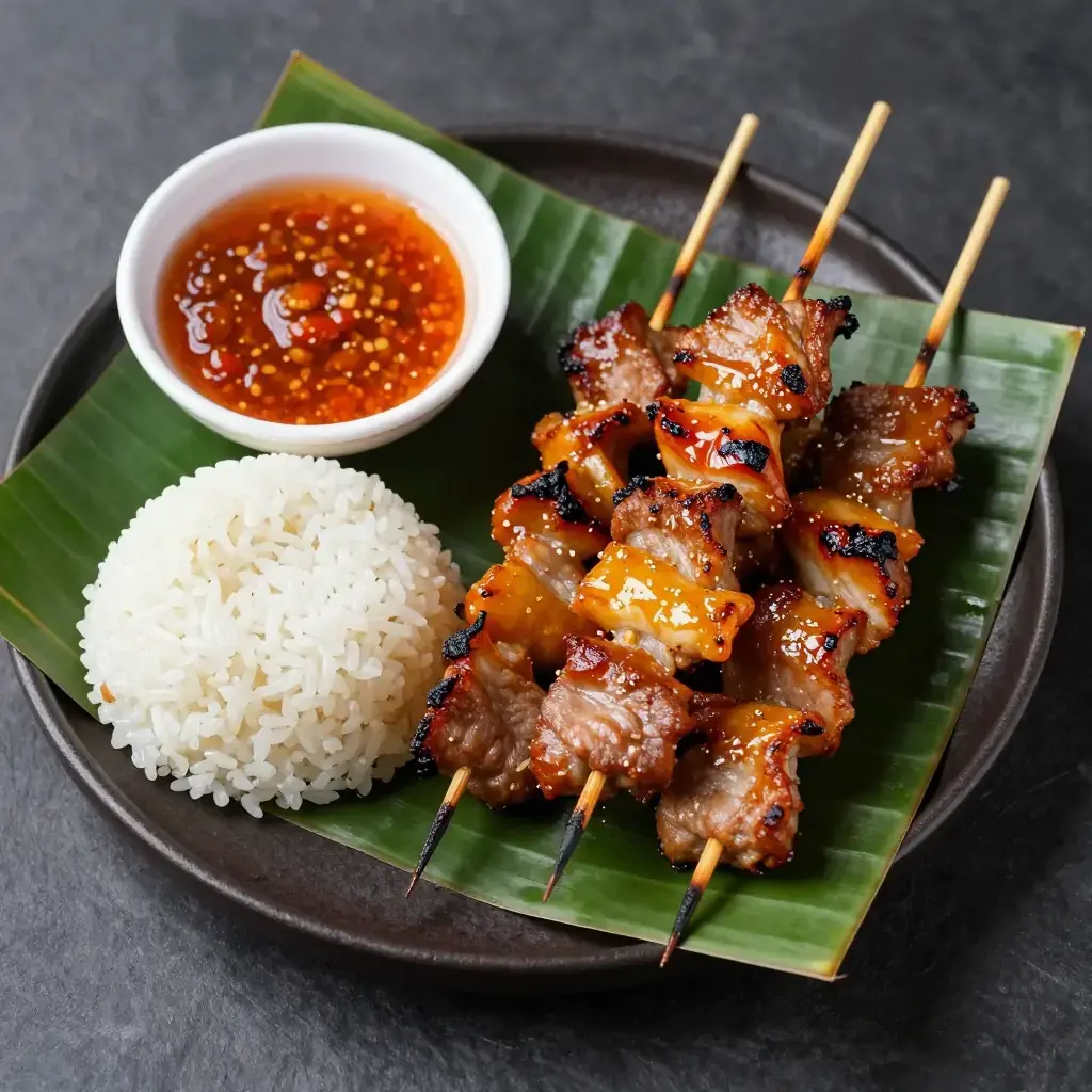 # Moo Ping Moo ping is Thailand's most beloved street-food-turned-comfort-food — coconut-milk-marinated pork skewers grilled over charcoal, caramelised and smoky, eaten from a stick with sticky rice. Every market, every temple fair, every morning food cart has a version. Serves: 4 ## Ingredients - 500g (1.1 lb) pork shoulder or neck, sliced 1cm (0.4 in) thick against the grain - 200ml (3/4 cup) full-fat coconut milk - 3 tbsp (45ml) fish sauce - 2 tbsp (30g) palm sugar or light brown sugar - 2 tbsp (30ml) oyster sauce - 4 cloves garlic, minced - 1 tsp (5g) white pepper - 1 tsp (5g) coriander root, finely pounded (or 1/2 tsp ground coriander) - Bamboo skewers, soaked in water 30 minutes - Cooked glutinous rice and sweet chilli sauce, to serve ## Instructions 1. Combine coconut milk, fish sauce, palm sugar, oyster sauce, garlic, white pepper, and coriander root in a bowl. Stir until sugar dissolves. 2. Add pork slices, toss well to coat, and marinate in the refrigerator for at least 2 hours, or overnight for best flavour. 3. Thread 2-3 pork pieces per skewer in a flat, even layer so they cook uniformly. 4. Prepare a charcoal grill or griddle pan over medium-high heat. Grill skewers 3-4 minutes per side, basting with reserved marinade (bring it to a boil first if basting directly). 5. Cook until the edges are lightly charred and the pork is cooked through with caramelised patches, about 8-10 minutes total. 6. Serve hot with balls of sticky rice and sweet chilli dipping sauce. **Cook's Notes:** The coconut milk acts as both tenderiser and basting liquid, creating a lacquered, slightly sweet exterior. Palm sugar is essential for authentic caramelisation — brown sugar is a reasonable substitute.Images