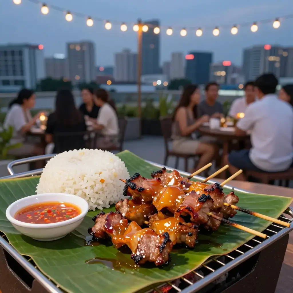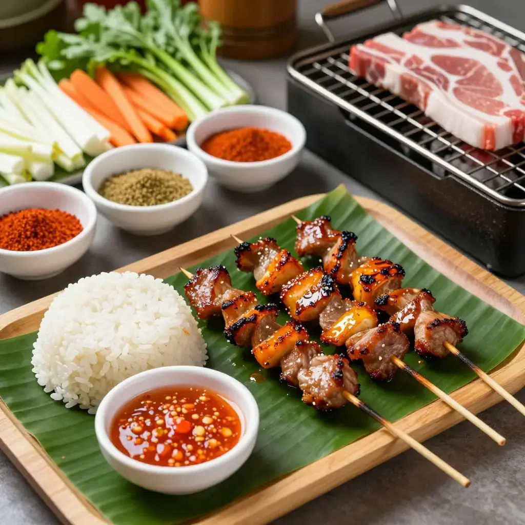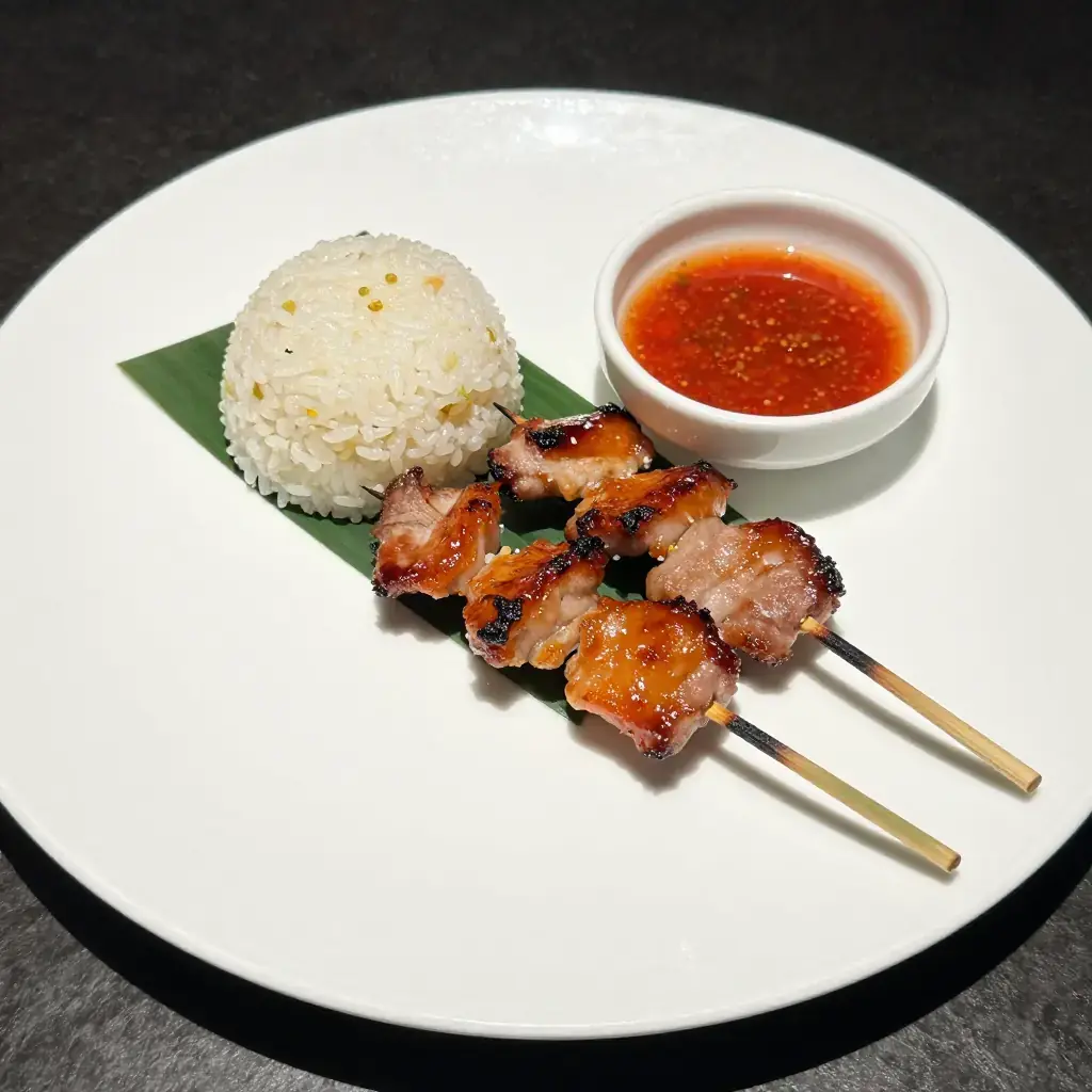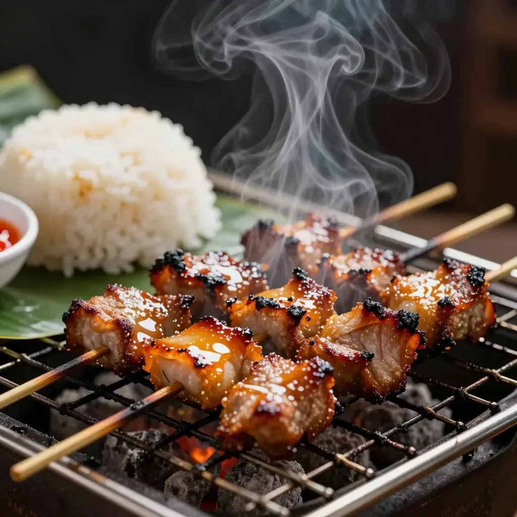 Moo ping is Thailand's most beloved street-food-turned-comfort-food — coconut-milk-marinated pork skewers grilled over charcoal, caramelised and smoky, eaten from a stick with sticky rice. Every market, every temple fair, every morning food cart has a version.