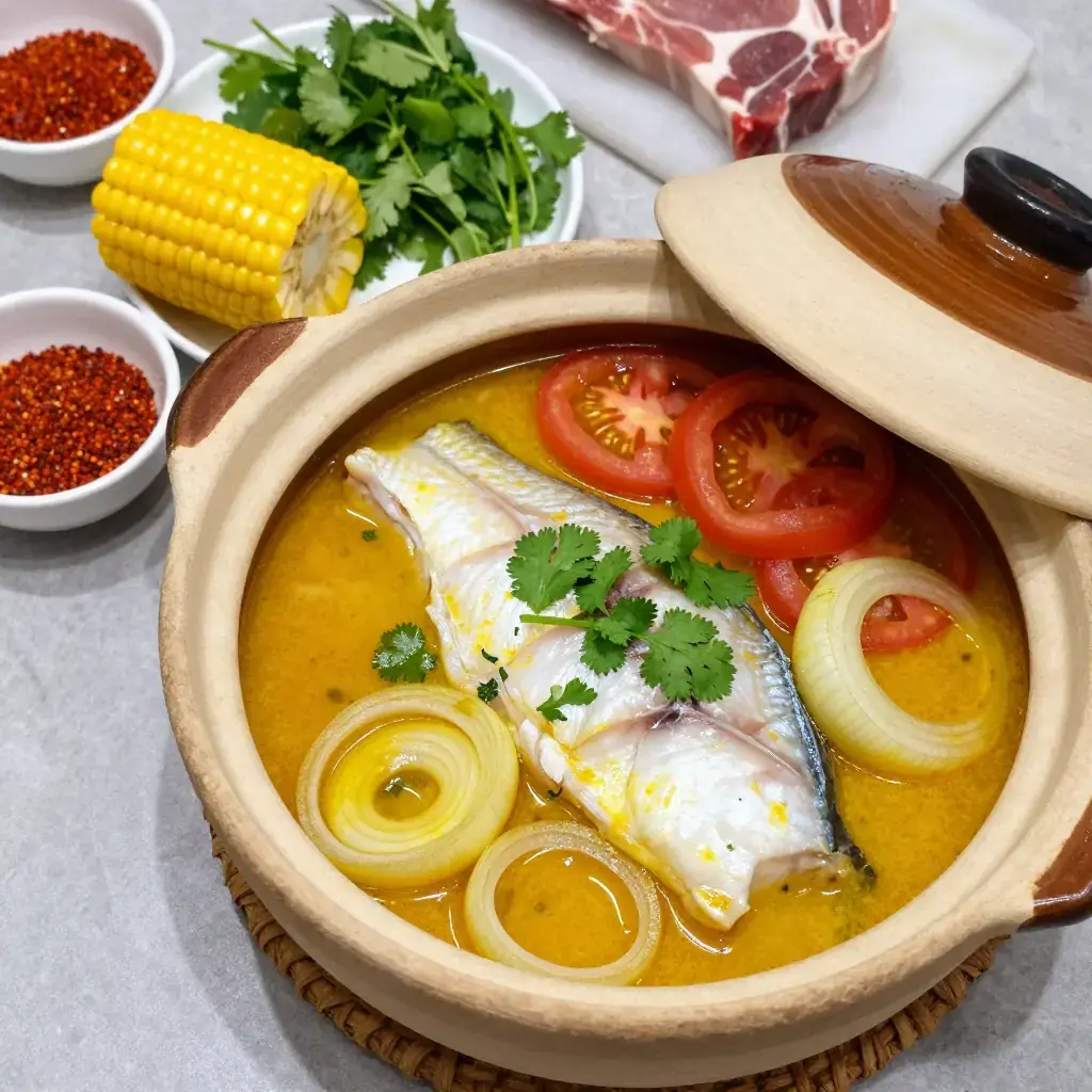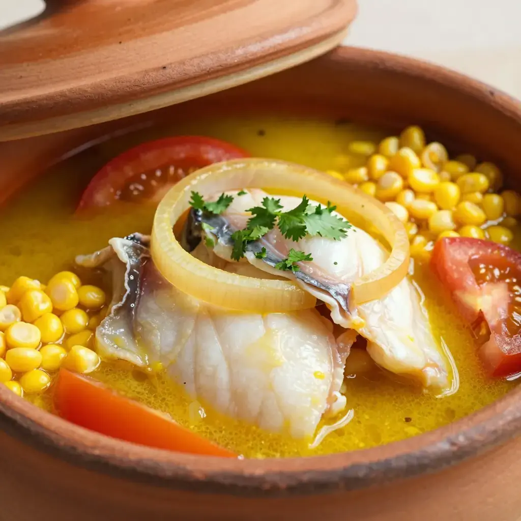 # Sudado de Corvina Sudado — meaning 'sweated' — is one of Peru's most ancient coastal preparations. A whole fish or fillets are steamed over a fragrant broth of aji amarillo, tomato, and chicha de jora (fermented corn beer), absorbing flavour from the steam rather than submerging in liquid. The result is extraordinarily delicate flesh perfumed with the floral heat of the aji. Along the Lima coast it is eaten straight from the pot with choclo corn and sweet potato. Serves: 4 ## Ingredients - 800g (1¾ lb) firm white fish fillets (corvina, sea bass, or snapper), in large pieces - 2 tbsp vegetable oil - 1 large red onion, sliced into rings - 3 garlic cloves, minced - 2 tbsp aji amarillo paste - 1 tbsp aji panca paste - 2 medium plum tomatoes, sliced - 200ml (¾ cup) chicha de jora or dry white wine - 1 tbsp soy sauce - 1 tsp cumin - Salt and black pepper - Fresh coriander (cilantro), roughly torn - Cooked choclo corn or sweetcorn, to serve - Boiled sweet potato, to serve ## Instructions 1. In a wide shallow pot with a tight-fitting lid, heat the oil over medium heat. Add the onion rings and cook for 5 minutes until softened. 2. Add the garlic, aji amarillo, and aji panca pastes. Stir and cook for 2 minutes until fragrant. 3. Lay the tomato slices over the onion base. Pour in the chicha de jora and soy sauce. Add the cumin and season generously with salt and pepper. 4. Bring to a gentle simmer. Lay the fish pieces on top of the vegetables — they should sit above the liquid level to steam rather than poach. 5. Cover tightly and cook over medium-low heat for 8–10 minutes, until the fish is opaque and flakes easily. 6. Scatter fresh coriander over the top and serve directly from the pot with choclo and boiled sweet potato. **Cook's Notes:** Keeping the lid sealed during cooking traps all the aromatic steam — resist the urge to peek. Chicha de jora adds a subtle fermented earthiness, but dry white wine is an excellent substitute.Images