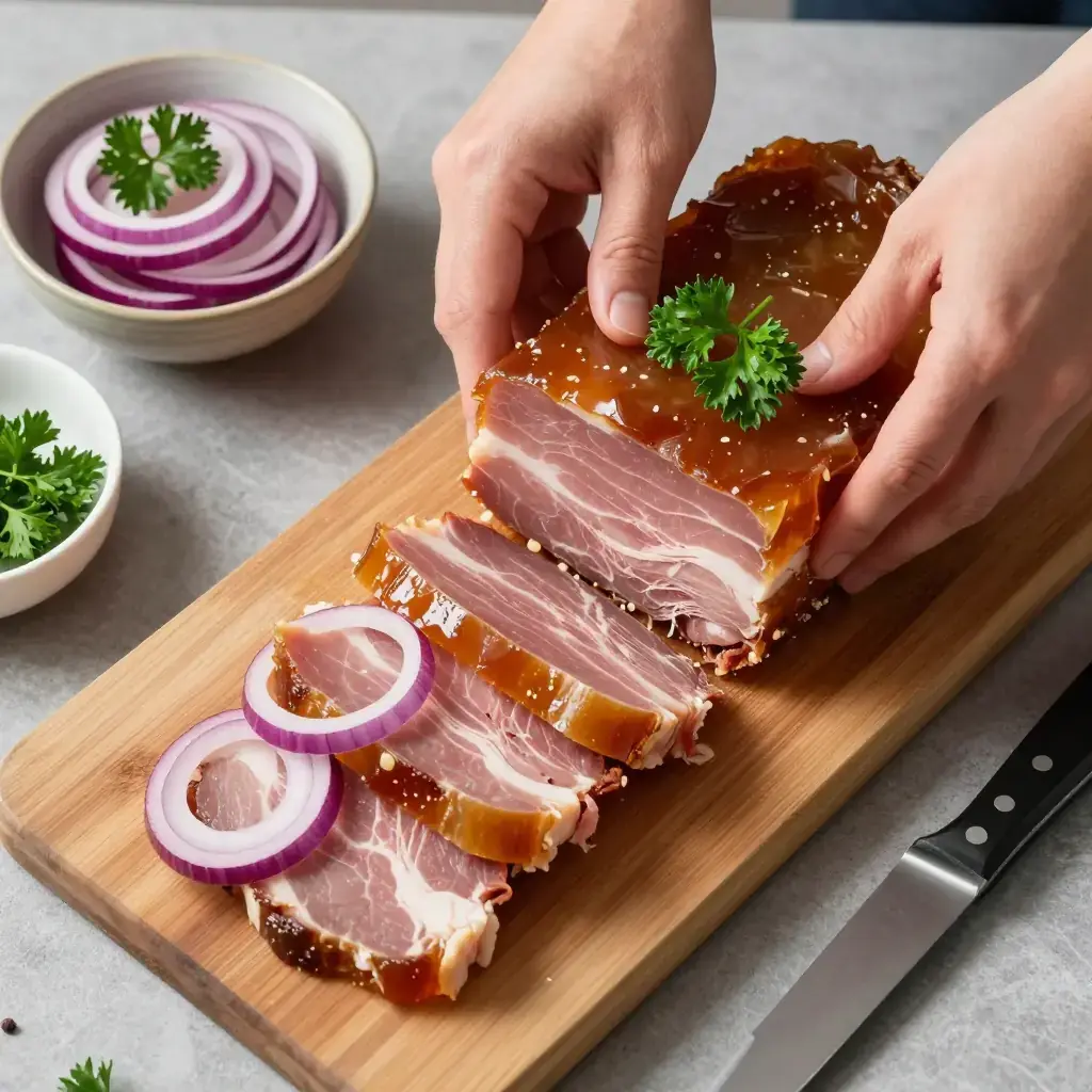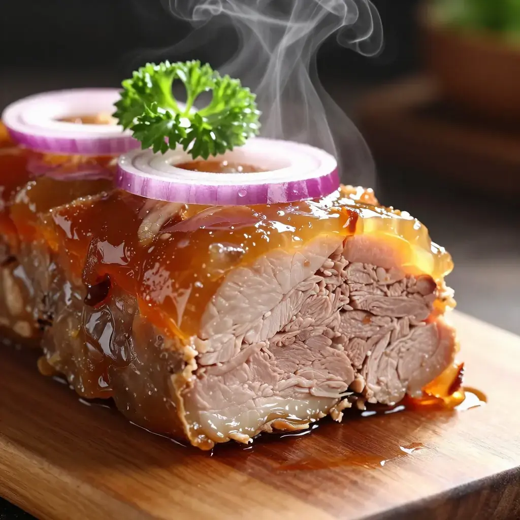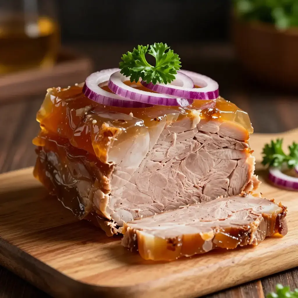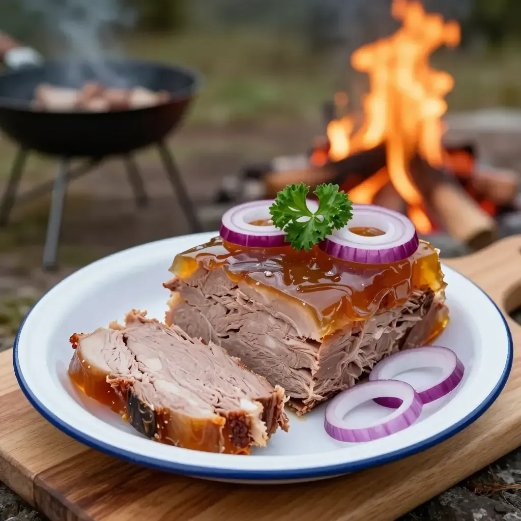 Mujuji is Georgia's ancient cold jellied pork dish, a staple of the Georgian supra feast table. Pork trotters and other cuts are boiled long and slow with aromatic vegetables until the natural gelatin sets the stock into a savory aspic. The dish is seasoned with vinegar, garlic, and coriander, then chilled overnight — producing a cold, firm terrine that is sliced and served at room temperature. It is one of the oldest preparations in the Caucasian culinary tradition.