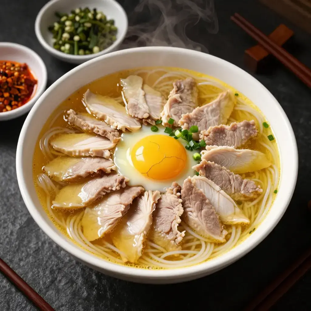 # Yunnan Guoqiao Mi Xian Guoqiao mi xian — Bridge-Crossing Rice Noodles — is Yunnan's most iconic dish, named after a legend of a scholar's devoted wife who carried a hot broth across a bridge each day. The dish arrives as a steaming pot of chicken oil-sealed broth with raw ingredients that cook tableside, a tradition dating back centuries in Mengzi. Serves: 4 ## Ingredients ### For the Broth - 1.5 kg (3.3 lb) whole chicken or chicken carcass - 100g (3.5 oz) pork ribs - 2 litres (8 cups) water - 1 tbsp (15ml) chicken fat or lard - Salt to taste ### Dipping Ingredients (per person) - 100g (3.5 oz) fresh rice noodles (mi xian) - 50g (2 oz) pork loin, sliced paper-thin - 50g (2 oz) chicken breast, sliced paper-thin - 1 egg (cracked in at the end) - Small handful bean sprouts - Small handful spinach leaves - 1 tbsp sliced spring onion - 1 tsp dried chilli flakes (optional) - 1 tsp Yunnan pickled mustard greens (zha cai), rinsed ## Instructions 1. Simmer chicken and pork ribs in water for 2 hours over low heat, skimming regularly. Strain and season the broth with salt. Stir in chicken fat — this seals the surface and keeps the broth very hot. 2. Bring the strained broth back to a vigorous boil and ladle into deep individual bowls (pre-heated). 3. Working quickly, add raw meat slices first — they cook immediately in the hot broth. 4. Add rice noodles, bean sprouts, and spinach. Crack in the egg. 5. Top with spring onion, chilli flakes, and pickled greens. Serve immediately. **Cook's Notes:** The broth must be boiling hot when served — the chicken fat seal is what keeps it hot enough to cook the raw ingredients. Pre-heat bowls in the oven. Fresh mi xian (rice noodles) are key; dried noodles should be soaked and pre-blanched.Images
