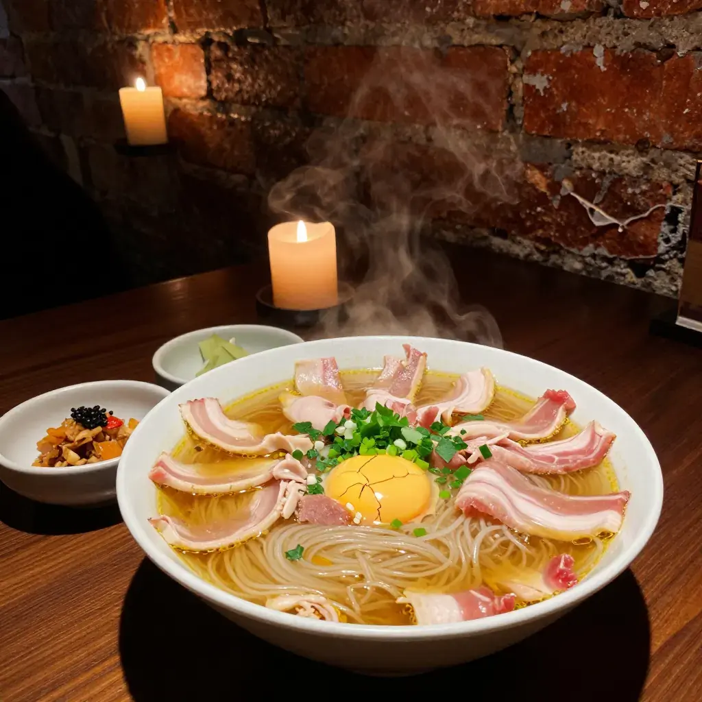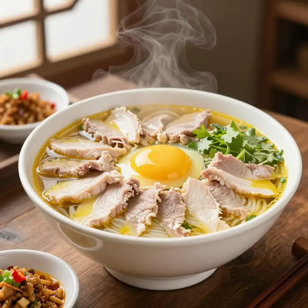 Cook's Notes: The broth must be boiling hot when served — the chicken fat seal is what keeps it hot enough to cook the raw ingredients. Pre-heat bowls in the oven. Fresh mi xian (rice noodles) are key; dried noodles should be soaked and pre-blanched.