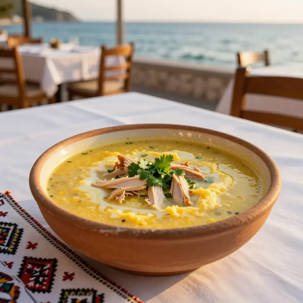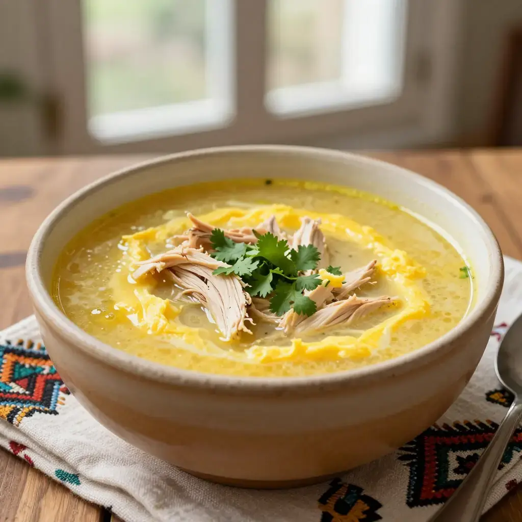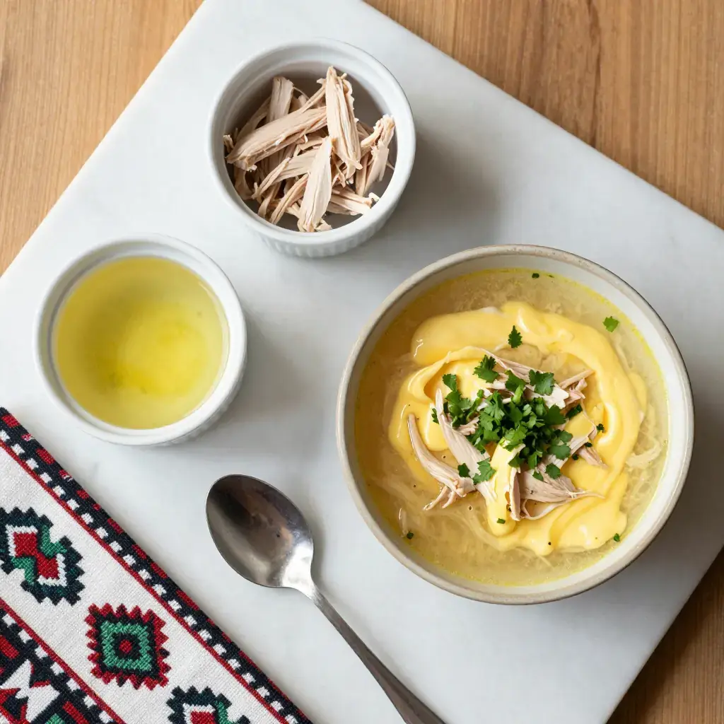 Cook's Notes: Tempering the eggs is crucial — never let the soup boil after adding them. The vinegar gives the soup its characteristic tang; adjust to taste. A teaspoon of flour whisked into the yolk mixture adds extra body if you prefer a thicker consistency.