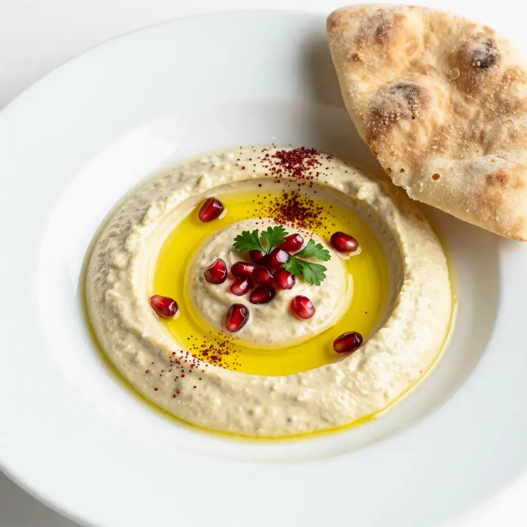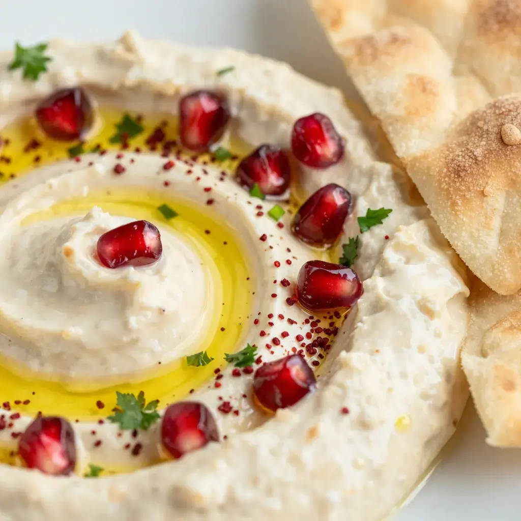 - Spread onto a shallow plate, making swirls with the back of a spoon. Drizzle generously with olive oil. Dust with sumac or paprika and scatter parsley and pomegranate seeds over the top.
