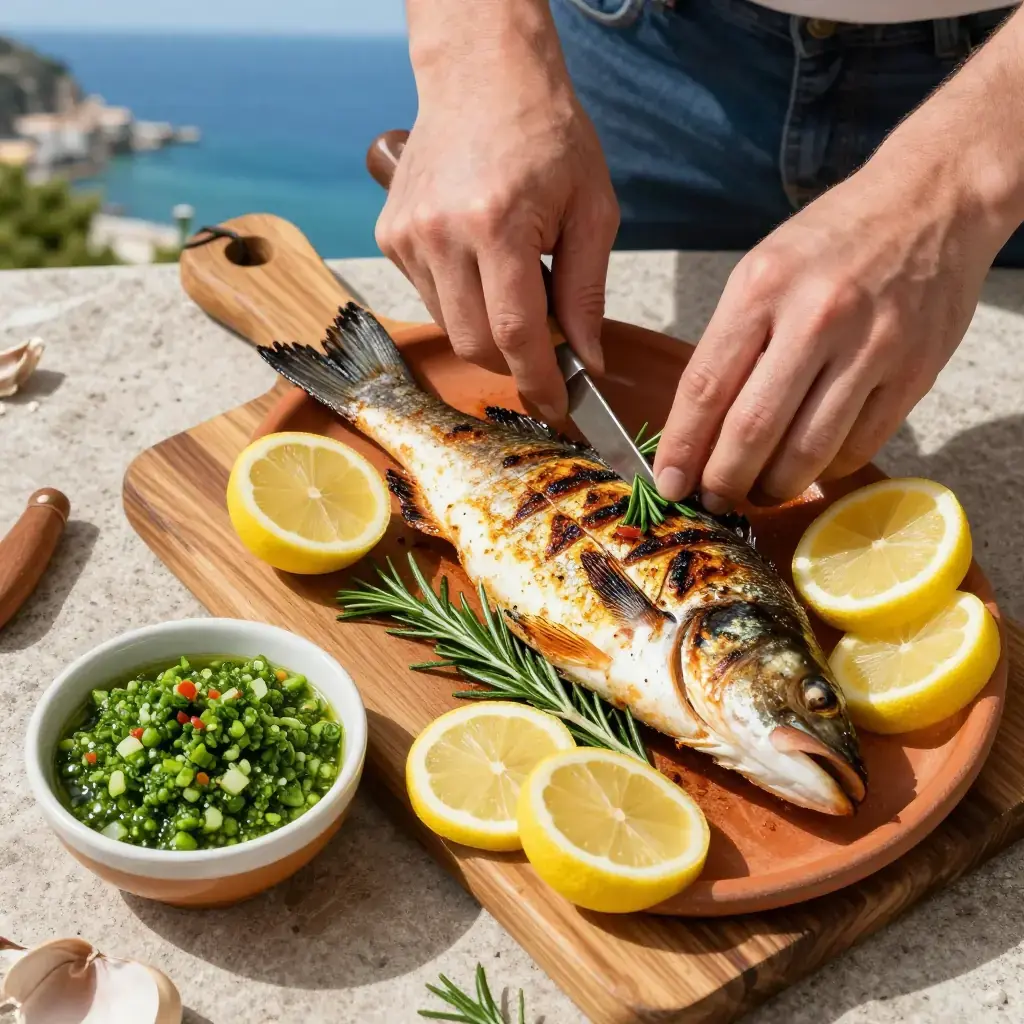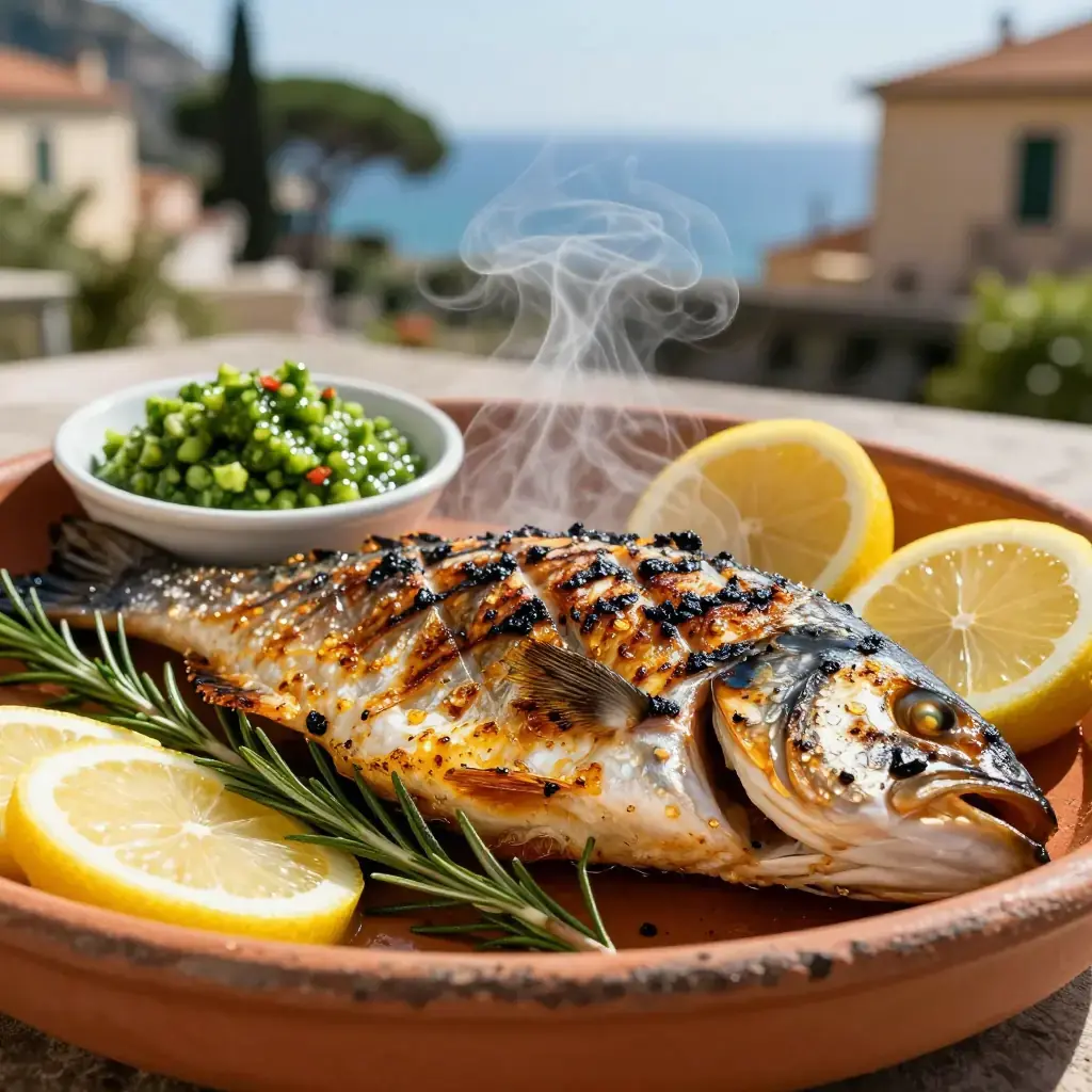 Grilling whole fish is one of Italy's oldest and most honest summer traditions, especially along the Ligurian and Tyrrhenian coasts where spigola (European sea bass) is prized for its clean, sweet flavour. The accompanying salsa verde — a punchy blend of parsley, capers, anchovies, and lemon — has been served alongside grilled fish in Italian coastal kitchens for centuries.