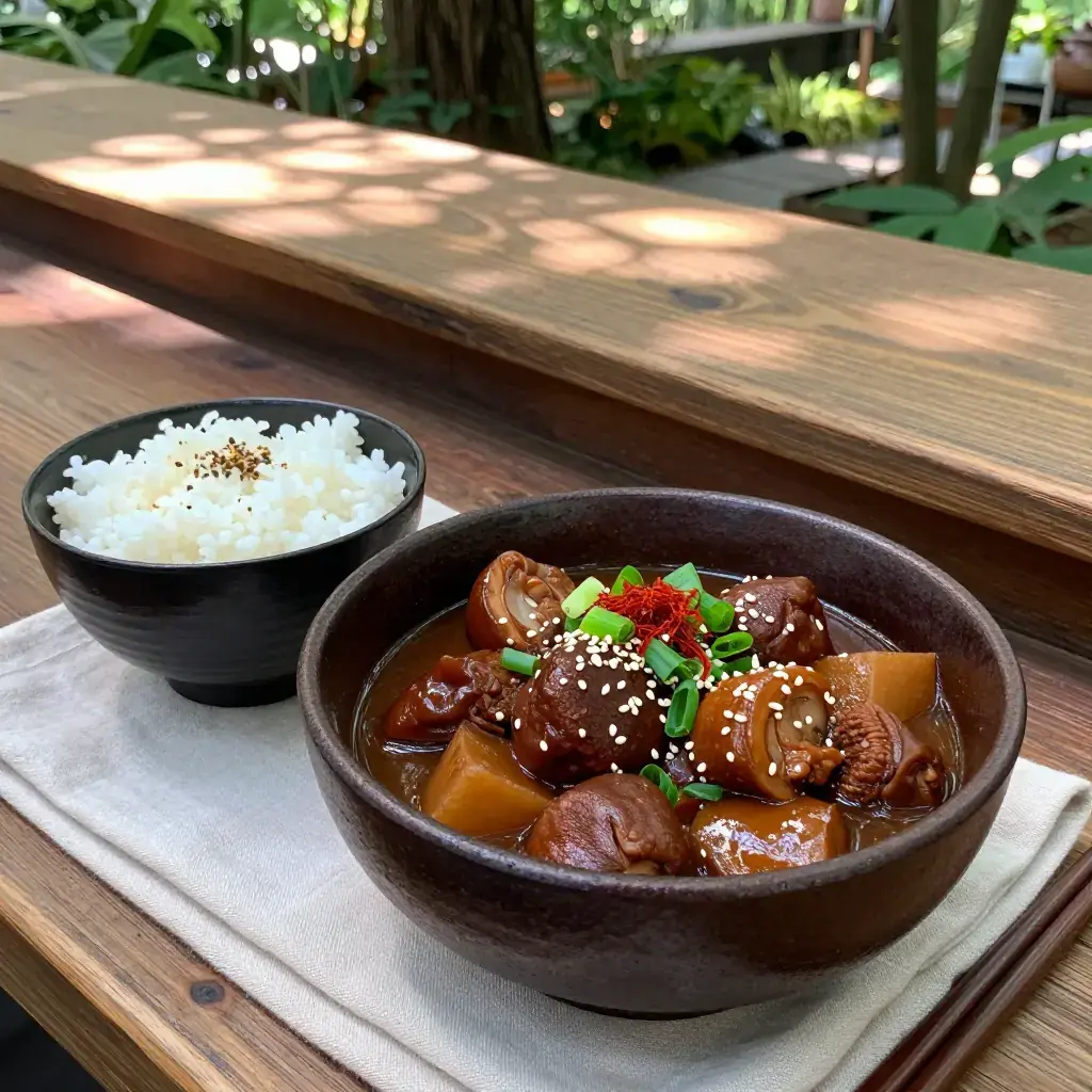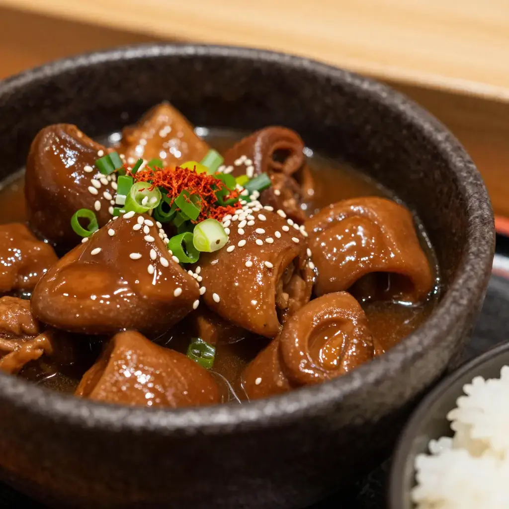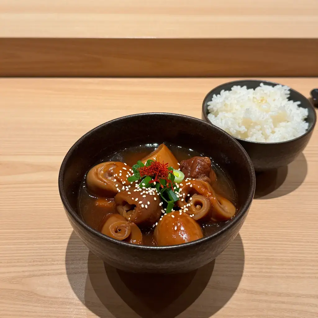 Motsuni is one of Japan's most beloved izakaya dishes — a deeply savoury, sticky braise of pork intestines and konnyaku that has fuelled working-class Japan since the Meiji era. Rooted in the "mottainai" (nothing wasted) philosophy that defines Japanese cuisine, motsuni transforms humble offal into something extraordinarily comforting through hours of patient braising in miso, sake, and mirin.