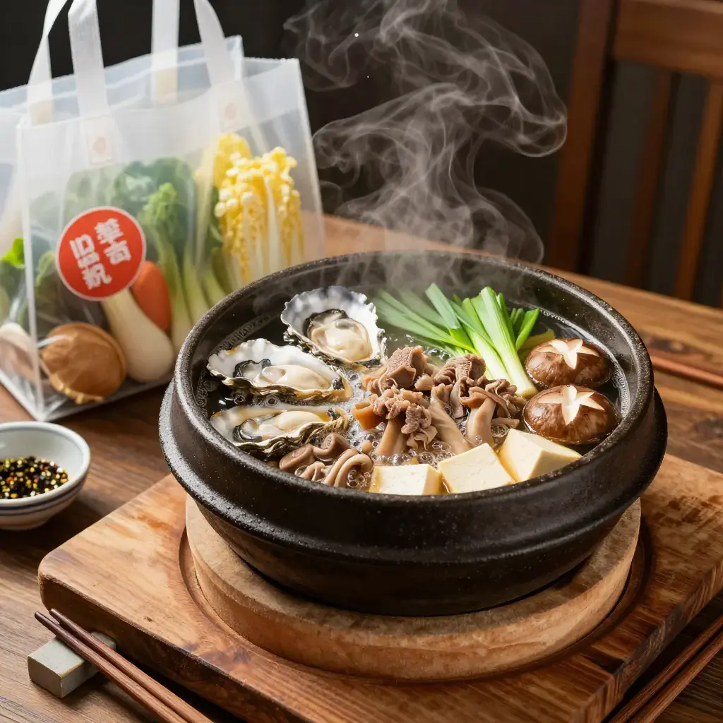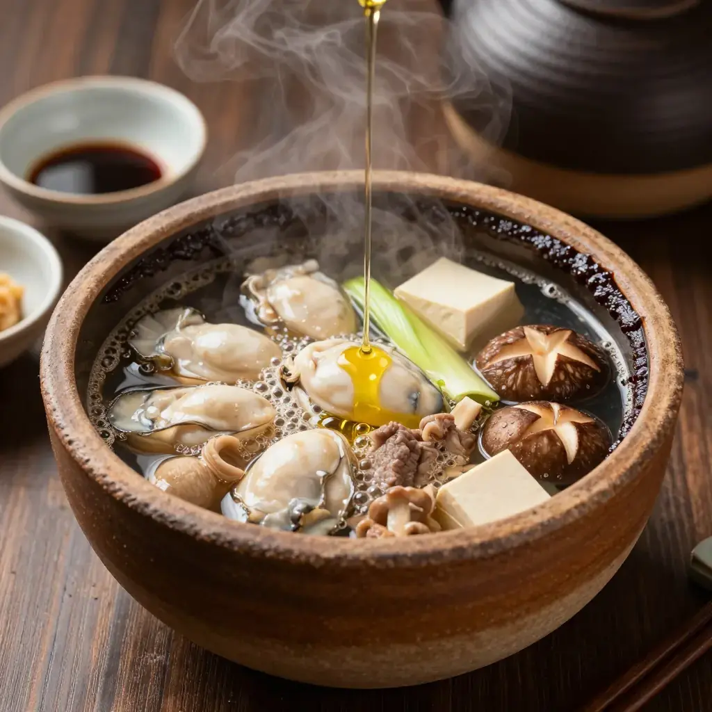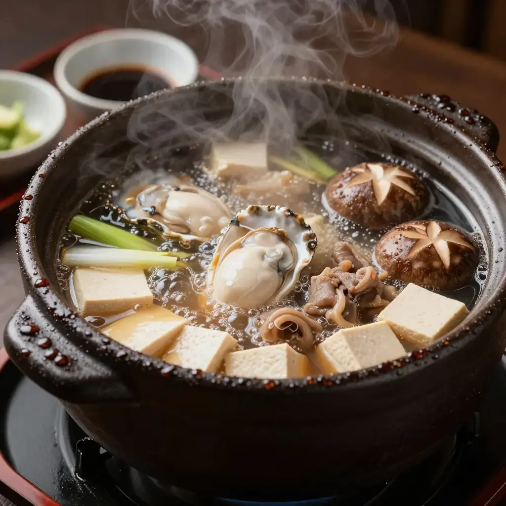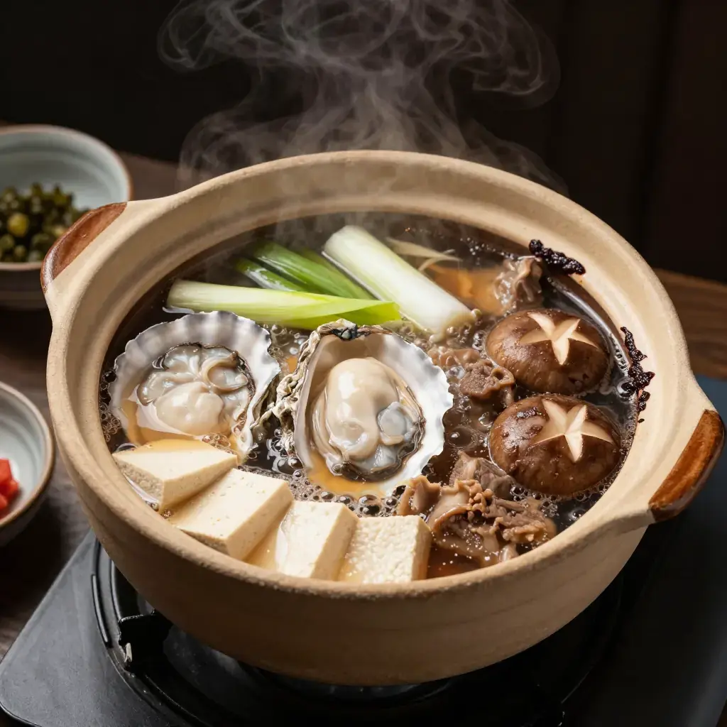 Dote-nabe is a winter hot pot unique to Osaka, where a thick wall ("dote") of red miso paste is built around the edge of the clay pot and slowly dissolved into the simmering broth as you eat. Dating to the Edo period, it is most closely associated with the oyster harvest in Hiroshima, and the addition of beef tendon or other offal makes it one of the most historically rooted and satisfying dishes in the Kansai culinary tradition.