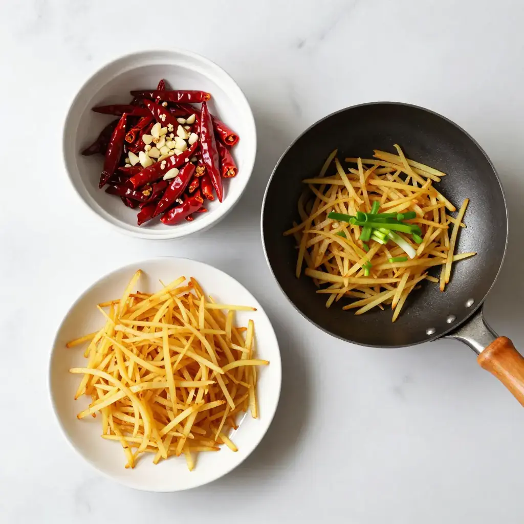 # Dongbei Chao Tu Dou Si A beloved vegetarian staple of northeastern China, this dish transforms humble potatoes into a crisp, tangy stir-fry seasoned with vinegar and dried chillies — proof that simplicity often produces the greatest satisfaction. Serves: 4 ## Ingredients - 600g (1.3 lb) starchy potatoes, peeled and julienned into matchsticks - 3 dried red chillies, torn - 4 cloves garlic, thinly sliced - 3 tbsp (45ml) rice vinegar - 1 tbsp (15ml) light soy sauce - 1 tsp (5ml) sesame oil - 2 tbsp (30ml) neutral oil - 1 tsp salt - 2 spring onions, sliced ## Instructions 1. Soak julienned potatoes in cold water for 10 minutes to remove excess starch; drain and pat dry thoroughly. 2. Heat a wok over high heat until smoking, add neutral oil, then dried chillies and garlic; stir-fry 30 seconds until fragrant. 3. Add potato shreds and toss vigorously over high heat for 3–4 minutes until barely tender but still crisp. 4. Pour in rice vinegar and soy sauce, toss for 1 minute more. 5. Remove from heat, drizzle with sesame oil, scatter spring onions, and serve immediately. **Cook's Notes:** The cold-water soak is essential — it prevents the potatoes going gluey and ensures they stay crisp. For extra heat add a pinch of chilli flakes with the garlic.Images
