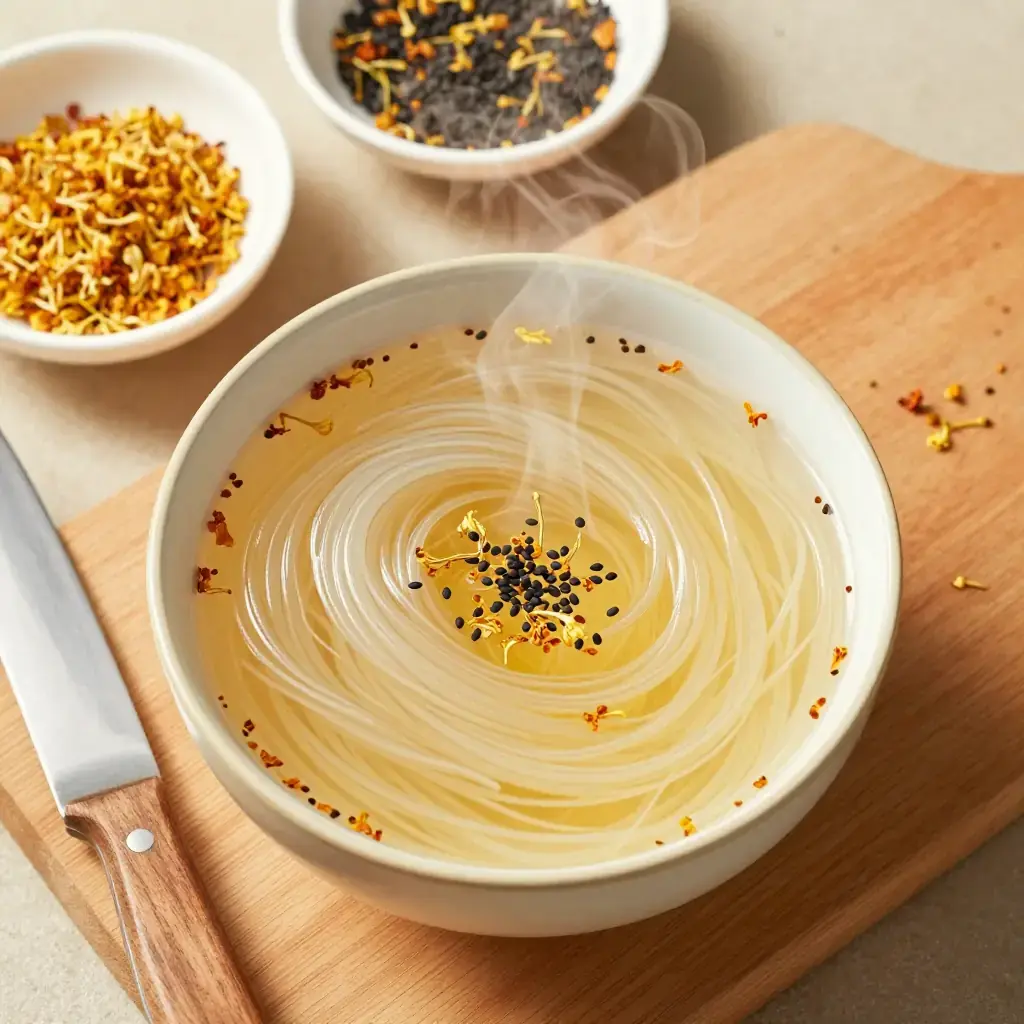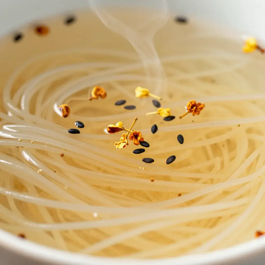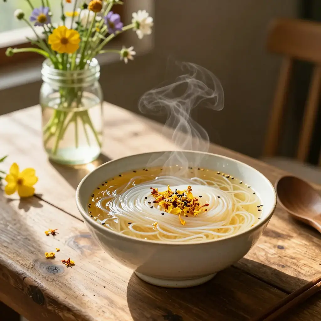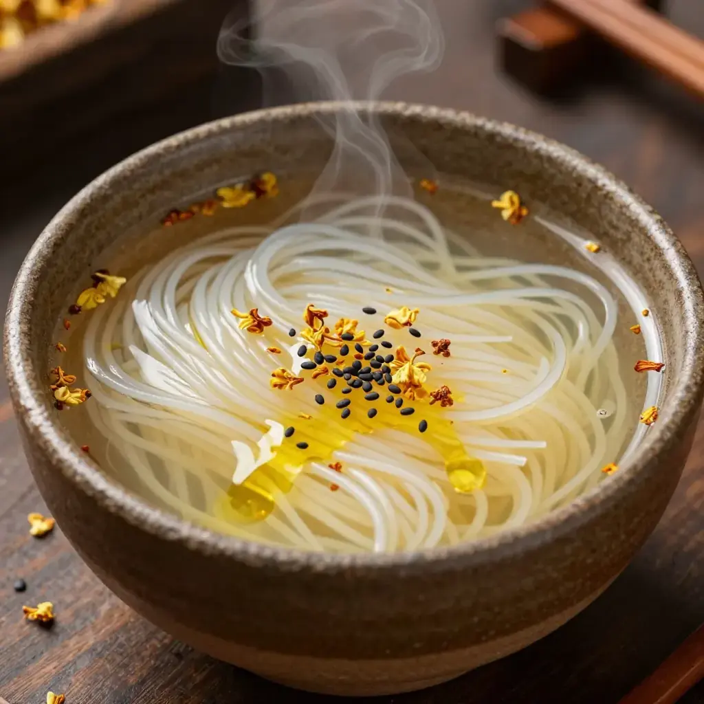 While Yunnan's rice noodles are famous in savoury broths, sweet rice noodle soups are a lesser-known local pleasure, enjoyed as a warming breakfast or dessert snack. This modern-fusion interpretation pairs the delicate perfume of dried osmanthus flowers with brown sugar and coconut milk for an aromatic bowl.