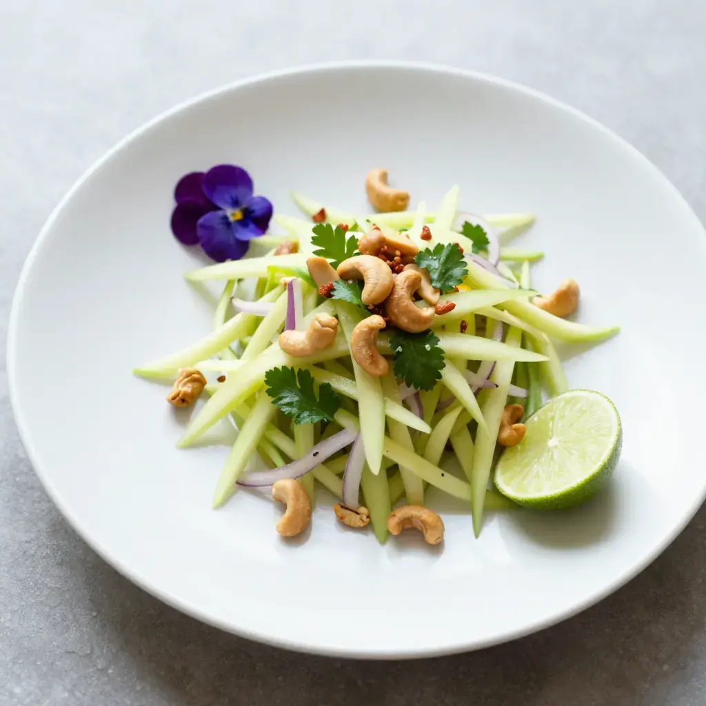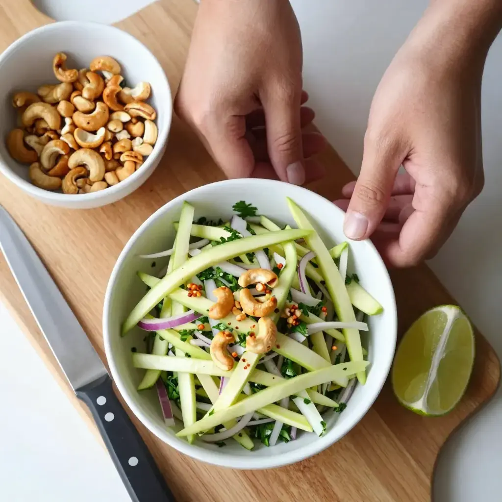 Cook's Notes: Green mango is firm and sour — it is not the same as an underripe eating mango. Look for it in Brazilian, Indian, or Southeast Asian grocery stores. The salad holds well for up to 2 hours refrigerated without the cashews.