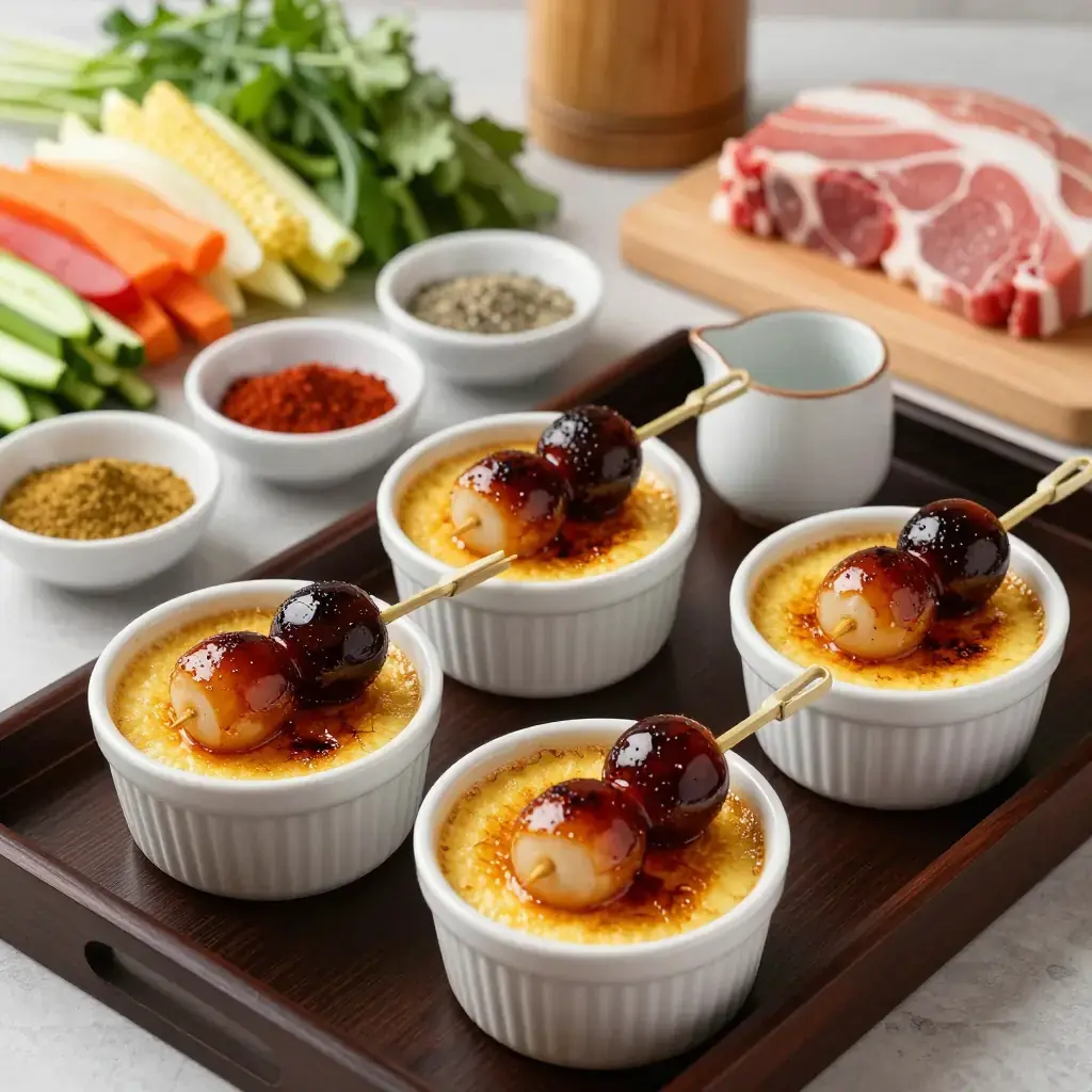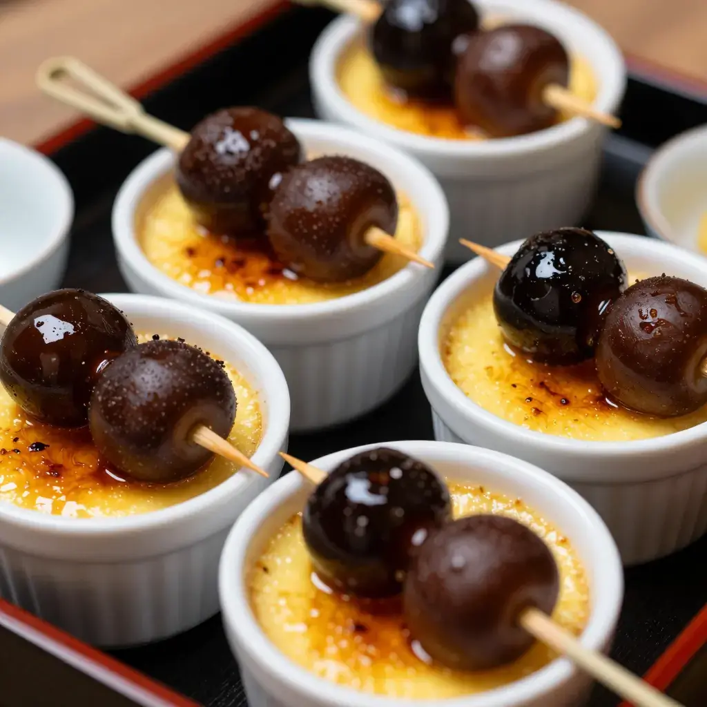 # Mitarashi Dango Crème Brûlée Mitarashi dango are traditional Japanese rice dumplings glazed with a sweet-salty soy sauce caramel, sold at festival stalls across Japan since the Heian period. This modern-fusion dessert captures those iconic flavours in a silky baked custard finished with a crackled sugar crust. Serves: 4 ## Ingredients ### Custard - 300ml (1 1/4 cups) heavy cream - 100ml (7 tbsp) whole milk - 4 egg yolks - 60g (5 tbsp) caster sugar - 2 tbsp (30ml) soy sauce - 1 tsp vanilla extract - 4 tsp caster sugar, for bruléeing ### Dango (makes 8 small dumplings) - 100g (3/4 cup) shiratamako (glutinous rice flour) - 80ml (5 tbsp) warm water - 2 tbsp (30ml) soy sauce - 1 tbsp (15ml) mirin - 1 tbsp (15g) sugar - 1 tsp cornstarch dissolved in 1 tsp water ## Instructions 1. Preheat oven to 150°C (300°F). Mix shiratamako and warm water to a smooth dough. Roll into 8 walnut-sized balls. Boil in salted water until they float, then cook 2 minutes more. Transfer to cold water, drain. 2. Combine soy sauce, mirin, sugar and cornstarch slurry in a small saucepan. Heat over medium, stirring, until thickened and glossy, about 3 minutes. Toss dango in the glaze. 3. Warm cream and milk together until just steaming. Whisk yolks, sugar, soy sauce and vanilla until smooth. Slowly pour warm cream into yolk mixture while whisking constantly. 4. Strain custard through a fine sieve into four 150ml (5 oz) ramekins. Arrange 2 glazed dango beside or atop each. Place ramekins in a deep baking tray, add boiling water to halfway up the sides. Bake 35-40 minutes until just set with a slight wobble. 5. Cool, then refrigerate at least 2 hours. Sprinkle 1 tsp sugar per ramekin and brûlée with a kitchen torch until amber and crackled. Serve immediately. **Cook's Notes:** The soy sauce adds umami depth without tasting savoury — do not skip it. If shiratamako is unavailable, mochiko works similarly. Custards can be prepared a day ahead up to the brûlée step.Images