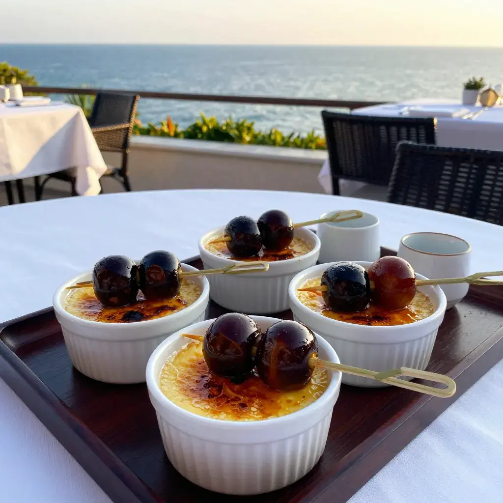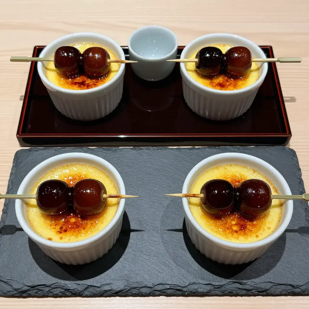 Cook's Notes: The soy sauce adds umami depth without tasting savoury — do not skip it. If shiratamako is unavailable, mochiko works similarly. Custards can be prepared a day ahead up to the brûlée step.