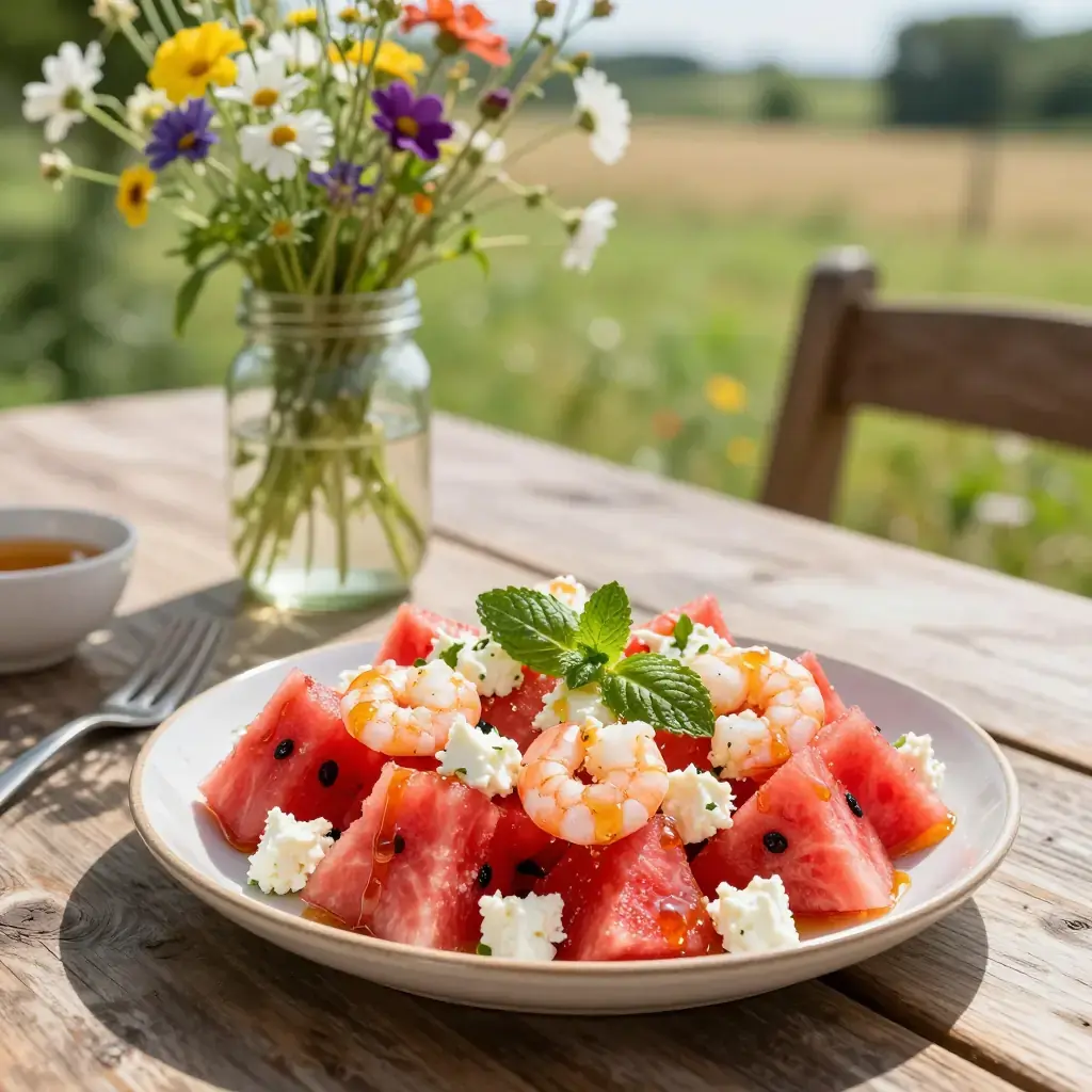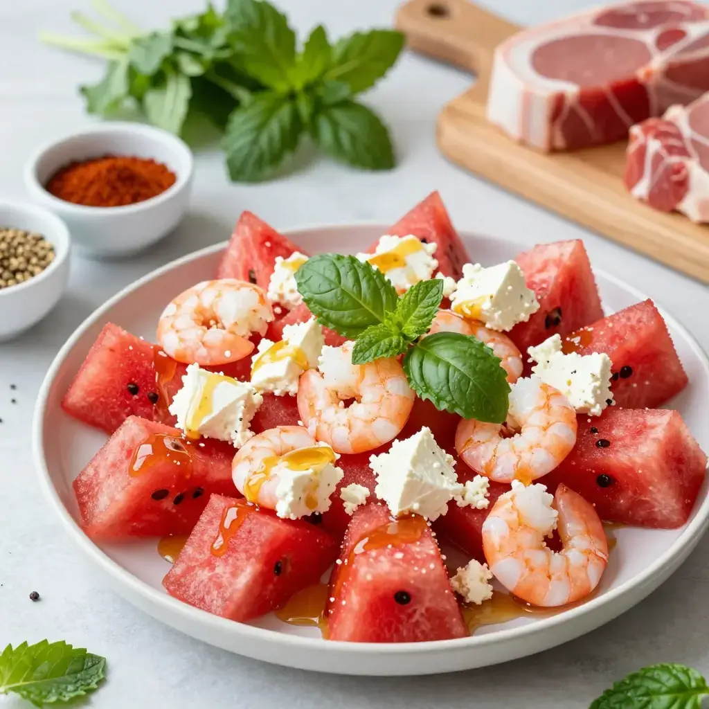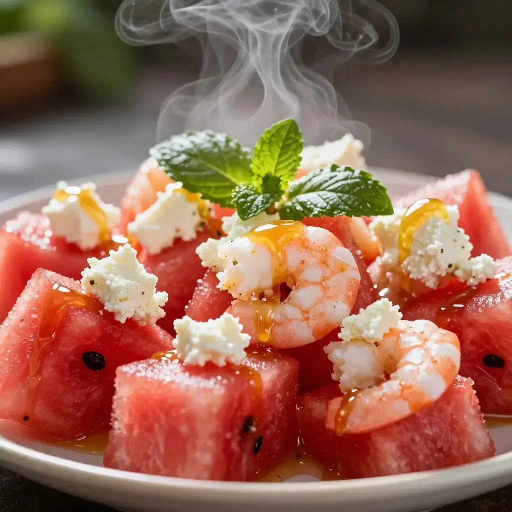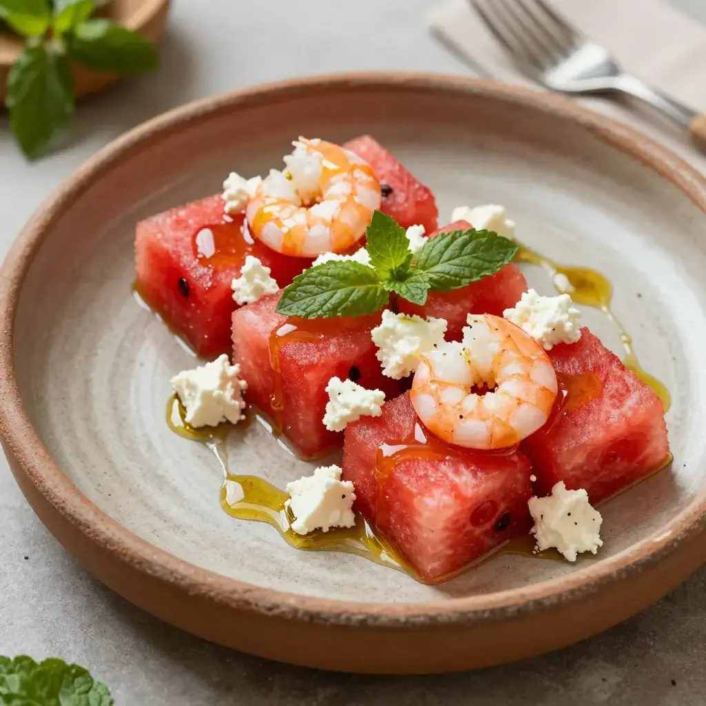 Across Tennessee and the Gulf States, the pairing of sweet summer watermelon and briny shrimp has deep roots in both Black Southern foodways and coastal fishing communities. This modern-fusion cold salad is served at farm-to-table restaurants from Nashville to Mobile, celebrating peak-summer produce with a dressing spiked by locally produced hot honey.