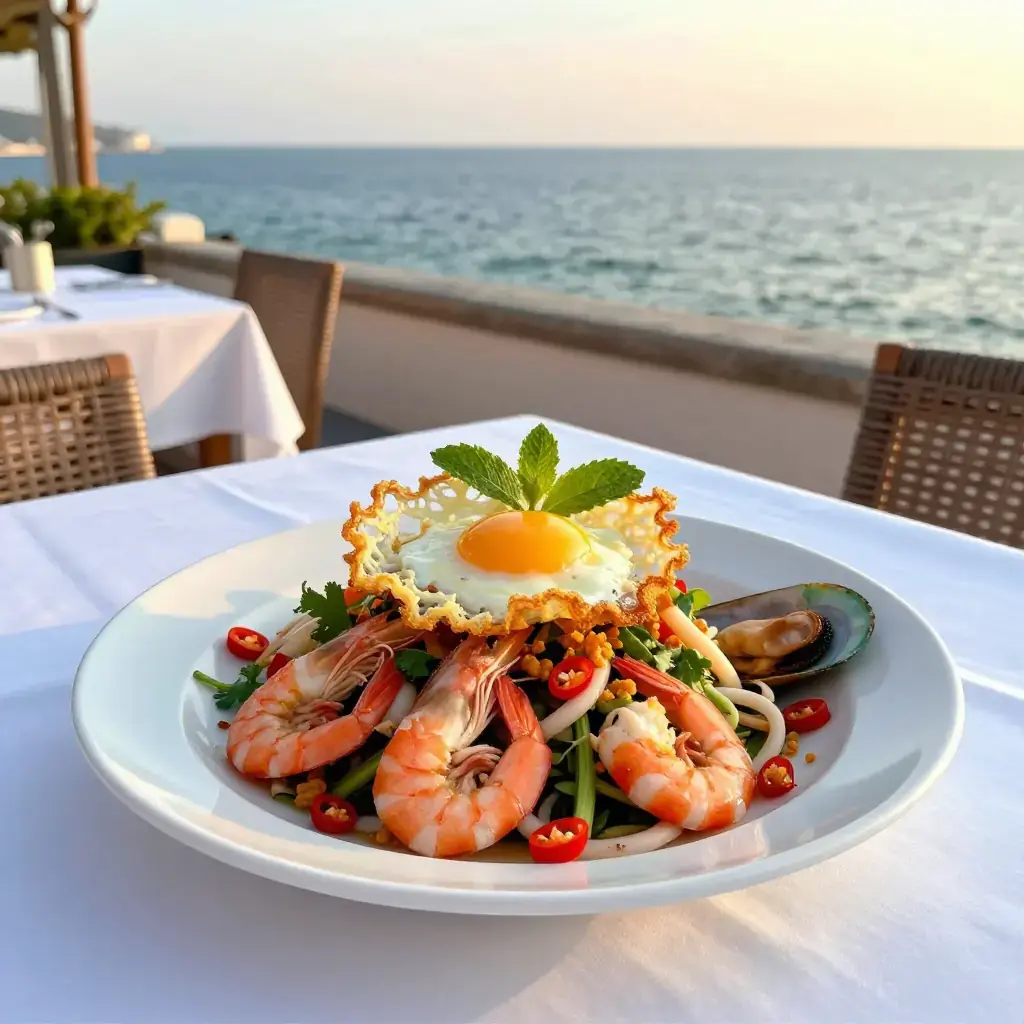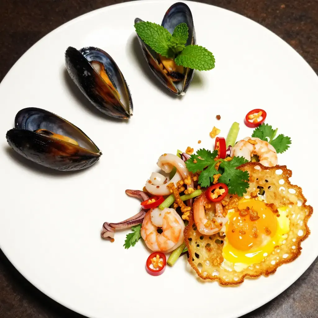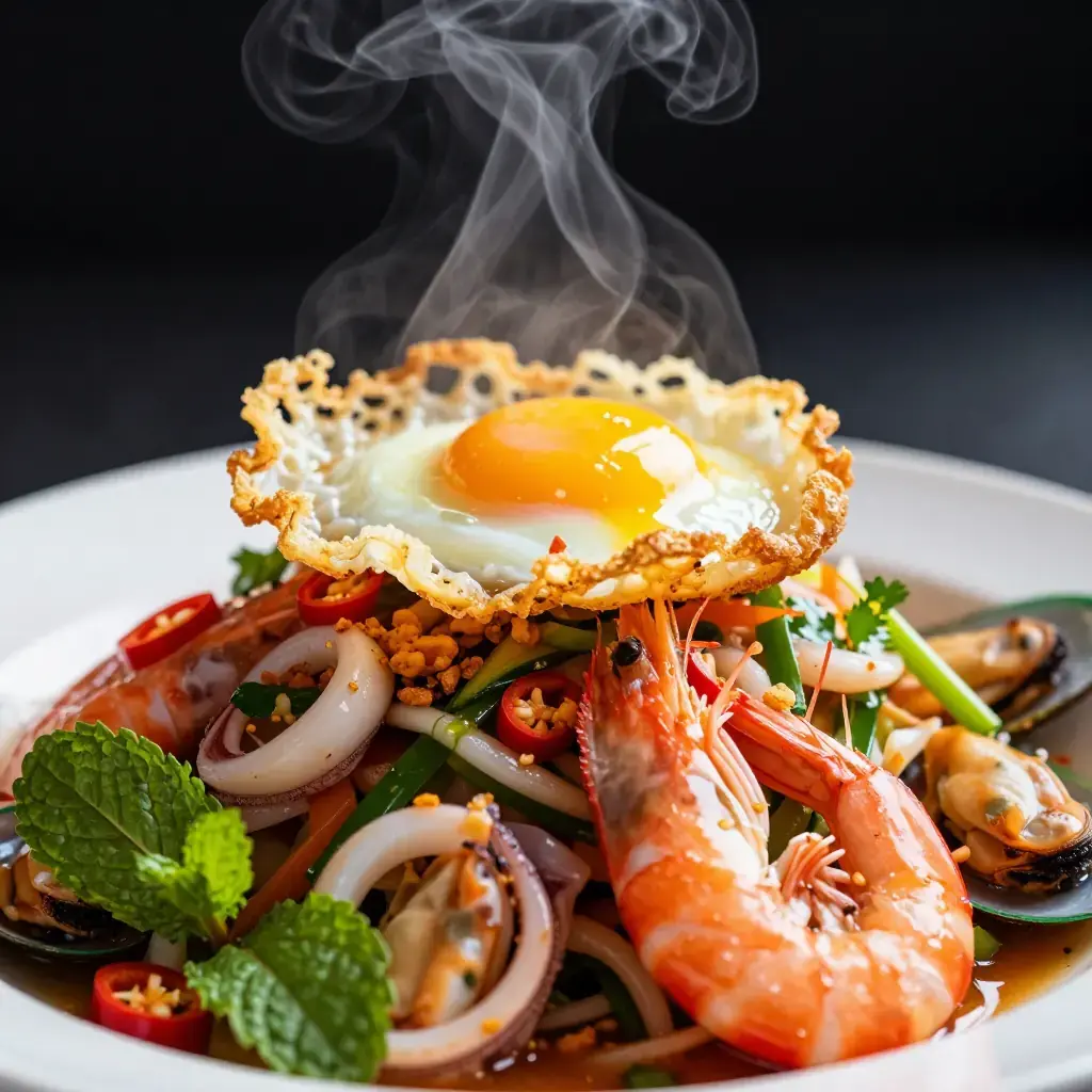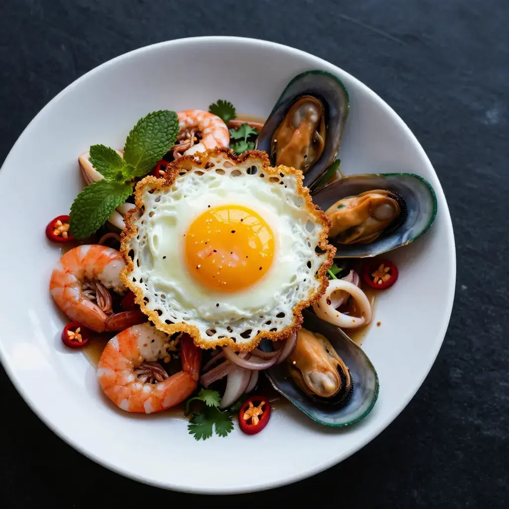 This vibrant Thai salad fuses the classic yam (tossed salad) tradition with modern plating sensibility — chilled mixed seafood tossed in a fiery lime-fish sauce dressing, crowned with a crispy fried egg. A Bangkok-style interpretation that brings together the four pillars of Thai flavour: sour, salty, spicy, and a touch of sweetness.