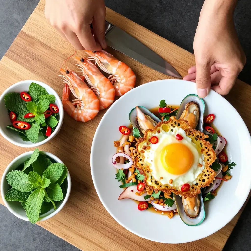 Cook's Notes: Chilling the seafood in ice water is non-negotiable — it stops cooking instantly and keeps the texture firm. Kaffir lime leaves must be sliced very finely or they become tough and unpleasant to eat. The crispy egg is not traditional but is a beloved Bangkok street food addition.